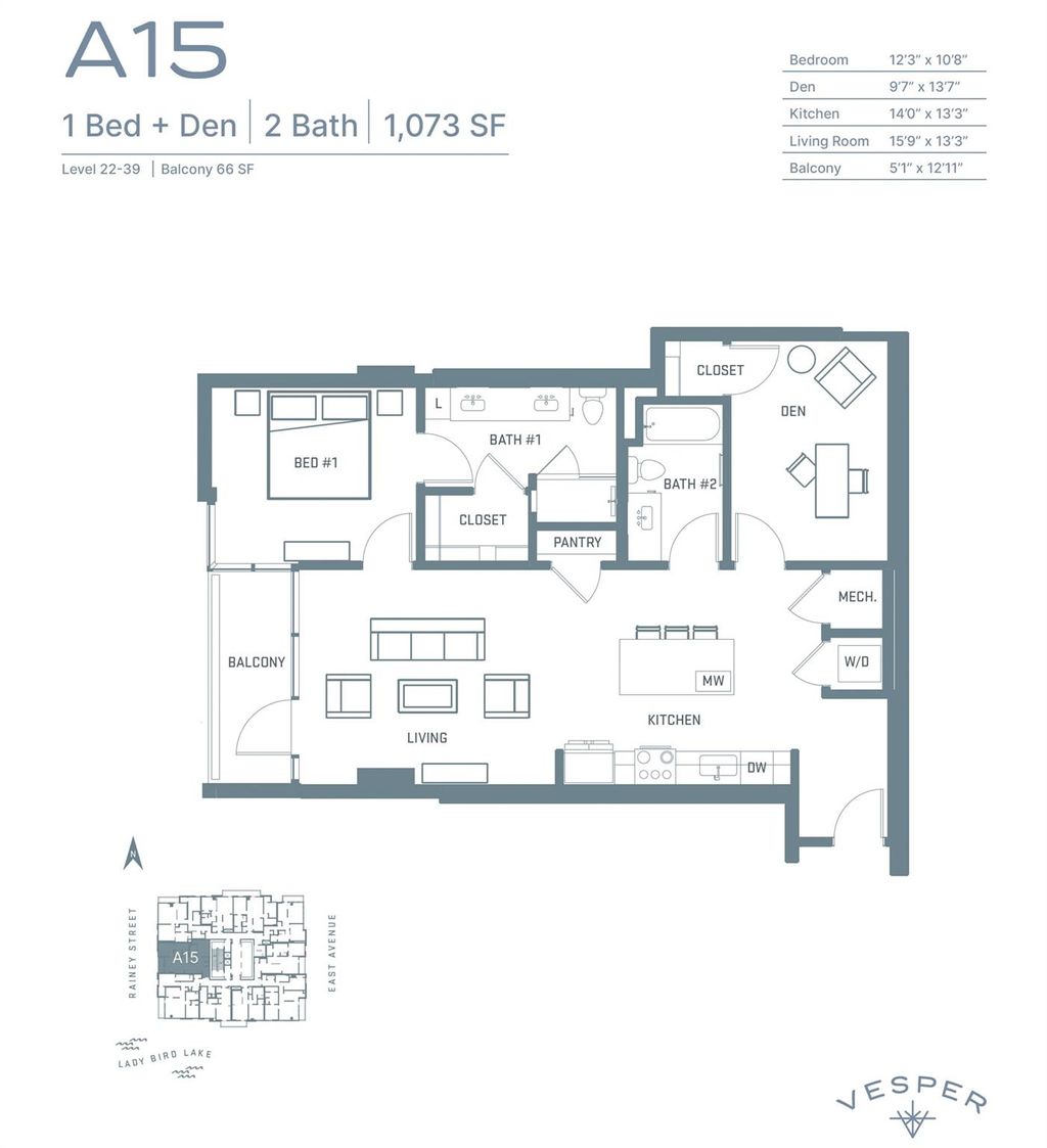 End-of-year pricing available for contracts executed through December 31. Vesper is a luxury condominium community in downtown Austin, offering design-forward residences with high-end finishes and exceptional amenities. Located steps from Rainey Street and Lady Bird Lake, the condos at Vesper provide direct access to Austin's top dining, nightlife, and outdoor spaces. Unit 2410 features western-facing views overlooking downtown Austin, Lady Bird Lake and Congress & Lamar bridges and offers a one-bedroom plus den layout with 1,073 interior square feet, complemented by a private balcony capturing skyline sunsets. Designed in the Desert Calm finish palette, the residence includes floor-to-ceiling windows, high ceilings, and an open-concept layout that maximizes natural light. The kitchen features Italian cabinetry, terrazzo quartz countertops, and Bosch appliances, while spa-inspired bathrooms offer frameless glass showers and designer fixtures. Residents enjoy 24-hour concierge service, a rooftop lounge, resort-style pool, state-of-the-art fitness center, and private co-working spaces. Vesper's prime downtown location ensures convenience, whether you're exploring Rainey Street, enjoying Lady Bird Lake trails, or experiencing the best of Austin living. Contact us today for pricing and availability or to schedule a private tour.