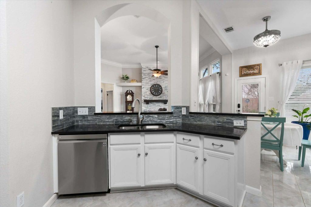 Welcome to this beautifully updated Round Rock home where thoughtful upgrades, quality finishes, and major system replacements create a true move-in ready opportunity. Extensive renovations span from 2021 through 2025, offering peace of mind and modern comfort throughout. The interior showcases water resistant and sound absorbing engineered hardwood flooring and porcelain tile, paired with updated light fixtures inside and out, fresh interior paint, and upgraded door and hinge hardware. The kitchen has been fully refreshed with updated countertops, backsplash, stainless steel sink, faucet, garbage disposal, and stainless steel LG appliances. Bathrooms have been upgraded, including new toilets, fixtures, and a new glass shower door in the primary bath. Major improvements include all new windows replaced in phases, new front and back Hardie plank siding, updated back door, and a fully upgraded fireplace with new stone, glass, and mantle. A full Ring security system with four cameras provides 24/7 monitoring. Recent BIG-ticket updates truly set this home apart. The water heater and water softener were replaced, a new energy-efficient roof was installed with a solar heat extractor, and a new kitchen skylight was added. Leaf filter gutter guards are installed around the entire home, and a sprinkler system was added to enhance the yard. The backyard also features a custom storage shed, while the garage is equipped with a full set of steel overhead storage racks. With numerous high-value updates already completed, this home offers both style and long-term reliability in a well-established Round Rock location close to shopping, dining, and major roadways. A rare opportunity to own a meticulously maintained property where the work has already been done.