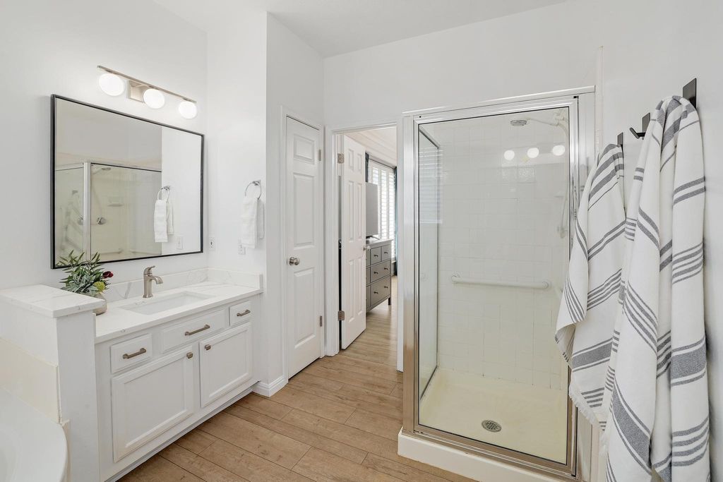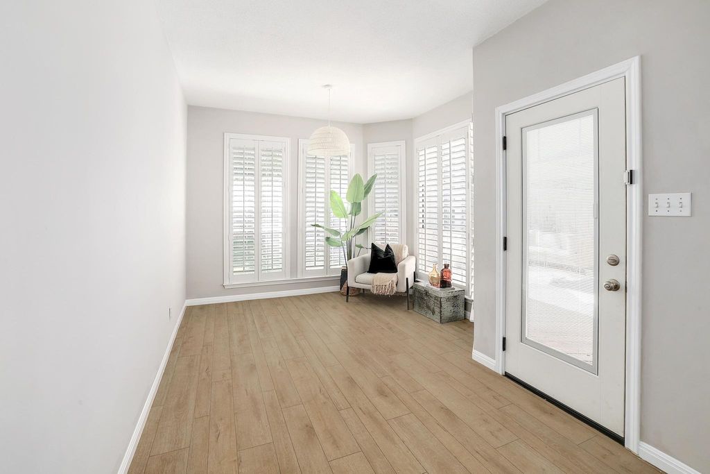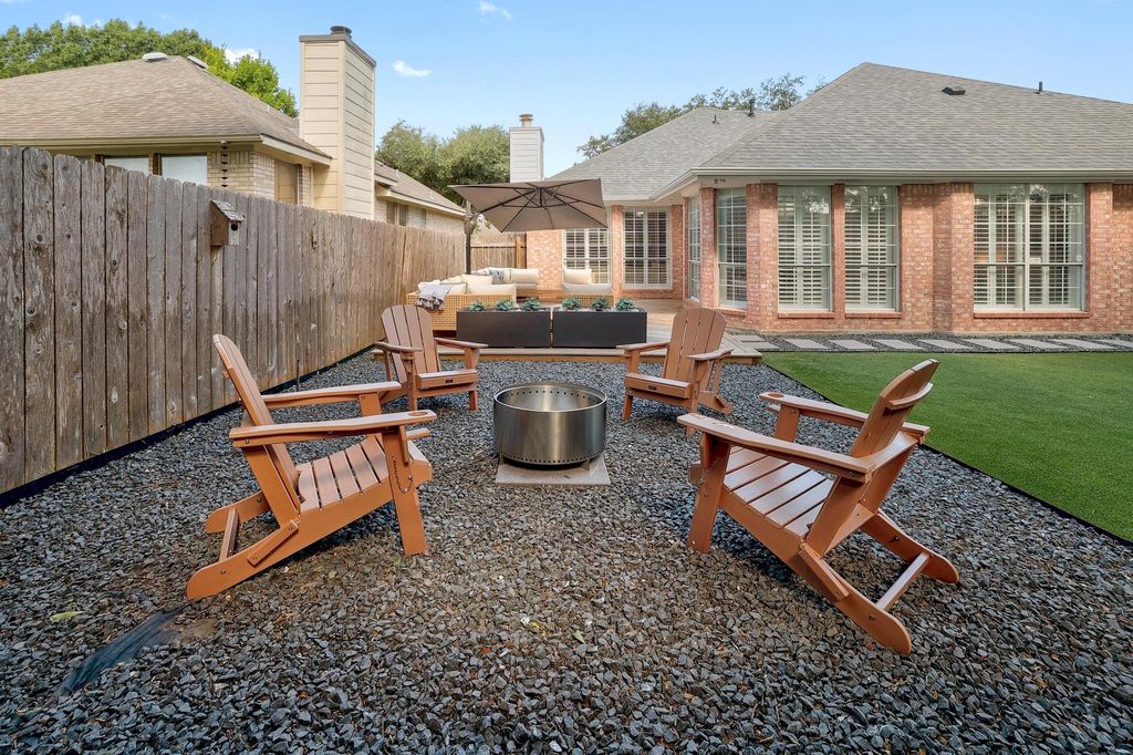 Welcome to a stunning single-story home that has been radically transformed from its original condition into a stylish, move-in-ready retreat. Every detail has been thoughtfully updated to elevate both form and function, creating a home that feels brand new. Inside, luxury vinyl plank flooring flows seamlessly throughout the entire home, adding modern elegance and durability. The kitchen has been completely refreshed with refinished cabinetry, updated hardware, quartz countertops, a striking marble backsplash, and upgraded fixtures. The transformation continues in the bathrooms, where matching quartz counters, new sinks, and contemporary fixtures create a spa-like feel. Crown molding in the formal dining room and primary suite adds a touch of sophistication, while walk-in closets in both the primary and guest bedrooms offer generous storage. The living area is anchored by a cozy gas fireplace that opens to the kitchen and dining area. Plantation shutters throughout enhance privacy and style. The exterior has also been reimagined, with a new roof, freshly painted trim and garage doors, and a truly impressive backyard renovation. Enjoy a low-maintenance oasis with professionally installed artificial turf and a spacious ground-level deck surrounded by xeriscaping"”ideal for relaxing or entertaining. Additional features include a Ring security system and full sprinkler system. Located in a quiet, established neighborhood with no rear neighbors, this home is a rare find"”fully upgraded, thoughtfully redesigned, and ready for its next chapter.