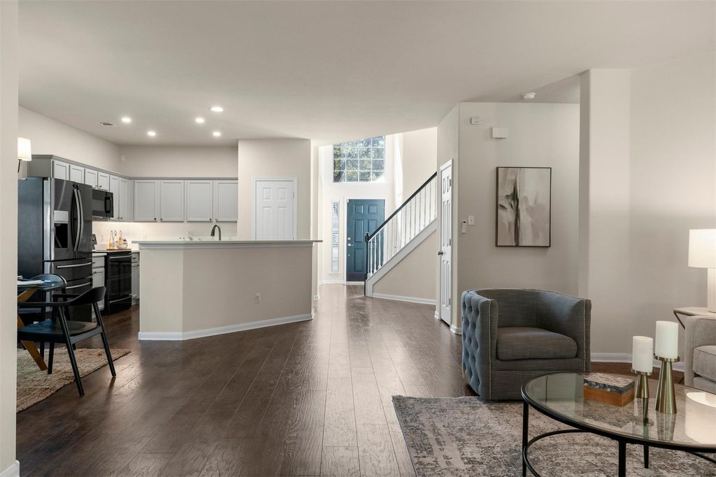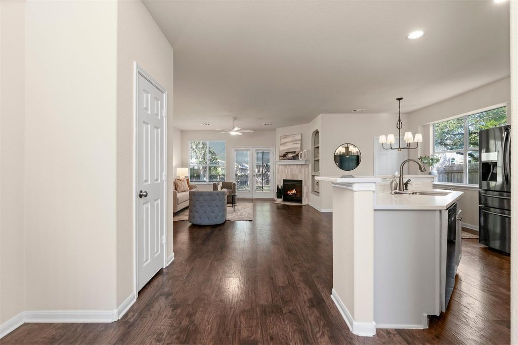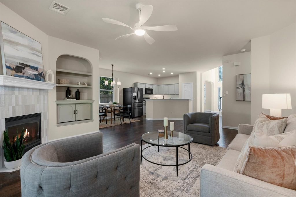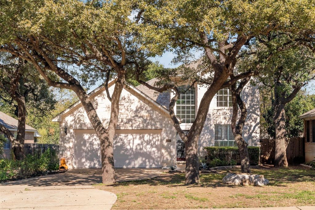 Homes in the Village at Western Oaks don't last long, and this one makes it clear why. Everything here feels dialed in; updated, move-in ready, and right in the middle of one of Southwest Austin's most convenient spots. The two-story entry makes a strong first impression. Off to one side, a flexible front room works perfectly as a home office or formal dining. Wood flooring runs through the main areas, paired with neutral-toned walls that keep the whole house feeling light and balanced. The kitchen has been remodeled with care with quartz countertops, shaker style cabinets, a large island with bar seating, and slate stainless appliances. It connects seamlessly to the living area, where natural light fills the room and windows frame the private backyard. The fireplace adds the right touch of warmth and character. The main-floor primary suite feels private and quiet, complete with a soaking tub, separate shower, dual vanity, and a walk-in closet. Upstairs, a generous game room connects the secondary bedrooms and adds another relaxed hangout space. The backyard has just the right setup with an extended patio, perfect for outdoor meals, a grassy area for pets or play, and mature oaks that cast shade where you need it. Walk to Mills Elementary, or grab coffee, dinner, or groceries just minutes from home. With easy access to Mopac, 290, and 45, downtown Austin is a quick drive away. Updated, cared for, and move-in ready; this is Southwest Austin living at its best.
