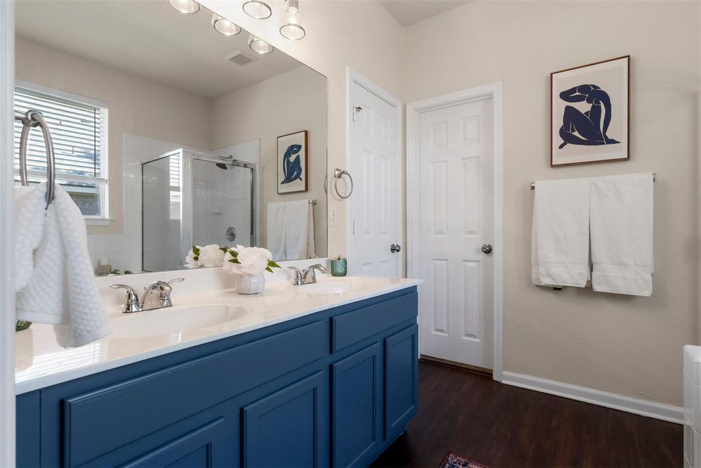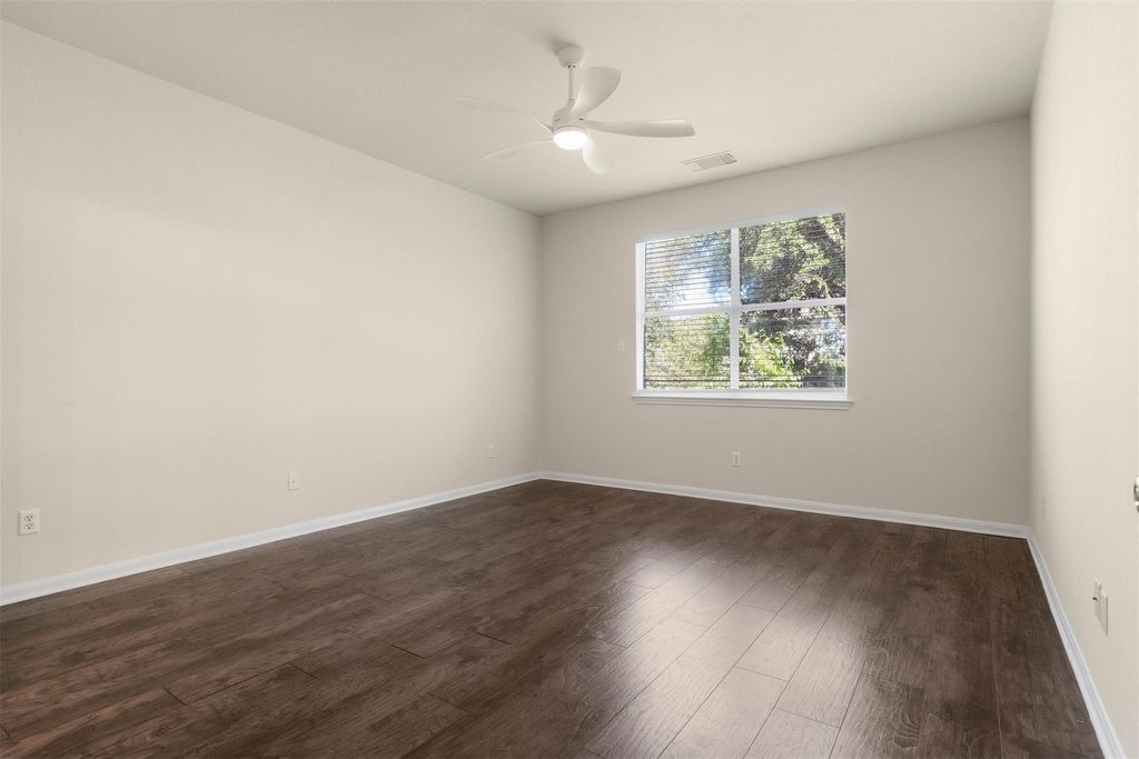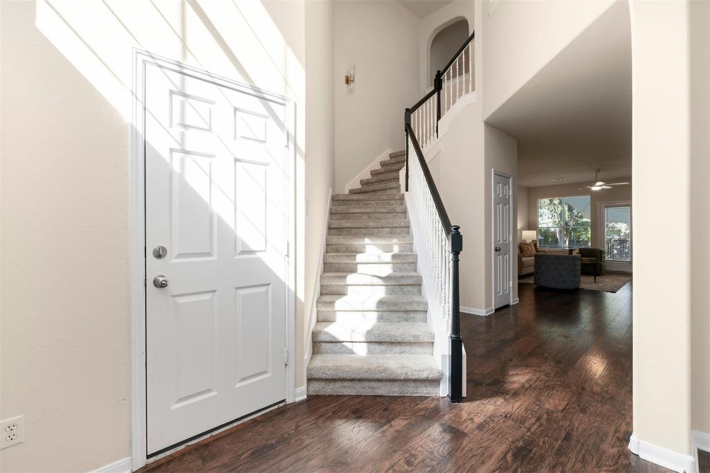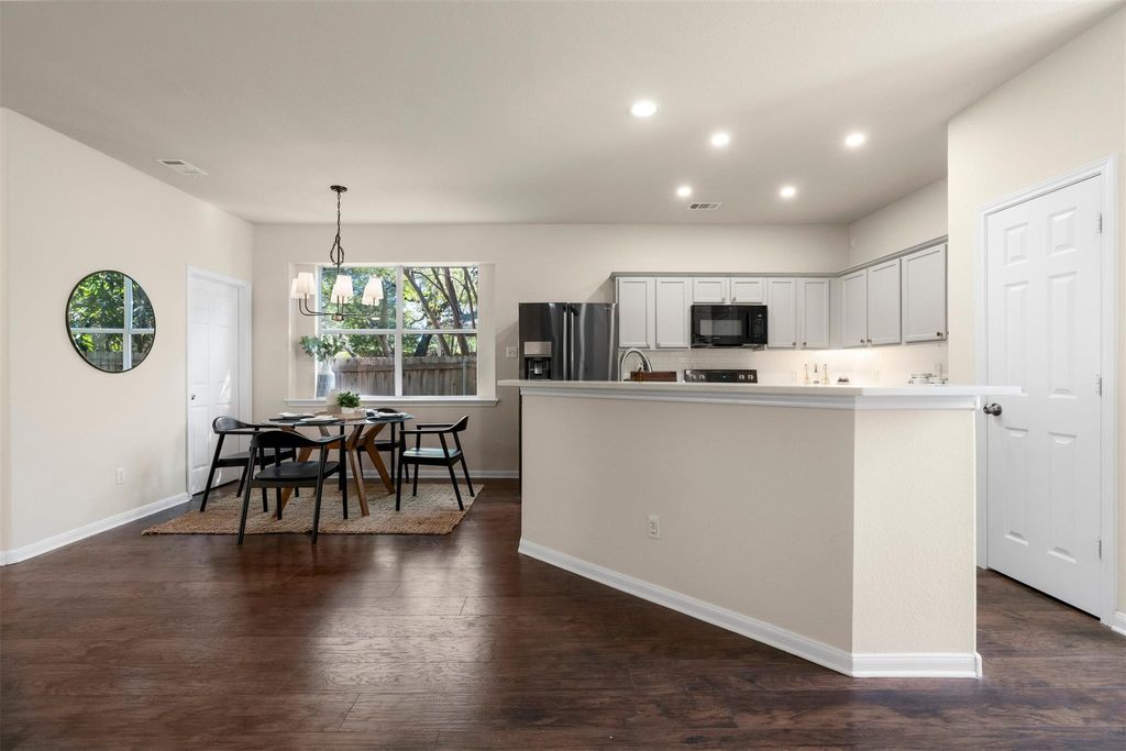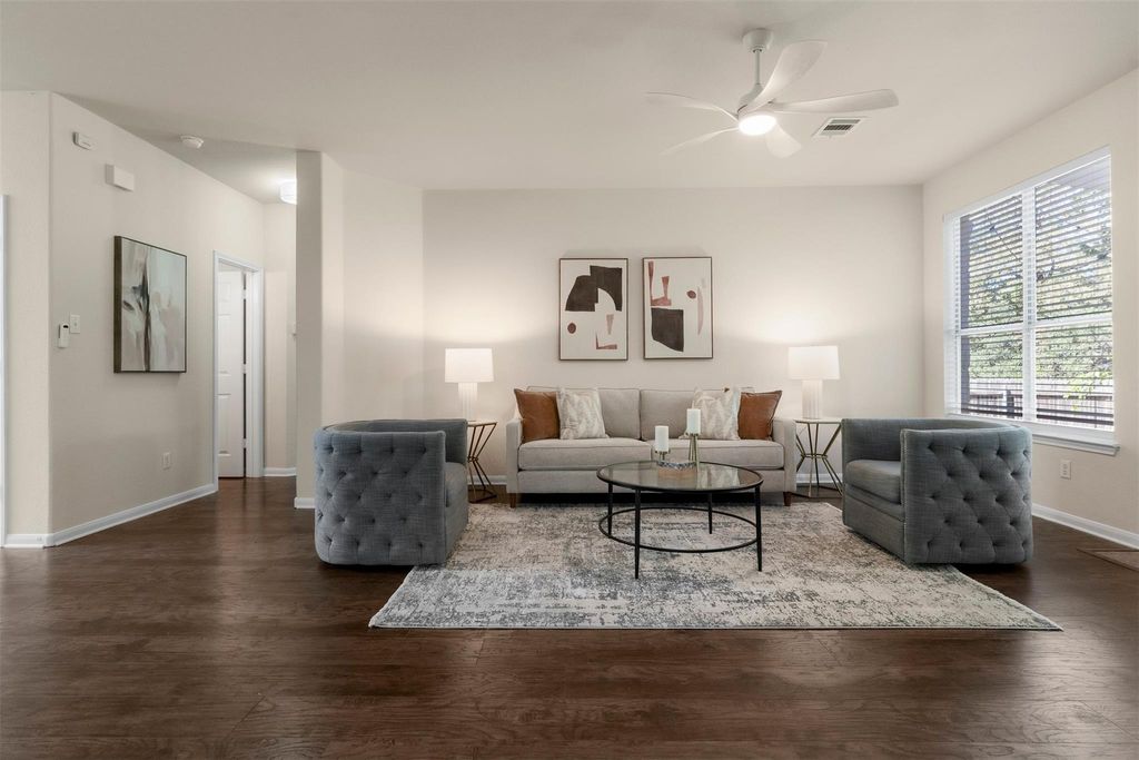 Homes in the Village at Western Oaks don't last long, and this one makes it clear why. Everything here feels dialed in; updated, move-in ready, and right in the middle of one of Southwest Austin's most convenient spots. The two-story entry makes a strong first impression. Off to one side, a flexible front room works perfectly as a home office or formal dining. Wood flooring runs through the main areas, paired with neutral-toned walls that keep the whole house feeling light and balanced. The kitchen has been remodeled with care with quartz countertops, shaker style cabinets, a large island with bar seating, and slate stainless appliances. It connects seamlessly to the living area, where natural light fills the room and windows frame the private backyard. The fireplace adds the right touch of warmth and character. The main-floor primary suite feels private and quiet, complete with a soaking tub, separate shower, dual vanity, and a walk-in closet. Upstairs, a generous game room connects the secondary bedrooms and adds another relaxed hangout space. The backyard has just the right setup with an extended patio, perfect for outdoor meals, a grassy area for pets or play, and mature oaks that cast shade where you need it. Walk to Mills Elementary, or grab coffee, dinner, or groceries just minutes from home. With easy access to Mopac, 290, and 45, downtown Austin is a quick drive away. Updated, cared for, and move-in ready; this is Southwest Austin living at its best.