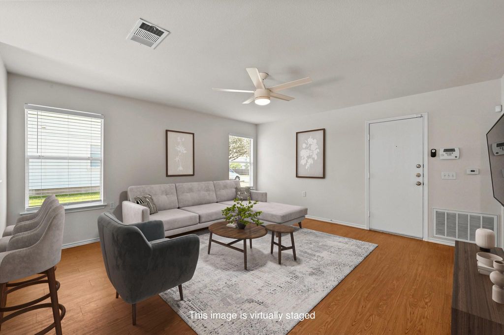Charming and move-in ready, this single-story South Austin home combines thoughtful updates with a walkable location near some of the city's best-loved spots. Just a few blocks away, the lively St. Elmo Arts District offers a unique mix of creative art, dining, craft drinks, local breweries, and community gatherings that capture the heart and soul of the city. The home welcomes you with cute curb appeal, a recently painted exterior, and a cozy covered front porch. Inside, you'll find an open-concept layout with fresh interior paint, new carpet in the bedrooms, laminate flooring in the main living areas, and modern touches like updated lighting and door hardware. The kitchen includes an updated dishwasher and cabinet pulls, while the spacious primary suite features a walk-in closet and full bath. Step outside to a spacious, fenced backyard with a paver patio and mature trees behind the lot that form a natural screen, providing an extremely private setting. Additional highlights include a 1.5-car garage, a new roof in 2024, and a recently replaced A/C condenser (2023). Located less than 5 miles from Lady Bird Lake and downtown, 9 miles from ABIA, and close to restaurants, bars, South Congress, and major highways, this home offers easy access to everything that makes South Austin so desirable. Don't miss your chance to own a beautifully updated home in a fast-growing pocket of South Austin!