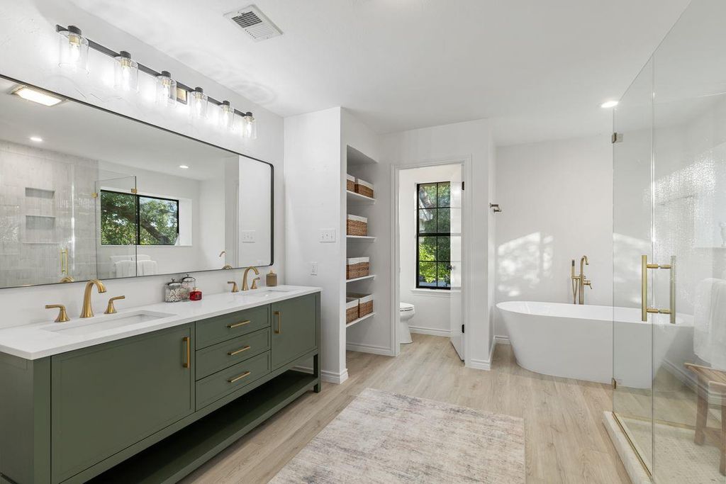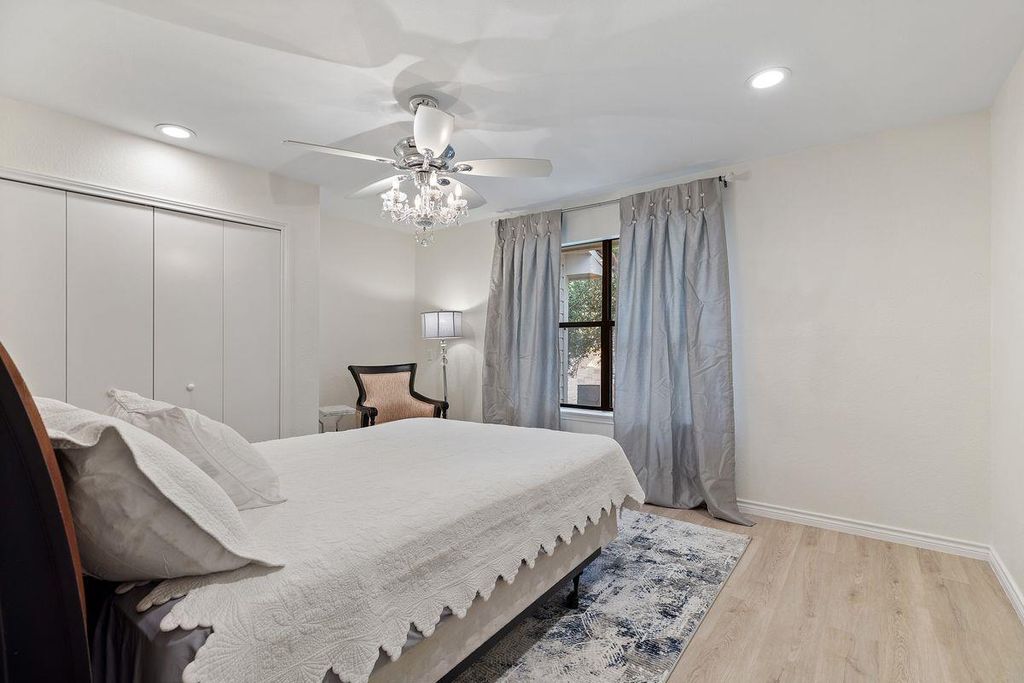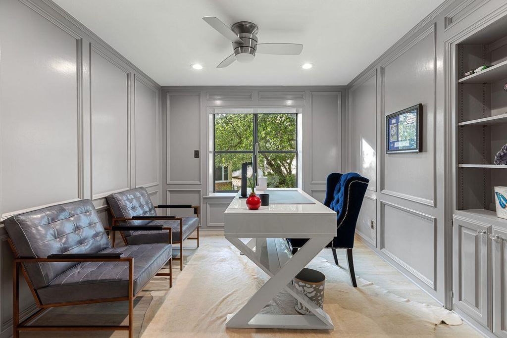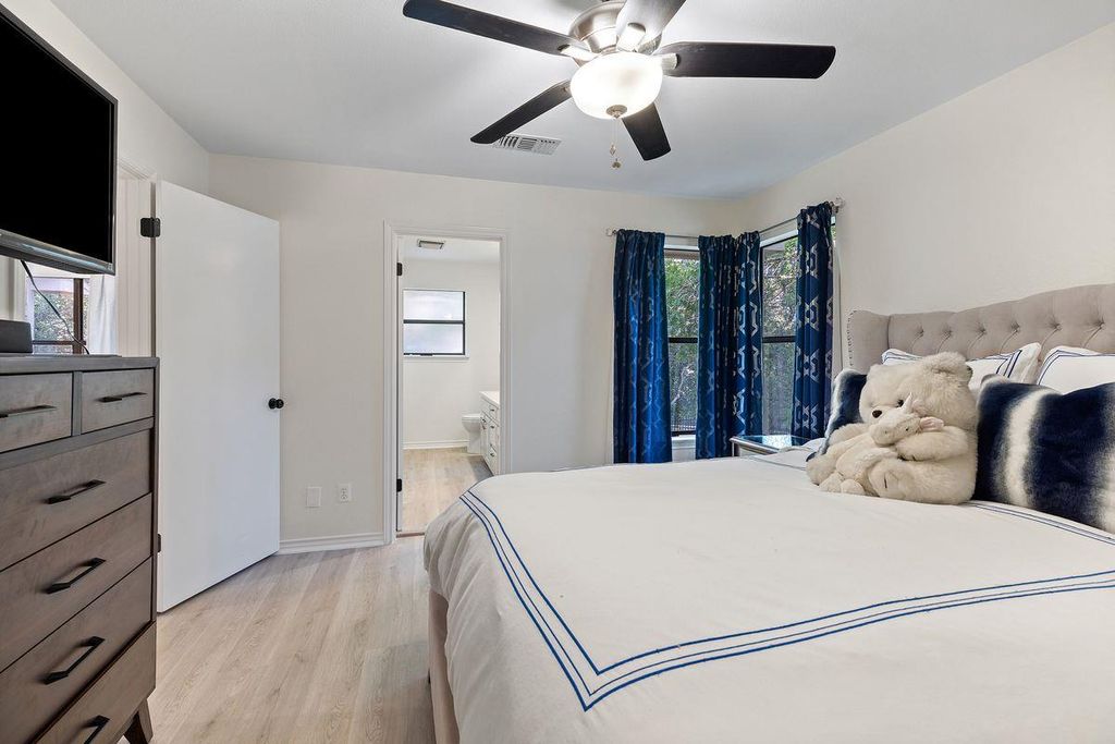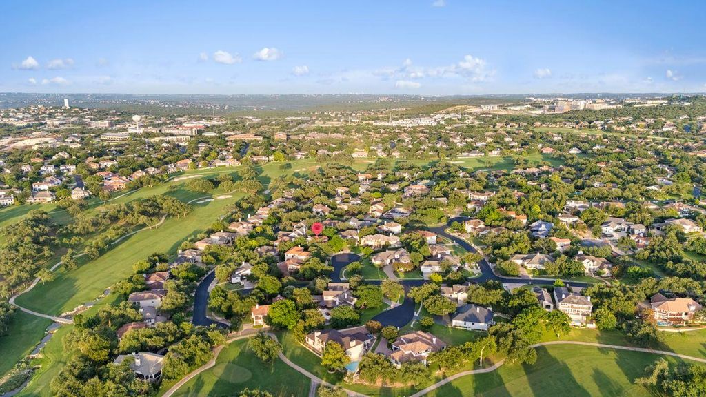 Welcome to 5 Valhalla Court, a beautifully remodeled residence tucked at the end of a quiet cul-de-sac in the gated golf community of The Hills. This updated 3-bedroom, 2.5-bath home with a dedicated office offers 2,500 square feet of refined living space on a lot surrounded by mature oaks and lush landscaping. The home features wide-plank flooring, a spacious layout, and custom built-ins in both the living room and office. The living and dining areas are bright and inviting"”ideal for entertaining"”with a striking stone fireplace, a dry bar with cabinetry, and access to a covered deck for seamless indoor-outdoor living. The kitchen, complete with a walk-in pantry and breakfast area, flows effortlessly to an expansive patio and shaded backyard"”perfect for outdoor gatherings or relaxing under the trees. The primary suite offers high ceilings with a statement chandelier, a private covered pergola deck with a bed swing, and a spa-like bath with a walk-in shower, soaking tub, and elegant finishes. Multiple outdoor living areas, natural shade, and flexible interior spaces make this home ideal for both everyday comfort and stylish entertaining. Located within Lake Travis ISD, residents enjoy a social membership to The Hills and Flintrock Falls Country Clubs. Just minutes from Lake Travis, the Hill Country Galleria, and top-tier shopping and dining. Ample storage throughout, including a spacious garage and separate laundry room. Neighborhood amenities include gated access, scenic trails, tennis courts, golf, fitness facilities, and 24/7 security.