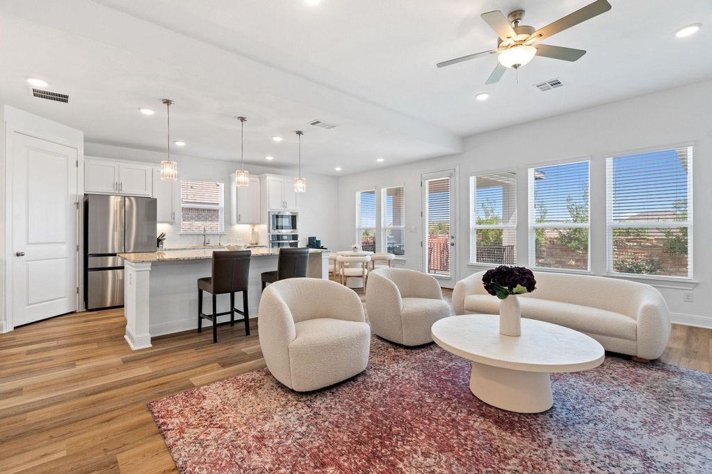 This stunning single-story contemporary home in the desirable Sweetwater subdivision of Lakeway offers the perfect blend of style, functionality, and convenience. As you enter, you'll be greeted by a warm entrance foyer. With its wide open concept design, expansive living area featuring a warm fireplace, and multiple dining areas, this home is perfect for entertaining and everyday living. The sun-kissed dining area offers peaceful backyard views and is conveniently located adjacent to the kitchen. The kitchen is beautifully appointed with a center island/breakfast bar, granite countertops, stainless steel appliances, and a pantry, providing ample space for culinary creativity. Elegant light fixtures and a stylish subway tile backsplash throughout add a touch of sophistication. Laminate flooring throughout the common areas adds warmth and elegance. The charming primary suite boasts a high tray ceiling and an en-suite bath, providing a serene retreat. The en-suite bathroom features dual vanities, a stunning walk-in shower, and a spacious walk-in closet. The secondary bedrooms are both nice-sized, each with a walk-in closet, offering ample storage and comfort. Enjoy peaceful mornings on the covered east-facing patio, surrounded by lush landscaping and no back neighbors. The fully fenced backyard provides a safe and serene outdoor space, perfect for relaxation or entertainment. This home is conveniently located near resort-style amenities, including swimming pools, a splash pad, a pavilion, a clubhouse, sports courts, playground, park, trails, and more. With access to the highly-rated Lake Travis ISD and like-new condition, this turnkey home is full of character. The owner's furniture is also available for purchase, making it easy to make this house your home.