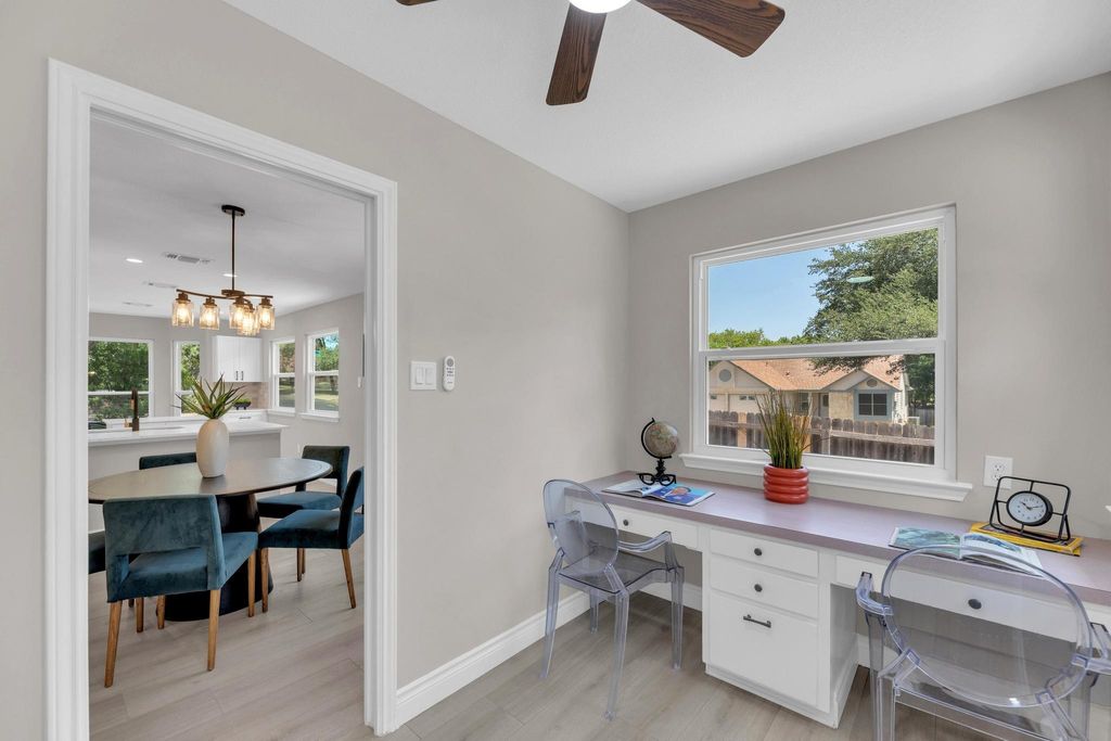 Welcome to 12711 Theriot Trail - North Austin Living at Its Finest! This impeccably renovated 3-bed, 2.5-bath, 1,777 sq ft home sits on a spacious corner lot in the desirable Milwood neighborhood, zoned to top-rated Westwood High School (RRISD). From its stone exterior and lush landscaping to soaring ceilings and open floor plan, every detail is designed for modern comfort while offering the ideal balance of elegance & functionality. Extensively updated between May-July 2025 with nearly $100K in upgrades, including: New Lennox HVAC system with upgraded attic air handler for quiet, cleaner airflow. All-new double pane energy-efficient windows. Waterproof fiber flooring on the main level; plush new carpet upstairs. White Shaker cabinets, quartz countertops, stainless steel appliances (GE gas range, LG dishwasher, microwave). Renovated bathrooms with new faucets, mirrors, lighting, and fixtures. Recessed lighting in kitchen, living room, and primary bath. Fresh interior/exterior paint for a crisp, modern finish. New interior/exterior doors with premium black hardware 1/2" x 5" baseboards throughout. Remote-controlled ceiling fans in all bedrooms and living room. New roof (Nov 2023) with GAF architectural shingles. A private study with custom built-ins provides ideal space for a home office or creative retreat. The inviting living area, abundant natural light, and cozy fireplace make this home perfect for both entertaining and relaxing. Located just minutes from The Domain, Q2 Stadium, Apple, IBM, Mopac, and 183"”this home offers unbeatable access to Austin's tech corridor while maintaining a quiet, community-focused atmosphere. Move-in ready and thoughtfully upgraded, this home delivers on comfort, convenience, and lifestyle. Schedule your private tour today!