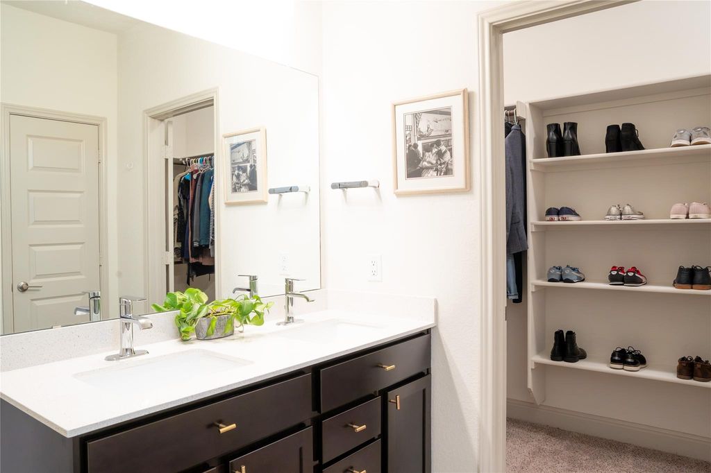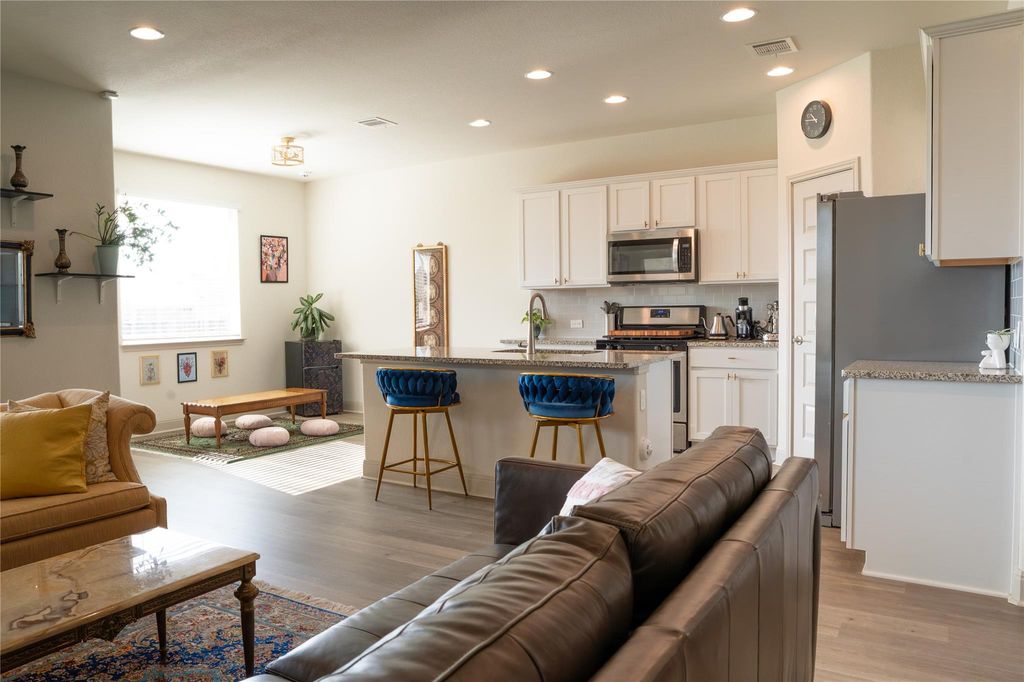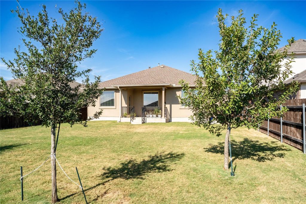 Step inside and you'll immediately notice the inviting flow of this thoughtfully designed home. The open-concept layout connects the living room, dining area, and kitchen, creating a bright, welcoming space that's ideal for both everyday living and entertaining. The kitchen features a large center island with granite countertops, crisp white cabinetry accented by brass hardware, a coordinating subway tile backsplash, and a separate pantry for added storage. The primary suite offers a private retreat with a spacious en-suite bathroom featuring dual sinks, dark cabinetry with brass hardware, a walk-in shower with a built-in bench, and a generous walk-in closet. Two additional bedrooms provide comfort and flexibility for guests, an office, or hobbies. Throughout the main living areas, durable vinyl plank flooring adds a modern touch, while plush carpet keeps the bedrooms cozy. All windows are dressed with 2" white blinds for a clean, finished look. Additional highlights include a 2021 roof, a five-year-old HVAC system, blown-in attic insulation for energy efficiency, and a fully automatic sprinkler system. Step outside to a large backyard with a covered patio "” perfect for relaxing evenings or weekend gatherings. The front yard features native landscaping for easy upkeep and natural curb appeal. Washer and dryer convey, making this home truly move-in ready. Located in a welcoming community with walking trails, parks, and nearby shopping and dining, this home blends comfort, style, and convenience in one beautiful package. Seller is offering $10,000 in buyer concessions! Ask about the opportunity to assume the existing VA loan at a 2.25% interest rate (eligibility and restrictions apply"”contact us for details!)