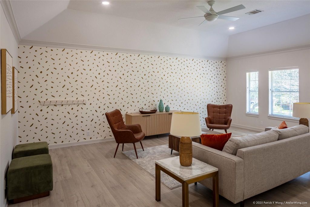 INTERIOR | Beamed Ceilings, Bookcases, Built-in Features, Ceiling Fan(s), Double Vanity, High Ceilings, Kitchen Island, Master Downstairs, Pantry, Recessed Lighting, Storage, Walk-In Closet(s), Wired for Data |