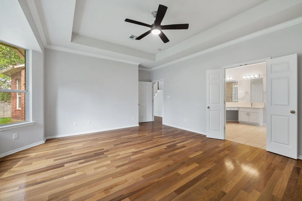 Updated, Spacious, and Ideally Located in Steiner Ranch Located on a large, private corner lot in one of the quietest sections of Steiner Ranch, this beautifully maintained home offers thoughtful upgrades, flexible living space, and a rare oversized 3-car garage"”an uncommon find at this price point. The main level features multiple living and dining areas, making it easy to entertain or create defined spaces for work and relaxation. Upstairs, you'll find three secondary bedrooms plus a large bonus room"”perfect for a playroom, media room, or second home office. Updates include custom hardwood floors throughout both levels, updated countertops, a newly renovated primary shower, and a brand-new roof. The oversized primary suite includes a generous walk-in closet and plenty of privacy, tucked away on the main floor. Just a short walk to John Simpson Park and pool, with quick access to Quinlan, neighborhood trails, and 620, this home combines convenience, space, and value in one of Austin's most desirable communities.