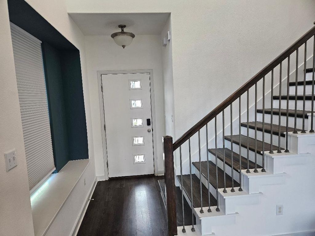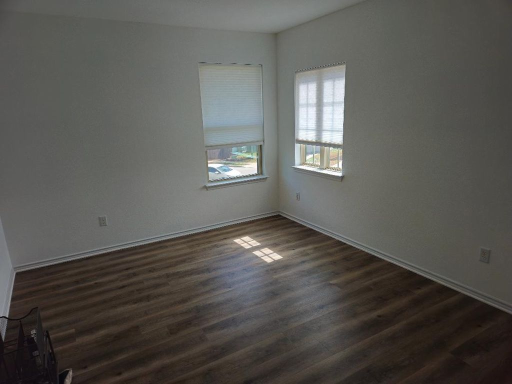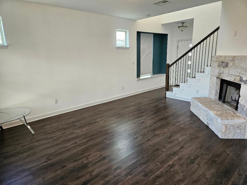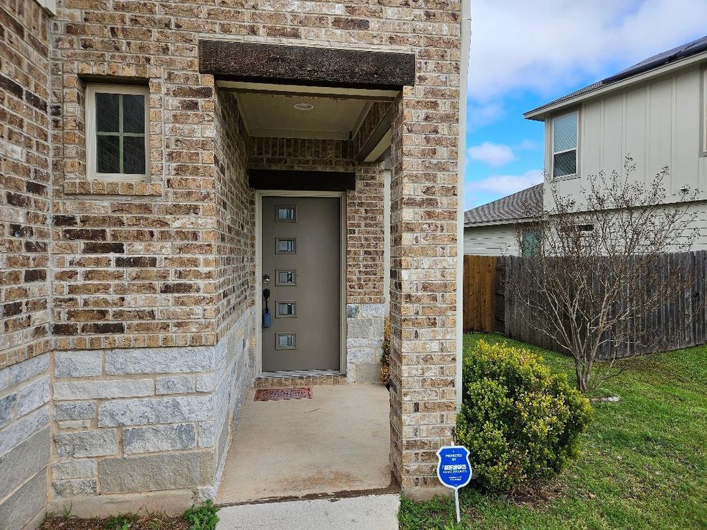 FANTASTIC, upgraded home in a great neighborhood! NO CARPET. Community pool, playground, well equipped gym! Laminated wood floors upstairs and downstairs living room and stairwell. Ceramic tile kitchen and dining. Quartz countertops, stainless steel appliances, including refrigerator. Wood-burning fireplace with log lighter. Wrought iron banister on stairs. Master bedroom with separate study/sitting/hobby area. Master bath with dual, quartz-top sinks, LARGE walk-in shower. Half bath and laundry room off kitchen. Covered back yard patio. Automatic sprinkler system entire yard. Community pool and playground. Neighborhood close to everything. 10-15 minutes from dining and entertainment centers in downtown Austin. 5 minutes from COTA and all the concerts, racing, and family events there! Great access to highway, airport, & major employment centers, like Tesla and downtown Austin.