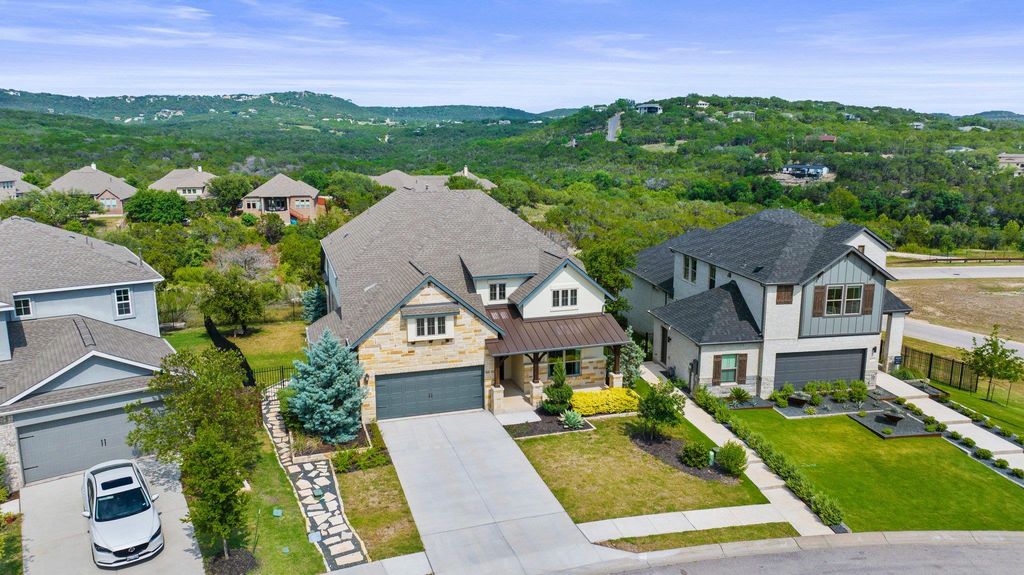 Model Home Magic with Hill Country Views! Welcome to 8108 Turning Leaf Cir"”a never-lived-in former Coventry model home loaded with over $186K in designer upgrades and set in the scenic lakeside community of Tessera on Lake Travis. With 4 bedrooms, 3.5 bathrooms, and 2,879 square feet of thoughtfully styled space, this home is equal parts polished and practical. Inside, you'll find quartz countertops, custom wall paneling, and a built-in entertainment center that anchors the spacious living area. A curved wood staircase adds architectural charm, while the butler's pantry and elevated lighting choices give the home a custom finish throughout. Upstairs, the spacious game room offers built-in desk space, creative accents, and all the flexibility you need"”whether that's movie nights, work-from-home, or everything in between. The primary suite is a true standout, featuring elegant tray ceilings, paneled walls, and a sleek designer light fixture that ties it all together. The exterior shines with stonework, gabled dormers, and mature landscaping, along with wrought iron fencing and direct access to the community's walking trail. Living in Tessera means enjoying one of the most amenity-rich neighborhoods on Lake Travis. The Lakeside Club features an infinity-edge pool, splash pad, fire pit, fishing dock, and a private boat launch for residents. With over a mile of accessible shoreline, a beach area, trails, and a pavilion for casual get-togethers, everything is designed to bring the outdoors closer to home. Contact your agent today to arrange a private showing!