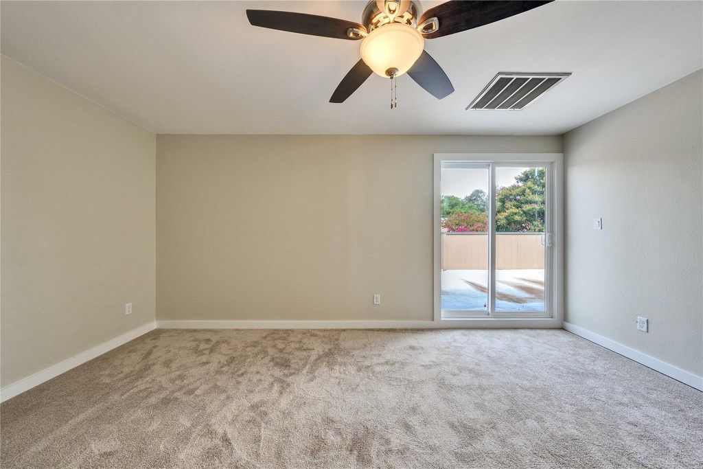 Beautiful townhome in Villa Serena! Surrounded by large oak trees. This is an end unit townhome in the middle of community within walking distance to pool and clubhouse. Unit is spacious and airy with 18 ft ceilings. Primary suite is on main level and opens to flexible living area that could be used as office, workout area or move living space. Updated kitchen and new stainless-steel appliances. Freshly painted throughout. Upstairs has two bedrooms-the back bedroom has sliding glass doors to the large upper deck area, imagine having coffee or relaxing in your private treehouse space! Many upgrades! Must see!