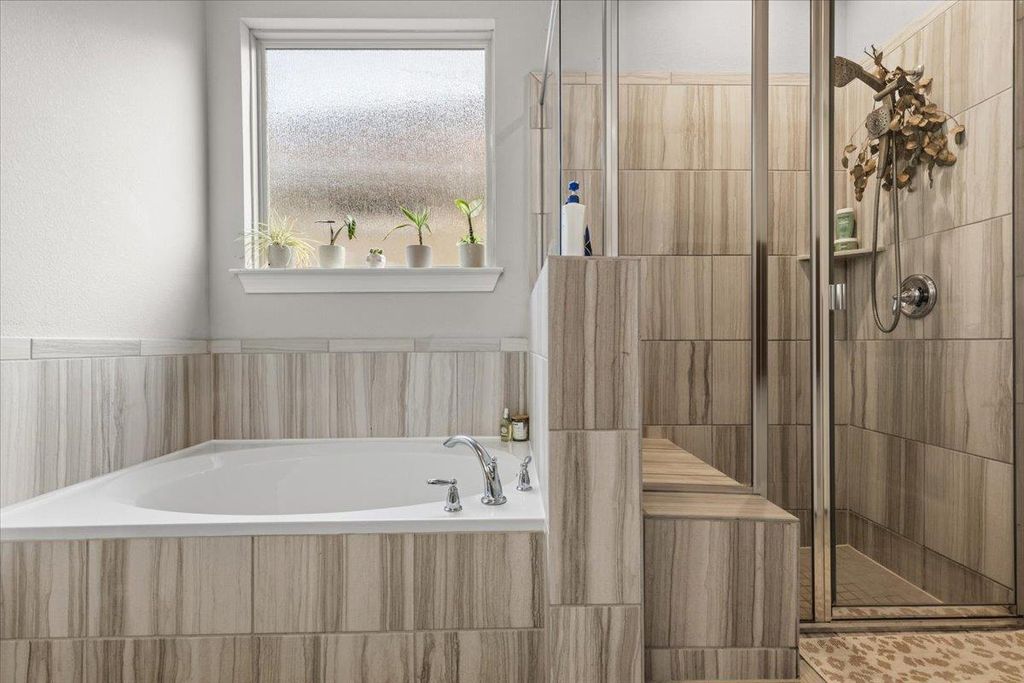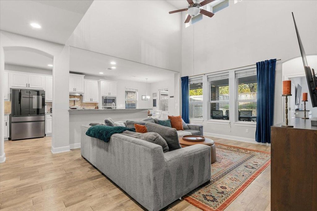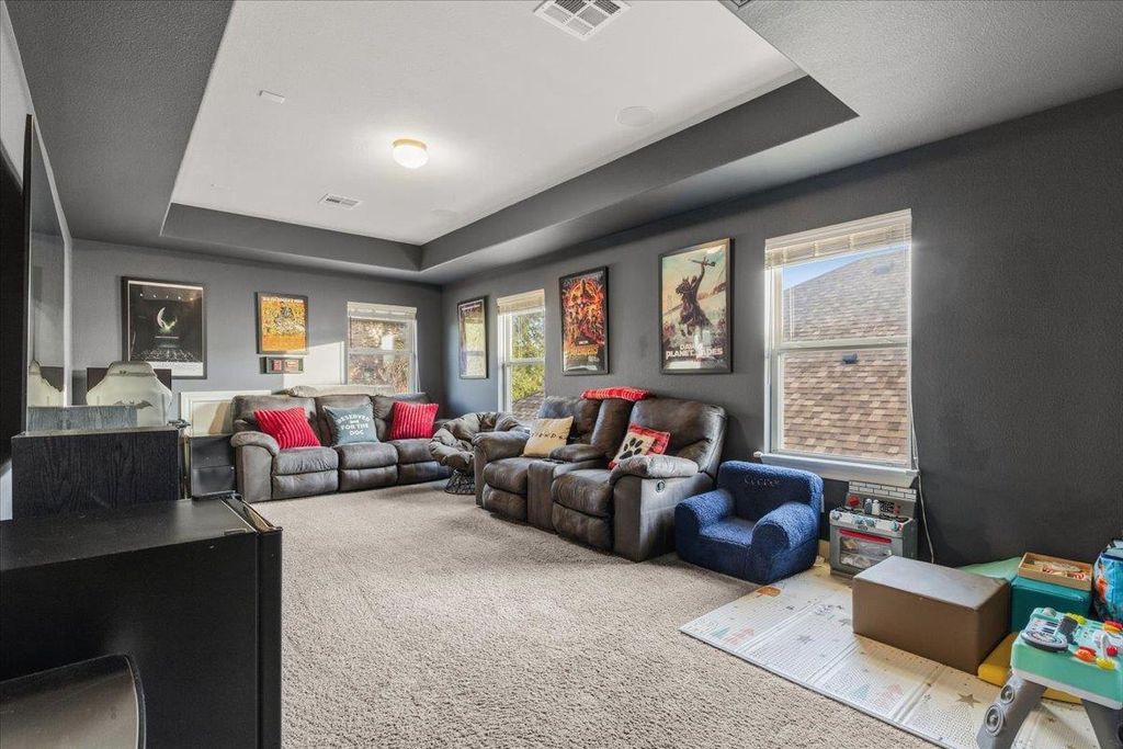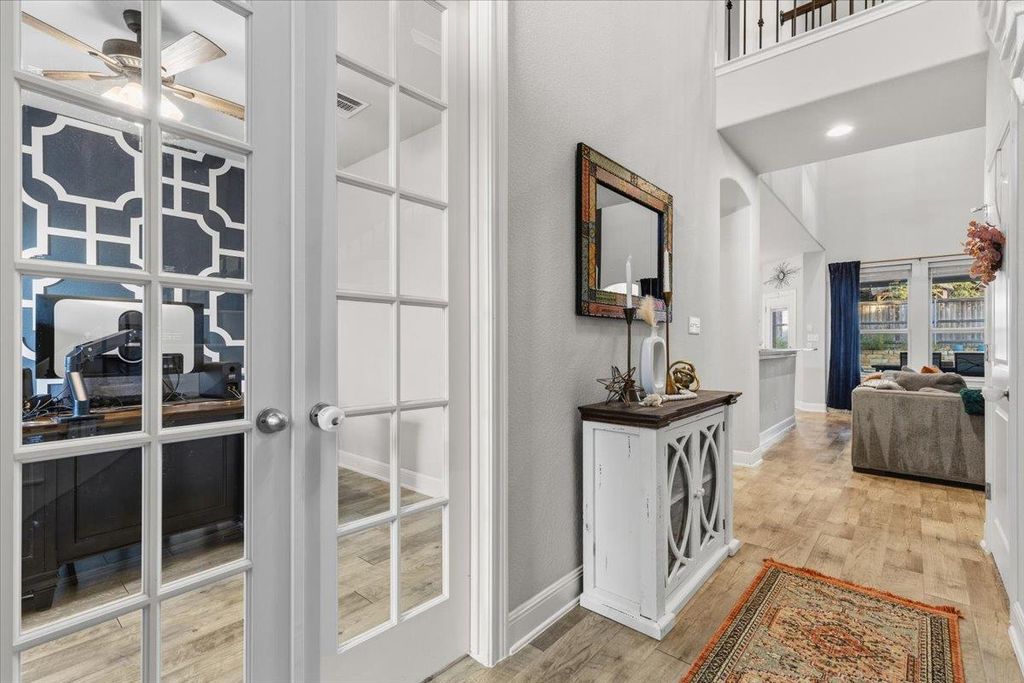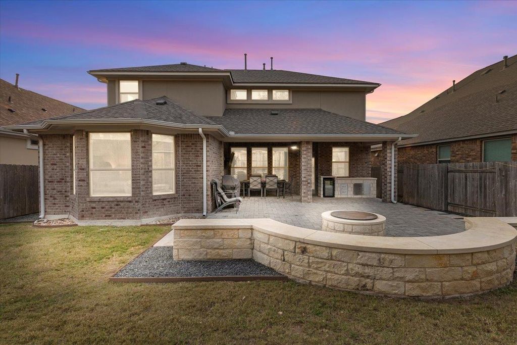 Welcome to this beautifully maintained 2-story home in Leander's highly sought after neighborhood of The Bluffs at Crystal Falls. This home sits on a quiet street surrounded by mature trees and features a spacious layout with 4 bedrooms, 4 bathrooms, media/game room, and a designated home office. There are tons of features to love about this open, spacious, and tastefully upgraded home including walls of windows for an abundance of natural light, luxury vinyl plank flooring, large family room, spacious kitchen, and custom backyard oasis. The expansive gourmet kitchen is dressed with granite countertops, center island, built-in oven & microwave, gas cooktop, stainless steel appliances, ample cabinet space, and recessed lighting - ideal for cooking and entertaining. The main-level primary bedroom offers a generous ensuite featuring double sinks, garden tub, and separate walk-in shower. Upstairs boasts a sprawling media/game room with newly installed surround sound speakers, plus 3 generously sized additional bedrooms and two full baths. Step outside to your private backyard oasis, featuring extensive stonework, cozy fire pit, spacious seating area, and custom outdoor serving station - ideal for relaxing with family or entertaining. This move-in-ready home has been well cared for and updated with a new roof (2025), as well as many other thoughtful updates throughout. Residents enjoy all of the amazing Crystal Falls amenities including two community pools, parks, playground, basketball court, full size tennis court, 18-hole disc golf course, and miles of walking trails. Close to fantastic shopping, and tons of dining and entertainment options. Enjoy easy access to Randall's, HEB Plus, 1890 Ranch, two ACC campuses, Leander Station, Twin Lakes YMCA Sports Complex, and many other local amenities. Convenient commute to the nearby North Austin tech corridor and just 30 miles from downtown Austin. Zoned for the highly acclaimed and award winning Leander ISD. Welcome home!