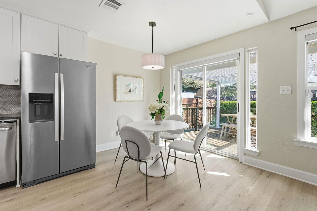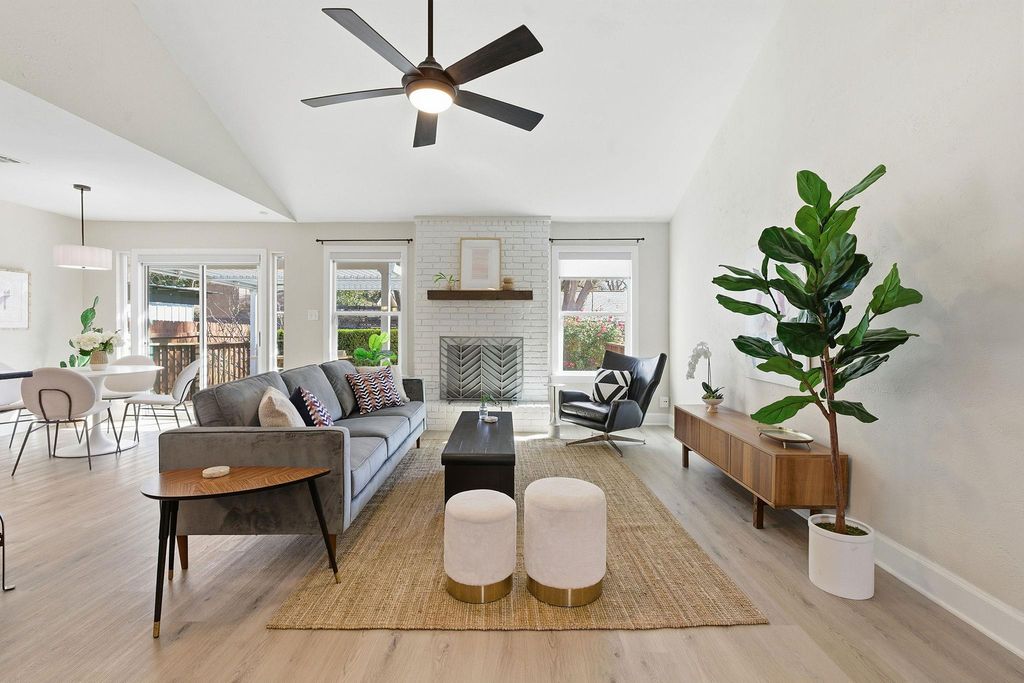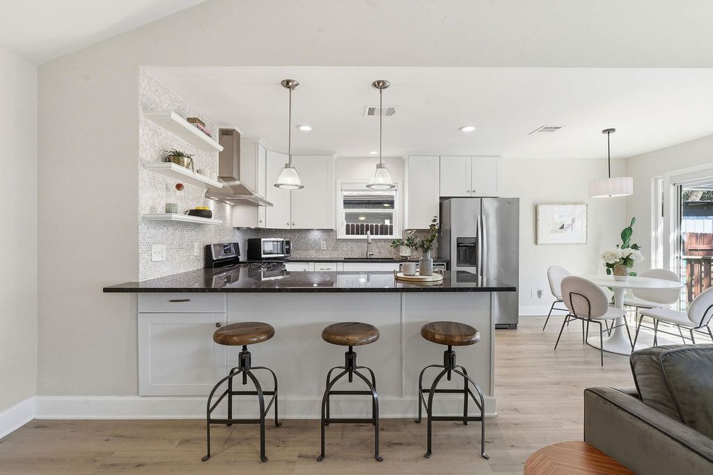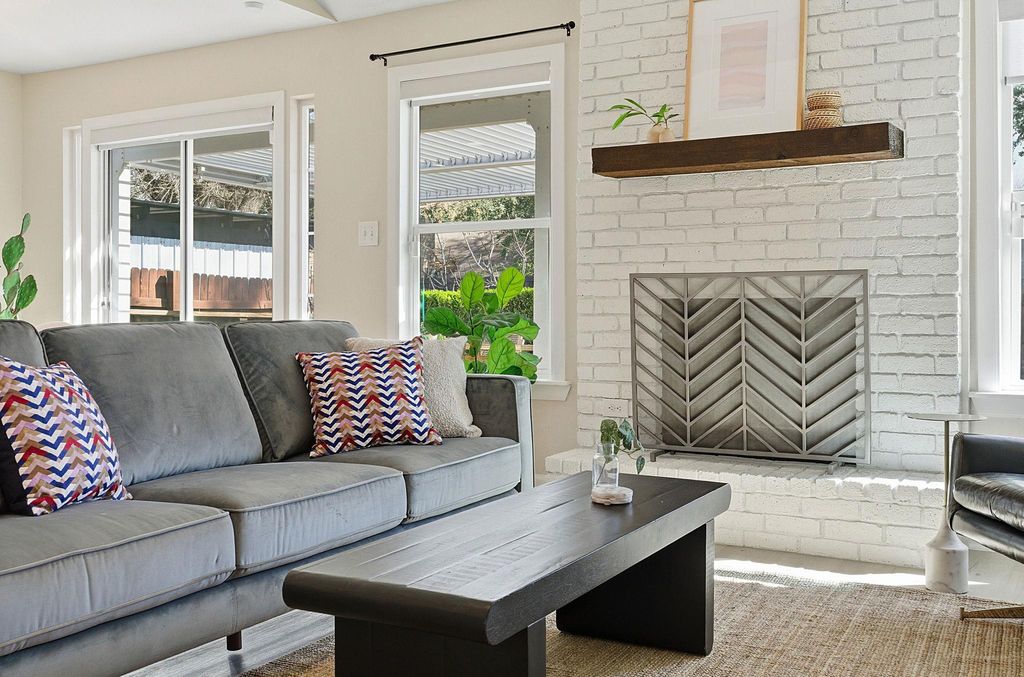 Thoughtfully remodeled one-story home on a corner lot with standout curb appeal. This 3-bedroom residence features an open, airy floor plan with vaulted ceilings and thoughtful finishes throughout. The inviting living area is anchored by a cozy fireplace, creating a warm and functional space ideal for both everyday living and entertaining. All closets are outfitted with custom storage systems, offering smart organization and maximizing usable space throughout the home. The backyard is a true highlight, offering an adjustable pergola that provides shade and weather protection over an oversized patio that is perfect for outdoor dining or relaxing year-round. Located in a highly convenient pocket of South Austin, this home is just minutes from local restaurants, breweries, and coffee shops, with easy access to SoCo and downtown.