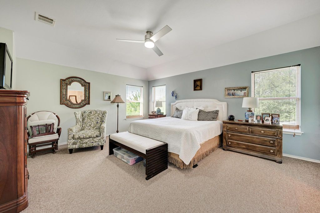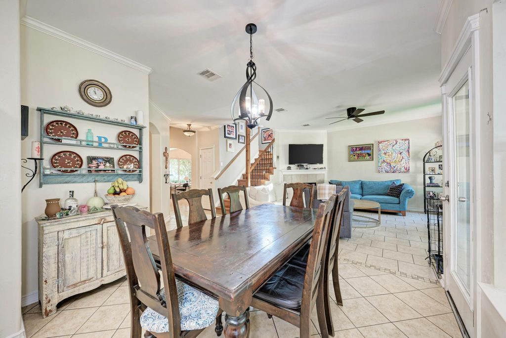 Well-maintained 4-bedroom, 2.5-bath home in Greenbury Village with recent interior paint and windows (2022). All bedrooms upstairs, each with ceiling fans; spacious primary suite with private bath. Downstairs features a front-facing dining room with large window and natural light. Backyard built for entertaining with brick fire pit, artificial turf, and fully covered rear porch with tile flooring and ceiling fan. Additional covered patio also includes ceiling fan. Gutters on all sides. Pride of ownership throughout! Conveniently located near schools, shopping, and major roadways"”move-in ready!