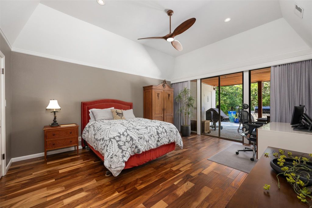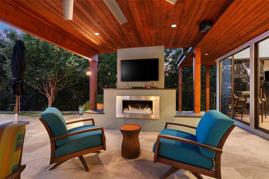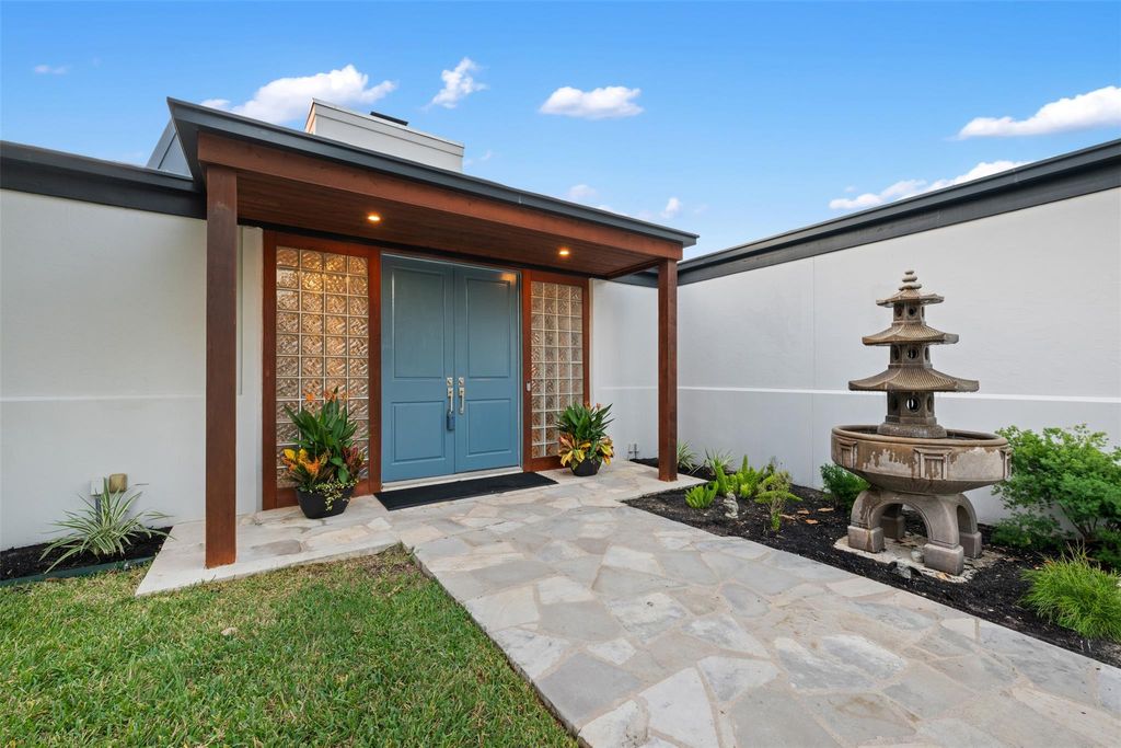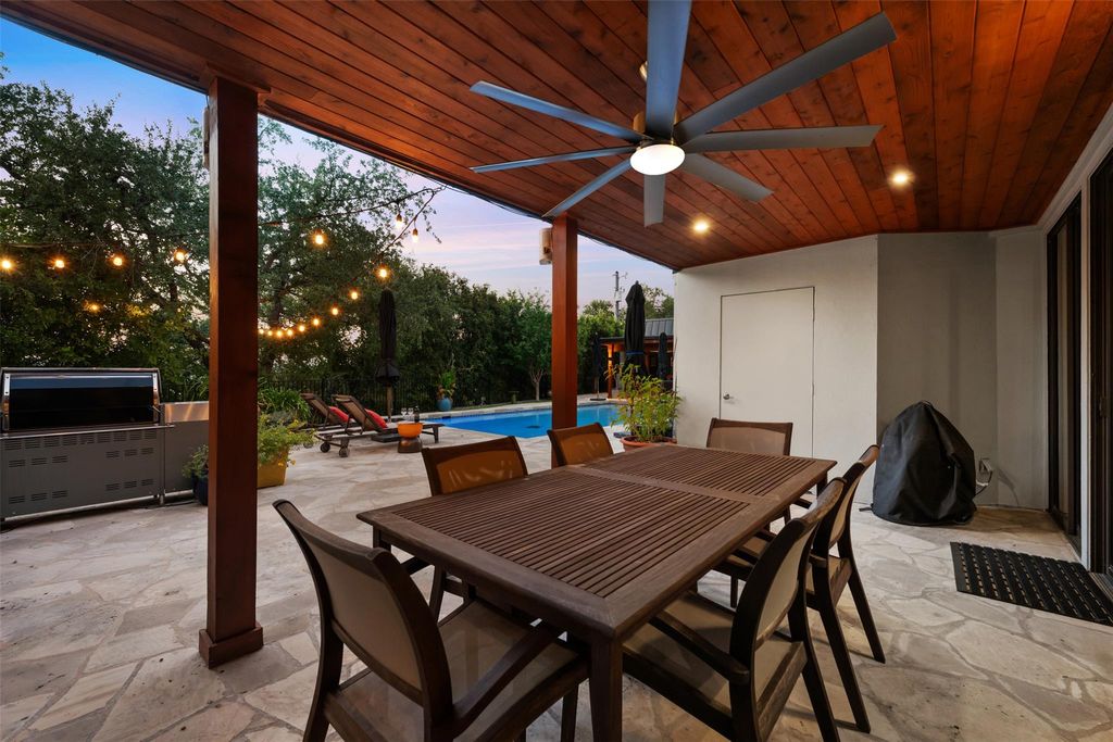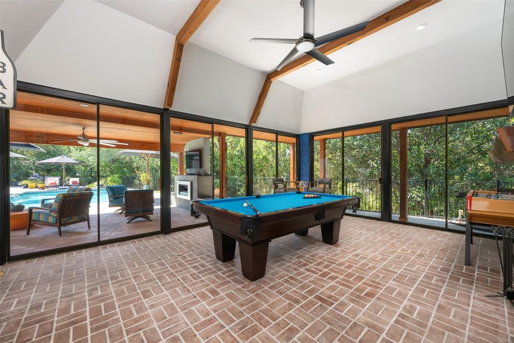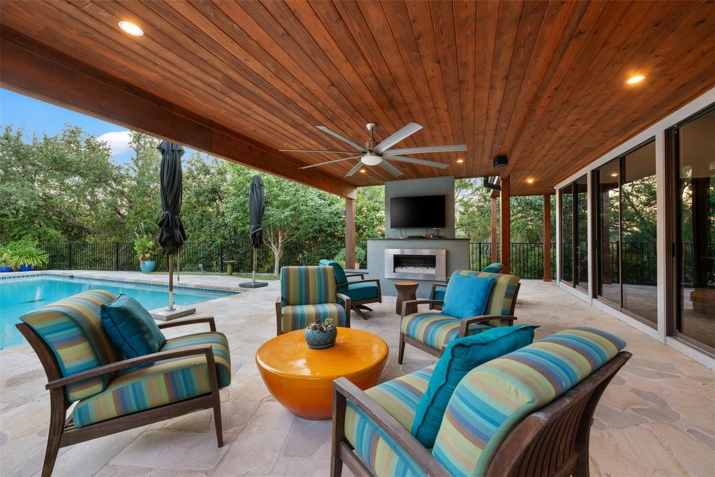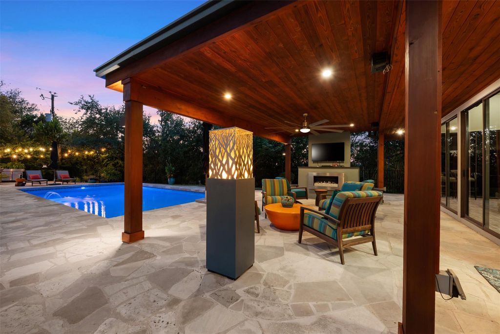 This stunning single-story home in Old Lakeway has been taken down to the studs and meticulously remodeled with luxurious finishes and timeless design. Set on a beautiful .37 acre lot with tall oaks, the home offers multiple expansive outdoor living areas and a sparkling swimming pool, creating a private oasis perfect for both relaxation and entertaining. Inside, a spacious open floor plan features high ceilings, with travertine and hardwood floors flowing throughout. The gourmet kitchen is a chef's dream"”completely remodeled with Thermador appliances, including double ovens, refrigerator, microwave drawer and dishwasher adorned by granite countertops, and custom cabinetry. Walls of glass flood the home with natural light and offer serene views of the pool and lush gardens. All windows have been replaced, electrical panels on home and casita, AC systems, pool pump and cleaner and much more. The main house includes two generous bedrooms with remodeled ensuite baths, both granting access to outdoor living with wonderful privacy, a large dedicated office or study has handsome library wall and access to pool area, a glass surround dining room, and an oversized family room with fireplace"”ideal for modern living. Step outside to the resort-style outdoor living area, featuring a fireplace and a tongue-and-groove wood ceiling treatment cover multiple living spaces perfect for year-round enjoyment. Just beyond, a private casita offers an additional full living space complete with brick flooring, a cozy fireplace, dishwasher drawer, refrigerator, wine fridge, and a spacious bedroom with lovely full bath"”ideal for guests, extended family, or a home studio. Surrounded by mature trees, vibrant flora, and rich landscaping, when the leaves fall there is a magical Lake view waiting for you. This home offers rare privacy and elegance in one of Lakeway's most sought-after neighborhoods. You will fee as though you are on vacation when you come home.