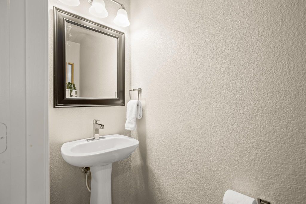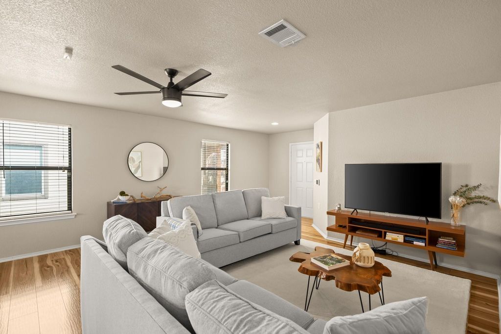 Charming 2-story home in the heart of Austin's 78747! This lovely 3 bed, 2.5 bath residence boasts a cozy front porch and full gutters, setting the tone for a warm and inviting living space. Step inside to enjoy the main level's high ceilings, abundant natural light, and open layout that seamlessly integrates the living, dining, and kitchen areas. The sun-drenched dining area features a charming overhead light fixture and direct access to the patio and fully fenced backyard, perfect for outdoor entertaining or relaxation. The kitchen shines with quartz countertops, recessed lighting, stainless steel appliances, and a stylish tile backsplash. A convenient half bath is located on the main level, while the three spacious bedrooms and two additional bathrooms are situated upstairs. The upstairs den, complete with a ceiling fan and laminate flooring, offers flexibility and can be converted to suit your needs. The primary bedroom is a serene retreat, featuring a sitting area, ceiling fan, and an en-suite bathroom with dual vanities, framed mirrors, a deep soaking tub, a separate walk-in shower, and a walk-in closet. Each secondary bedroom boasts a ceiling fan and walk-in closet. With close proximity to the community pool, parks, shopping, restaurants, and entertainment, this home offers the perfect blend of tranquility and accessibility.