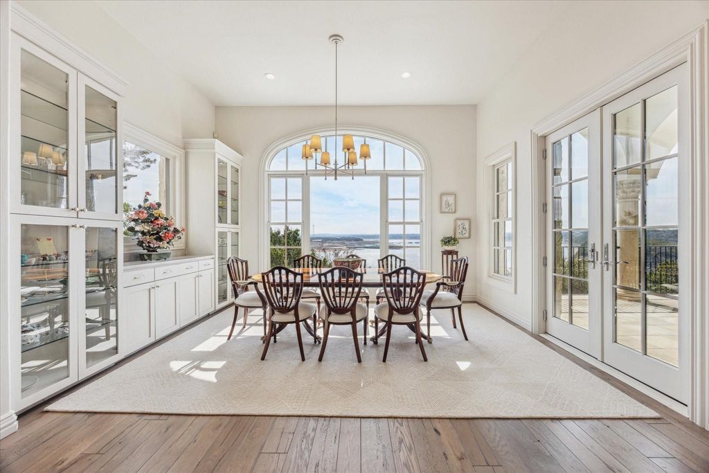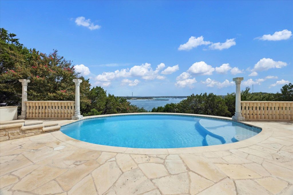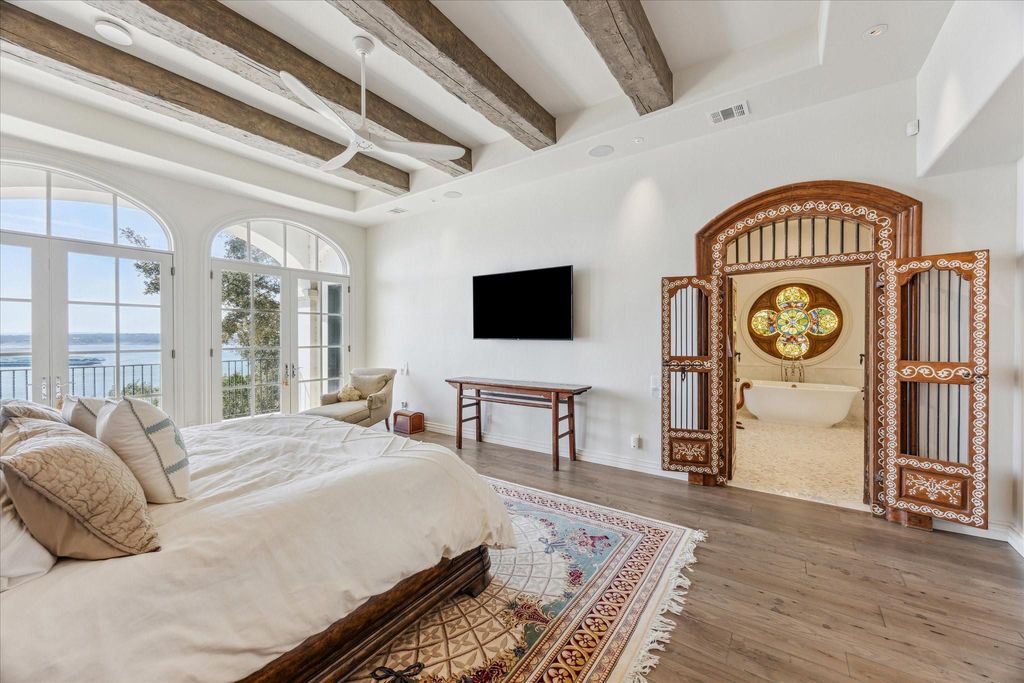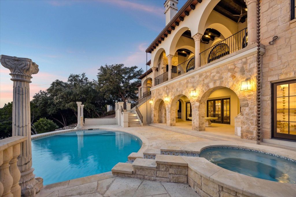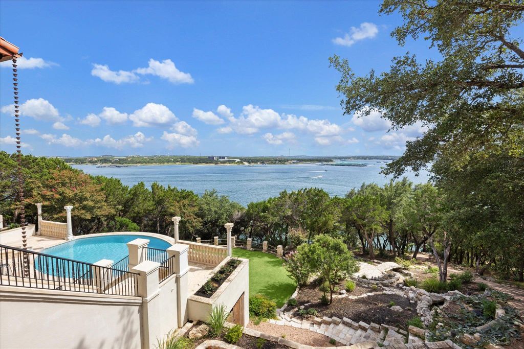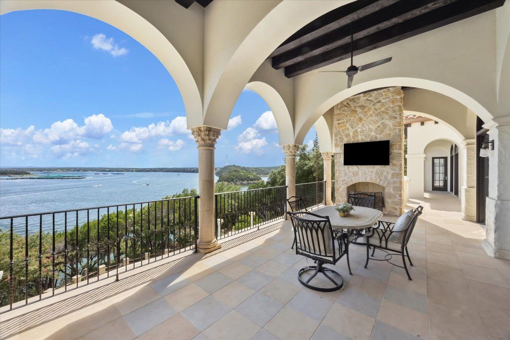 Welcome to this exquisite Northshore Lake Travis lakefront sanctuary in the gated area of The Hollows. With ~ 230' of lake frontage, this magnificent estate spans an impressive 10,792 sq ft in the main home with an additional separate guest quarters of 910 sq ft, offering an unparalleled experience on a sprawling 3.69 acre lot. This striking Santa Barbara style home was designed by the renowned Jauregui Homes, and showcases beautifully crafted high ceilings, arched details, Segreto finishes and so many intricate touches. The home, pool and spa have been extensively remodeled blending high quality, modern luxuries with Old-World style, unique European pieces and custom lighting fixtures. The hand finished reclaimed hardwood floors, gorgeous Italian imported stained glass, and solid marble Italian columns make this estate a masterful work of art. Antique wood entry doors from a European Monastery open the way to discovering an expansive layout featuring gorgeous common rooms, 6 bedrooms and 9 opulent bathrooms. The primary ensuite with a covered balcony and sweeping lake views is on the main level and is adorned with double wood doors with ivory inlaid accents, spacious spa like bathroom, retreat/yoga studio, and 3 walk in closets. The gourmet kitchen is complemented by 2 islands and multiple workstations, and is open to the massive family room with fireplace and wet bar. The appliances are top of the line, and include a Lacanche French range and dual fuel ovens. Other rooms include a lovely formal living room with fireplace, formal dining room, multiple living areas, well-appointed office, home theater, wine grotto and safe room. Enjoy the breathtaking waterfront views and lovely sunsets! The separate guest quarters include a kitchen, bedroom, full bathroom, living room and laundry facilities. The pool and spa overlook the lake, large covered patio and summer kitchen. The community offers wonderful amenities. This exceptional estate is a testament to refined living.
