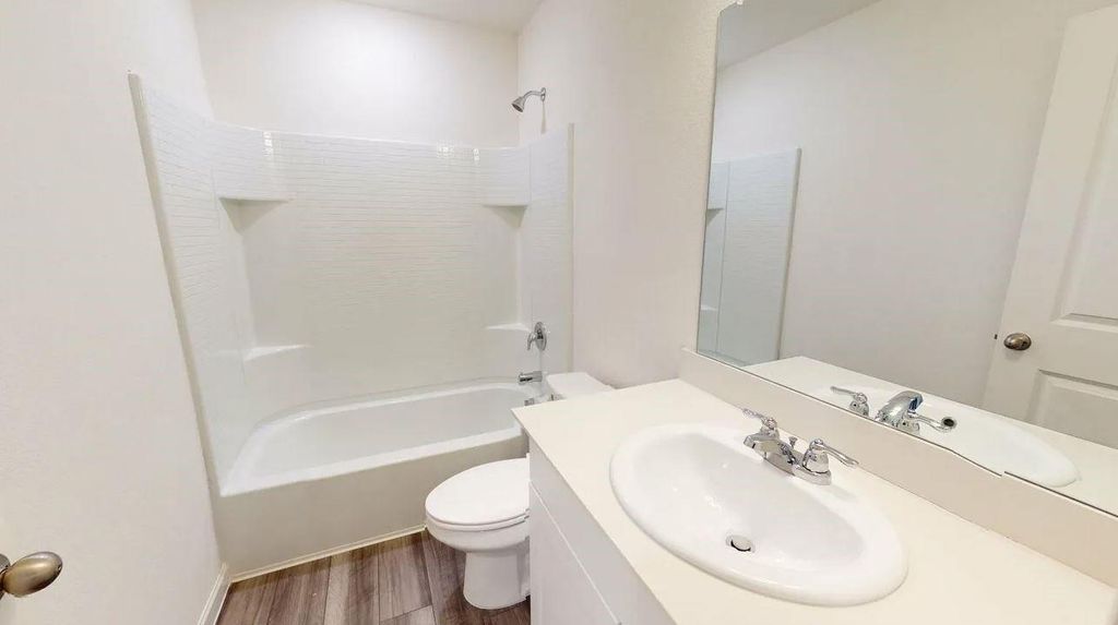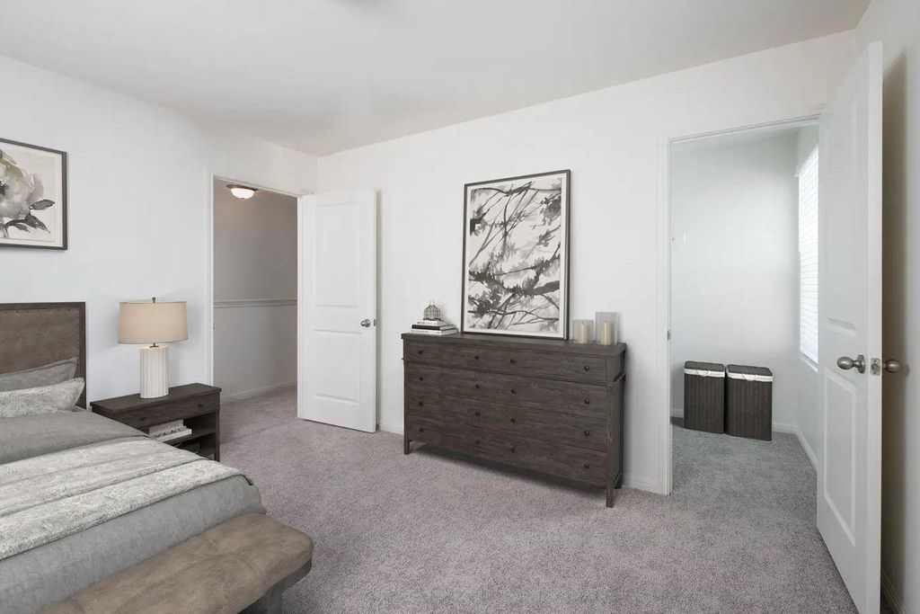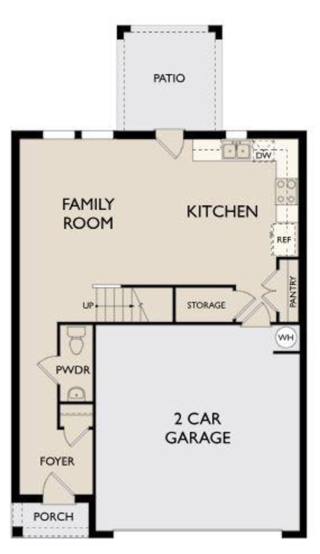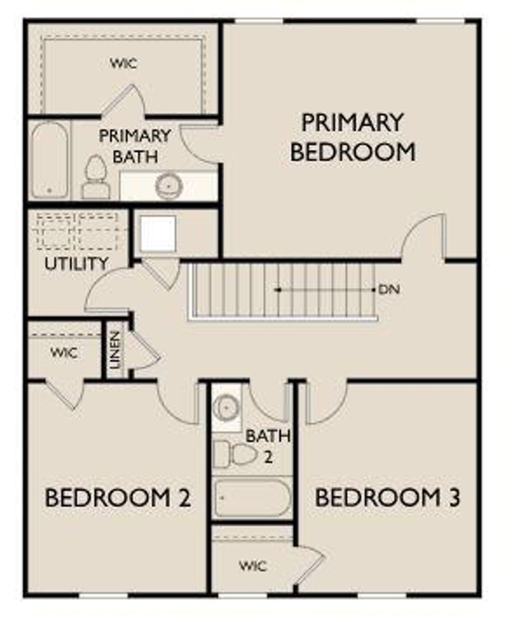 You enter through the covered porch into the foyer and travel down the hall, where a powder bath is conveniently located. As you step into the family room, the stairs leading to the second floor come into view. The open layout flows into the kitchen, which features a pantry, additional storage space, and access to the two-car garage. Upstairs, the primary bedroom includes a walk-in closet and a spacious primary bath. The laundry room is located right at the top of the stairs for easy access. Two additional bedrooms, each with its own walk-in closet, share a full bath.