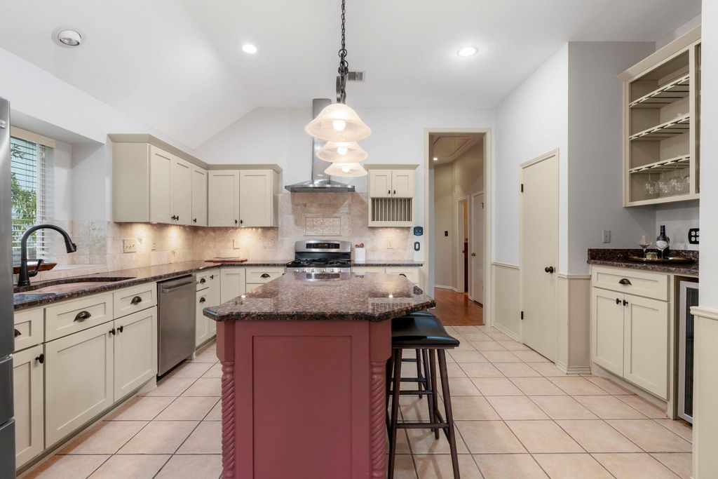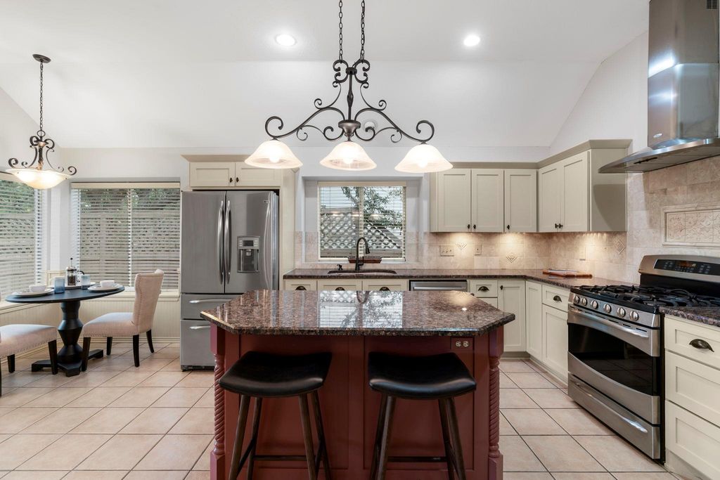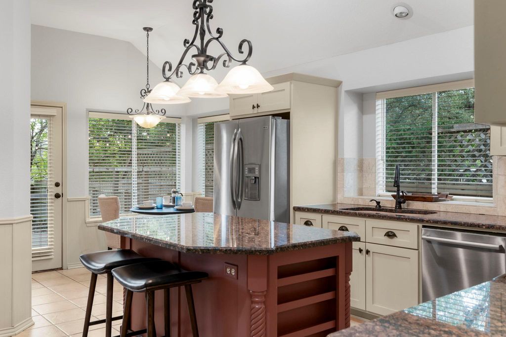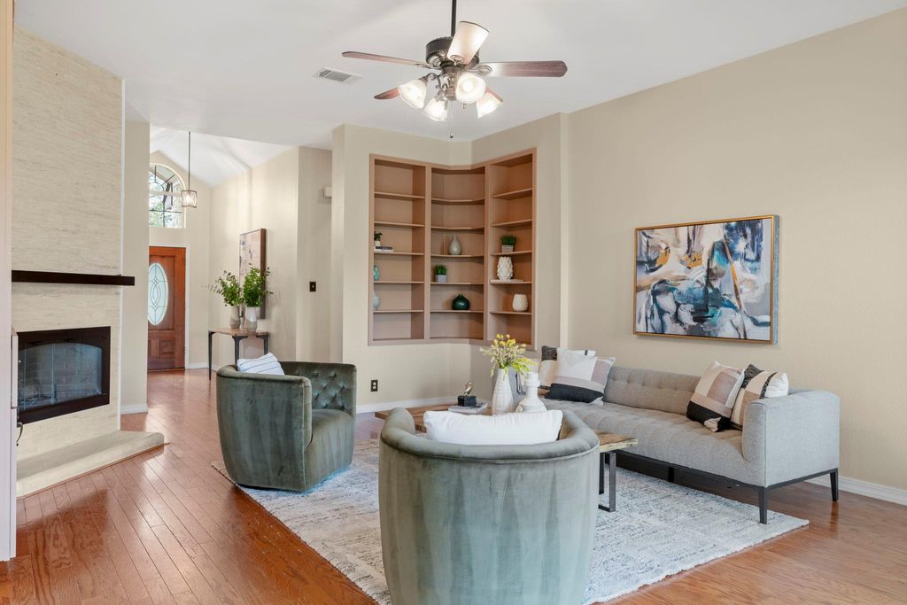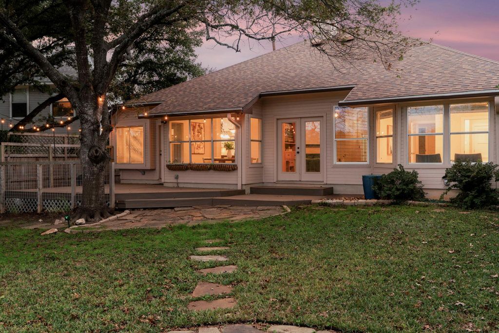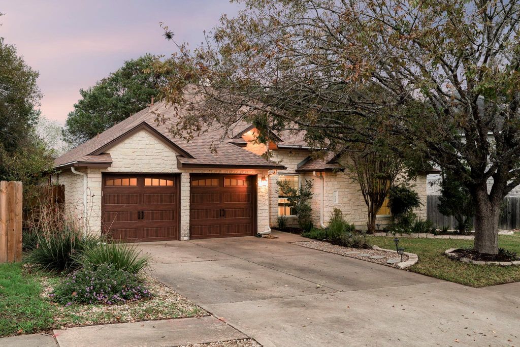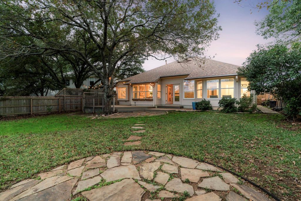 Thoughtfully updated and truly move-in ready, this Legend Oaks home blends comfort, style, and greenbelt views in one of South Austin's most convenient pockets. Directly across from the community pool, park, playground, and tennis courts, it offers everyday access to the neighborhood's best features. A 2024 roof, mature trees, stone masonry, and custom garage doors give the exterior a refined, established presence. The sunlit interior sits under soaring high ceilings with warm engineered hardwoods and clean modern finishes that create an inviting atmosphere. Custom-accented fireplace and built-ins add character, while the open flow into the formal dining room and adjacent kitchen make staying connected easy. The kitchen serves as the heart of the home with durable granite countertops, stainless appliances, a generous island, sunny breakfast area, and a tailored wine bar. The private primary suite frames peaceful greenbelt views through bay windows. Its refreshed bath features dual sinks, a freestanding soaking tub, frameless shower, and a well-designed walk-in closet. Three additional bedrooms and a modernized secondary bath deluxe large walk-in shower offer flexibility for family, guests, work, or creative space. A spacious back deck extends the living area outdoors, ideal for evening dinners or quiet mornings. A flagstone path leads to a dedicated nook for a chiminea or firepit, all set against the privacy of the greenbelt. Nature trails, the neighborhood park, Latta Branch Greenbelt, and Dick Nichols Pool are close at hand, while Google Fiber ensures fast connectivity. Just 5 minutes from Arbor Trails, Costco, major routes, and 10 miles from Downtown, this home delivers a balanced blend of ease, character, and natural surroundings. Don't miss out on this truly special move-in-ready gem - schedule a showing today! Fridge, Wine Fridge, Washer, Dryer, Shed in Backyard Convey.