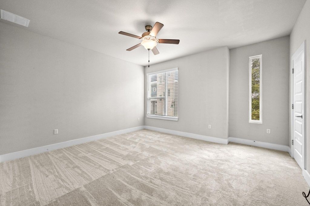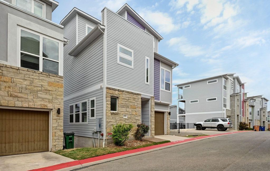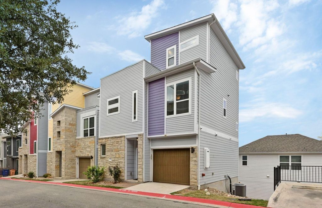 Move-in ready and priced below market for a quick sale. Absolutely breathtaking view of the downtown Austin skyline from the third floor bedroom. Sitting on one of the highest points in the Edgewick community, this free standing condominium has an unobstructed view of the city skyline, and panoramic views looking to the Hill Country and beyond. View the city lights and glow of sunrise and sunset from the oversized suite. This home has two primary suites, each with it's own ensuite full bathroom which make for a perfect living situation for roommates, or for next gen living. Less than 5 miles to downtown Austin and Zilker Park, and all that downtown living has to offer. 7 miles to the airport and ideal for those who want a lock and leave lifestyle with close proximity to the airport. Mable Davis Park, with its beautiful walking trails, and Linder Elementary are just outside of this gated community. The ground floor entry leads to a spacious breakfast area and kitchen, with ample room for a second living area. Stainless steel appliances, white quartz countertops, a stunning blue glass backsplash, glass front cabinets and gas cooking are the highlights of the kitchen. There is also a pantry, large storage closet, along with a half bath. Upstairs on the second floor is a living area with large windows that face the city. There is a bedroom with ensuite bath and large walk-in closet, along with a laundry room. The third floor has another spacious bedroom with ensuite bath, walk-in closet. The highlight of the property is the picture windows facing downtown where you have the most amazing views. There is a community pool with a shaded pavilion, grill, WIFI access, public restrooms and a large, gated dog park. Washer, dryer and refrigerator convey. Carpet was replaced the second week of November.