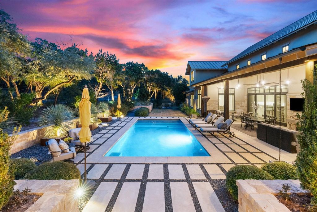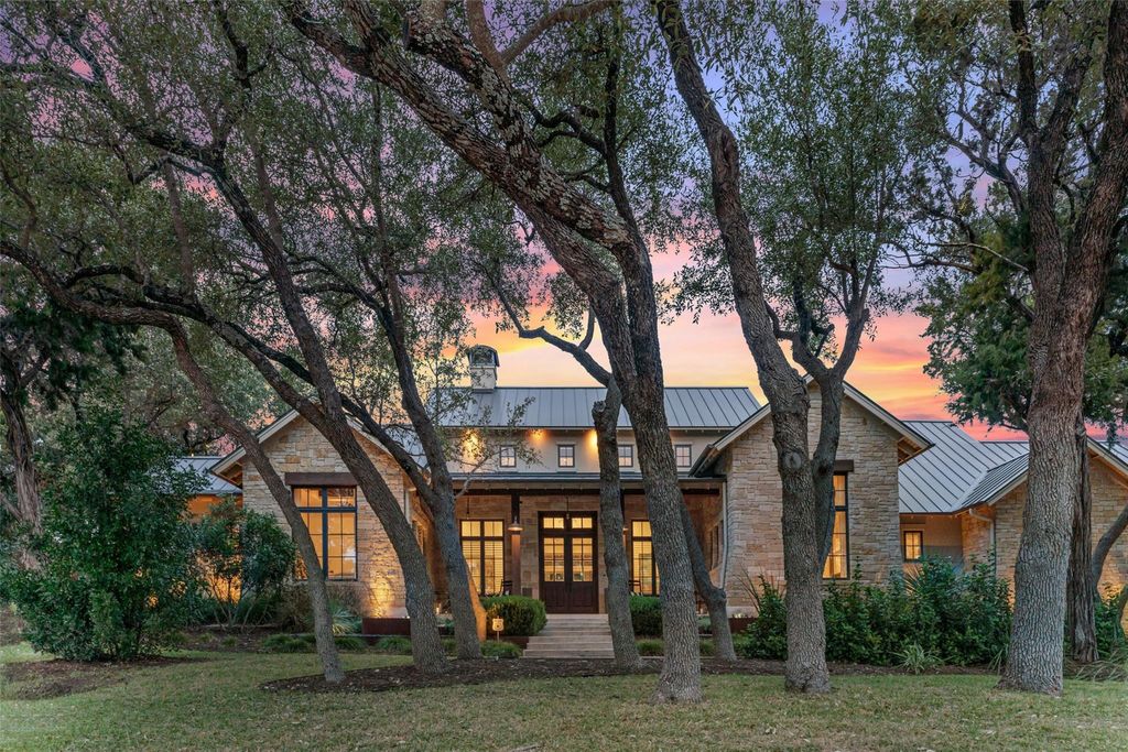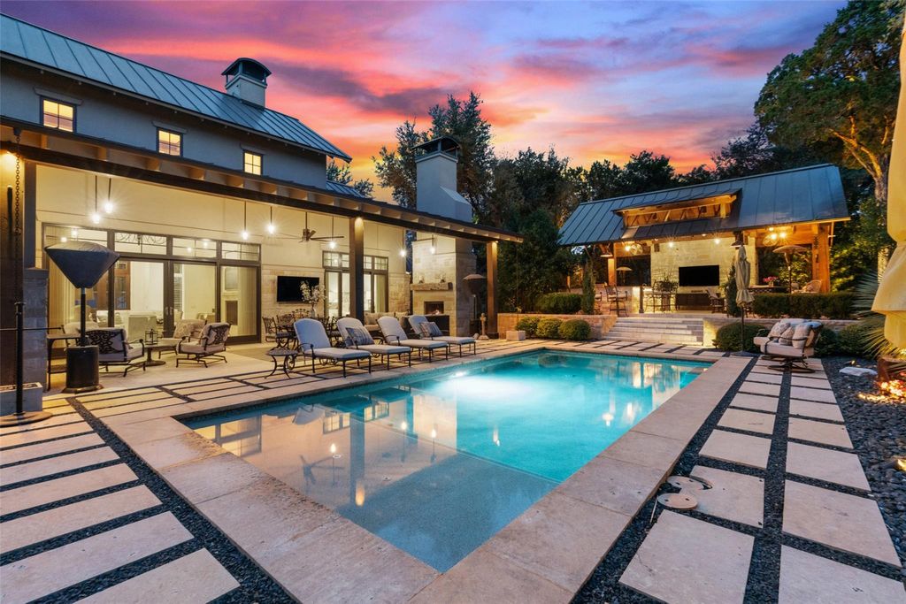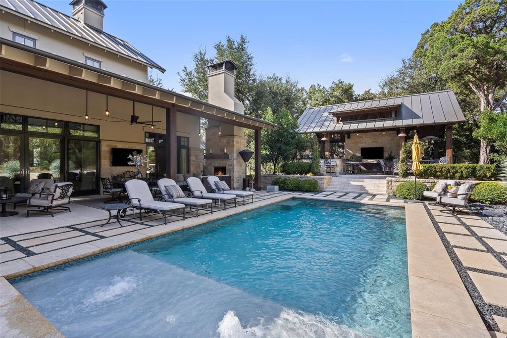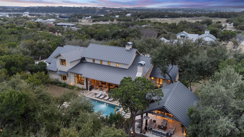 ELEGANT LAKE LIVING!! This Stunning Lake Home offering, is a home located on a private 1.185 acre corner site and/or opportunity to also purchase the contiguous 1.041 acre lot. See MLS# 5012784. CALL FOR PRICING. These Photos and Video provide the current owner's lifestyle use, providing a rare 2-Lot residence, with a combined 2.226 acres of enjoyment. Located in one of the most private sections in the community, on a corner. A great floor plan, providing an open Greatroom to Kitchen and Dining, with expansive views of the serene outdoor covered verandah w/ Fireplace, gorgeous pool, manicured landscape and the spectacular Covered Entertainment Pavillon, providing an Outdoor Kitchen and Bar, Media and Bathroom, with expansive seating areas. The large primary bedroom suite and sitting area opens to the outdoor verandah, with an elegant ensuite bath, a large walk-in shower, oversized soaking tub, double vanities and an expansive walk-in closet complete with custom built-ins. Just off the primary bedroom, is a room with large windows, perfect for a second sitting/living space, media area, office or 5th bedroom. The first floor provides 2 additional bedrooms with full baths and an expansive laundry room. The second floor provides a large bedroom, full bath and a great flex room for hobby, storage or a kid's playroom! Truely a peaceful and relaxing environment, that began with an incredible architect and an award winning custom home builder, highest grade in materials, custom features and finish-out! Impeccable care in ownership! The 300 acre gated community is located on a deep water peninsula, encompassing over 3.5 miles of Lake Travis shoreline. The community provides a 150+ Large Yacht Marina with Golf Cart access, available under a lease, contingent on size and availability. A lakeside pool, park and pavilion, embraced with Majestic Oak Trees. The Clubhouse called the Barn, has billiards and media, a great place to gather! And of course Pickle-Ball!
