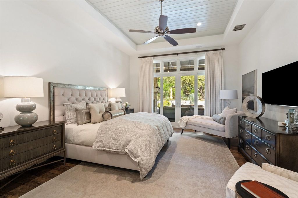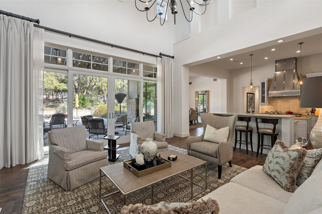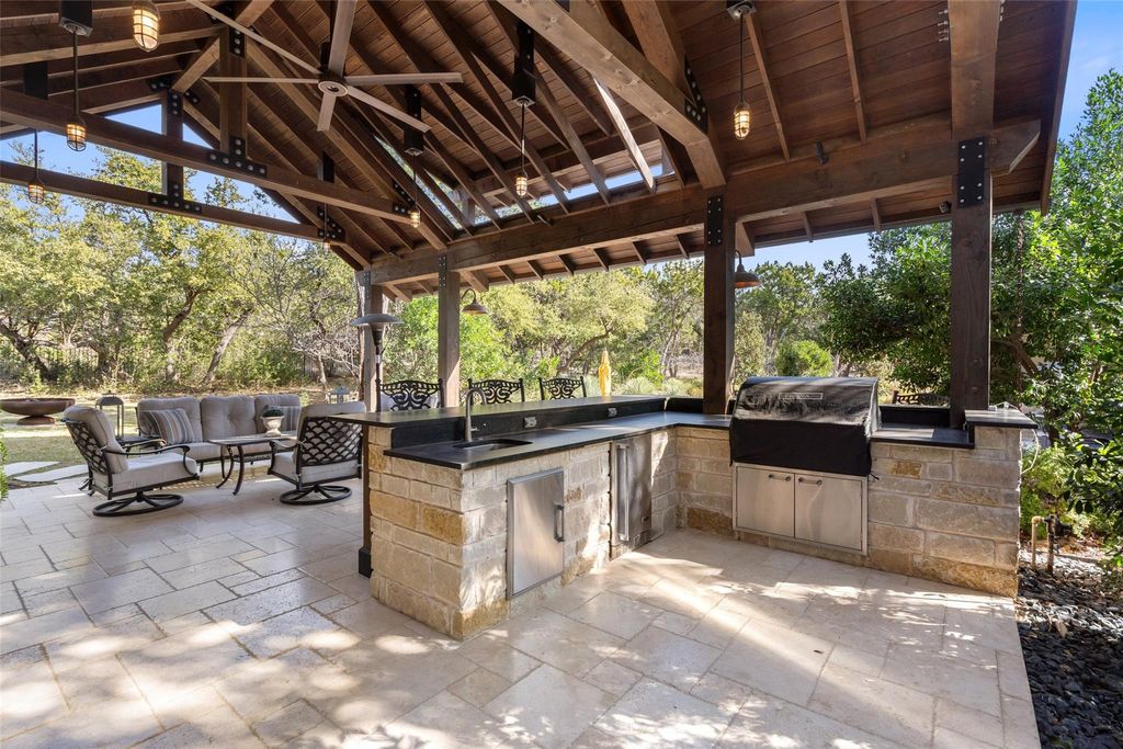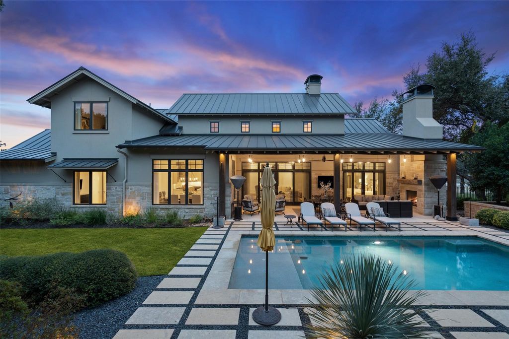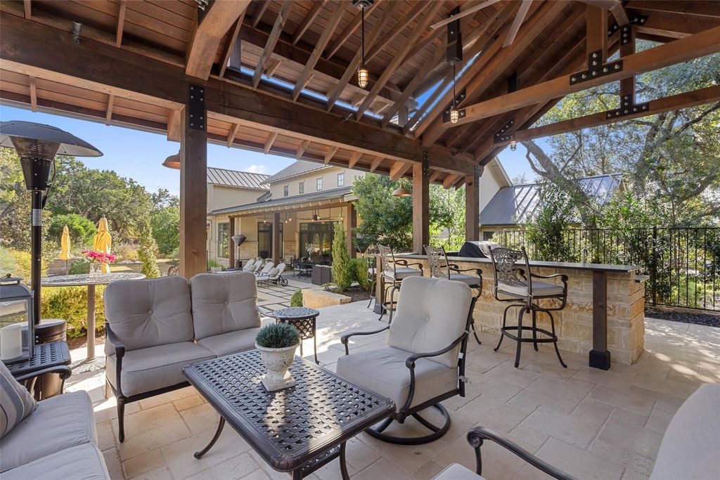 ELEGANT LAKE LIVING!! This Stunning Lake Home offering, is a home located on a private 1.185 acre corner site and/or opportunity to also purchase the contiguous 1.041 acre lot. See MLS# 5012784. CALL FOR PRICING. These Photos and Video provide the current owner's lifestyle use, providing a rare 2-Lot residence, with a combined 2.226 acres of enjoyment. Located in one of the most private sections in the community, on a corner. A great floor plan, providing an open Greatroom to Kitchen and Dining, with expansive views of the serene outdoor covered verandah w/ Fireplace, gorgeous pool, manicured landscape and the spectacular Covered Entertainment Pavillon, providing an Outdoor Kitchen and Bar, Media and Bathroom, with expansive seating areas. The large primary bedroom suite and sitting area opens to the outdoor verandah, with an elegant ensuite bath, a large walk-in shower, oversized soaking tub, double vanities and an expansive walk-in closet complete with custom built-ins. Just off the primary bedroom, is a room with large windows, perfect for a second sitting/living space, media area, office or 5th bedroom. The first floor provides 2 additional bedrooms with full baths and an expansive laundry room. The second floor provides a large bedroom, full bath and a great flex room for hobby, storage or a kid's playroom! Truely a peaceful and relaxing environment, that began with an incredible architect and an award winning custom home builder, highest grade in materials, custom features and finish-out! Impeccable care in ownership! The 300 acre gated community is located on a deep water peninsula, encompassing over 3.5 miles of Lake Travis shoreline. The community provides a 150+ Large Yacht Marina with Golf Cart access, available under a lease, contingent on size and availability. A lakeside pool, park and pavilion, embraced with Majestic Oak Trees. The Clubhouse called the Barn, has billiards and media, a great place to gather! And of course Pickle-Ball!