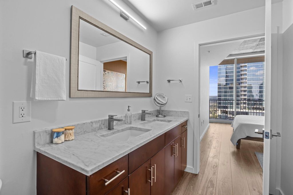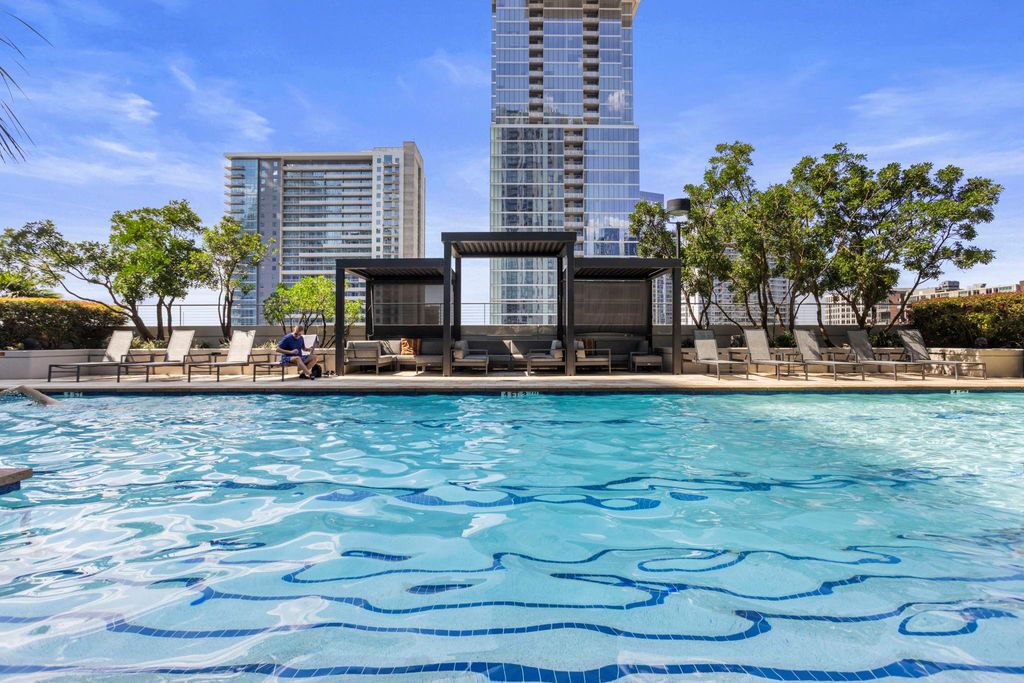 Beautiful west-facing, fully furnished condo on the 39th floor of 360 Condominiums with panoramic views of Downtown Austin and Lady Bird Lake! This updated 2 bed / 2 bath residence showcases floor-to-ceiling windows, wood flooring throughout, and designer-selected finishes. The primary suite offers a walk-in closet with custom California Closets finishes, blackout shades, dual sinks, walk-in shower, and a private balcony. Additional features include stainless Whirlpool appliances, custom cabinetry and furniture, a built-in banquette with storage, wallpaper accents, electric sunshades, and window tinting. Offered fully furnished with two great, reserved parking spaces near the elevator on P5. Residents enjoy luxury amenities including two dedicated 24-hour concierge, resort-style pool deck with grilling stations, fitness center, owners lounge, and dog park. Unbeatable location"”steps to Lady Bird Lake, Hike & Bike Trail, Trader Joe's, Whole Foods, 2nd Street District, and all of Downtown Austin.