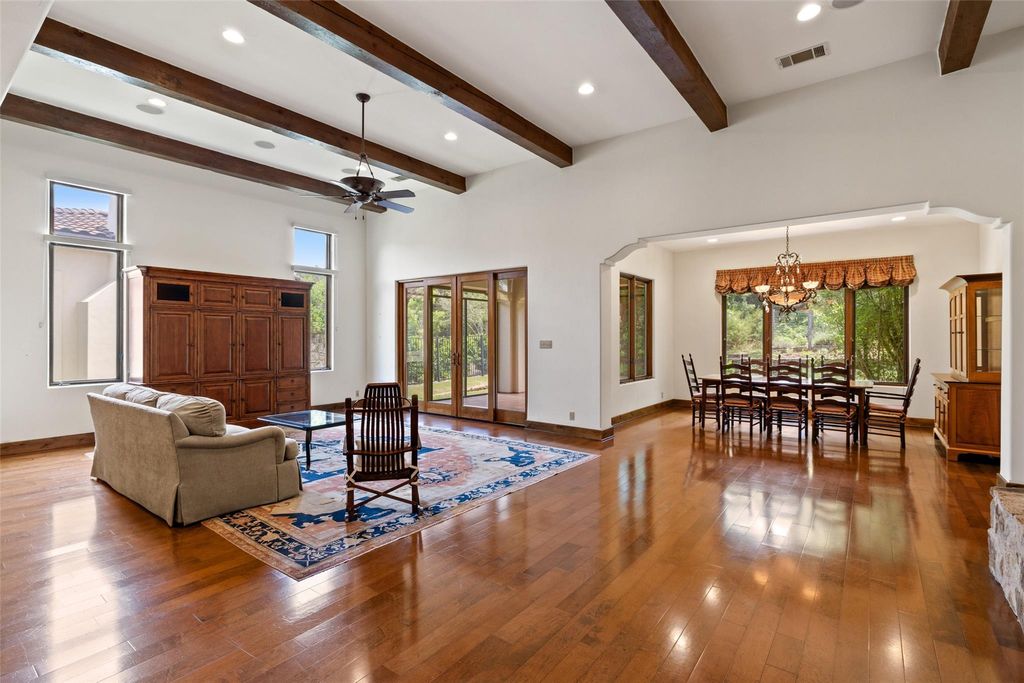 Situated within the sought-after Verde Trails enclave of the esteemed Spanish Oaks community, this lock-and-leave residence blends sophisticated elegance with the ease of low-maintenance living. The "Live Oak" floor plan is one of the architectural highlights of this limited collection"”offering striking design, spacious interiors, and a strong connection to the natural surroundings. Encompassing 2,592 square feet, this home includes three spacious bedrooms and three well-appointed bathrooms. A gracious foyer leads to the grand living room, where a charming fireplace and rich hardwood floors create a warm, inviting atmosphere. The formal dining room is framed by large picture windows on both sides, delivering a dramatic experience that showcases the surrounding greenery. The kitchen is centered around an impressive island"”ideal for both culinary pursuits and casual gatherings. Knotty alder cabinetry adds character and function, providing ample storage while complementing the overall design. Flowing effortlessly into the living room and the screened-in back porch, the space is tailored for everyday comfort and seamless entertaining. Outdoors, the architecture and landscaping of the home take center stage. An inviting courtyard surrounds an elevated patio set amidst luscious native landscaping, offering privacy and serenity. The screened-in back porch overlooks a peaceful greenbelt, creating a perfect setting for morning coffee or evening relaxation. Strategically positioned near the eastern entrance of Spanish Oaks, Verde Trails is an exclusive community of only 20 unique luxury garden homes. Residents enjoy unmatched access to Spanish Oaks' premier amenities, including one of Texas' top private golf clubs, a resort-style Pool Pavilion with summertime café, pickleball and beach volleyball courts, miles of hike and bike trails, community parks, 24/7 manned gate security, and access to award-winning Lake Travis ISD schools.