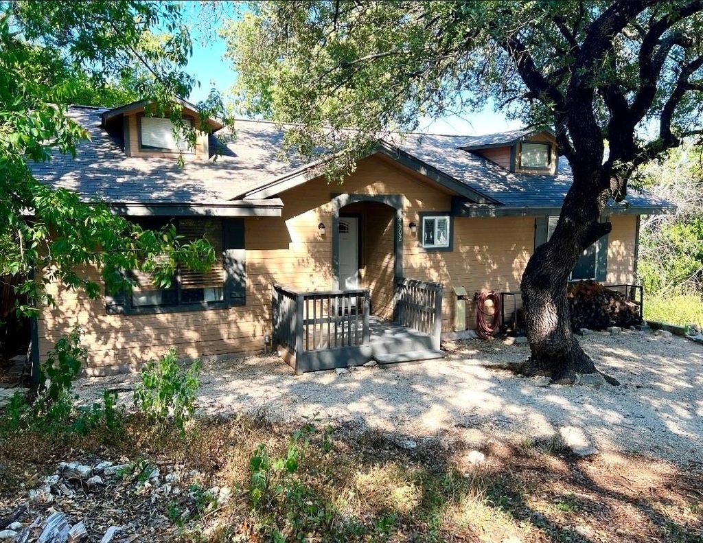 Have you ever imagined living in a light and airy treehouse by the lake? NOW is your CHANCE! This 3-bedroom 2 bath 1688 sq ft beauty is nestled in the trees on a hillside near Lake Travis with a large great room suspended over the hillside giving that true treehouse vibe. The convenient kitchen opens to the family/dining room as well as the great room. Enjoy the cozy warmth of the wood-burning stove in the fall or the fabulous cross breeze through the windows and sliding doors in the spring. Crown molding, hardwoods and tile, large deck and balcony, new roof, row-garden, are just some of the other incredible features.