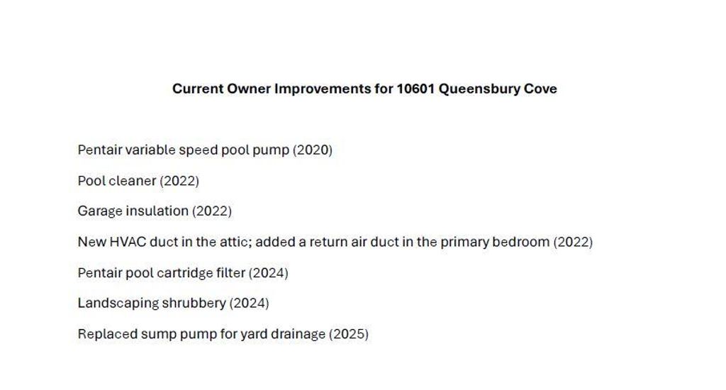 Welcome to 10601 Queensbury Cove, a stunning red brick home situated on a charming corner lot in Canyon Creek. This expansive 3,174 square foot residence offers an inviting blend of comfort and style, ideal for both relaxation and entertaining. As you step inside, you'll be greeted by a spacious 2-story foyer that leads to a formal dining room and second living area giving ample opportunities for usage depending on your needs. Set up a home gym, an office, sitting area, library, or a separate space for the kids. The options are limitless! The heart of the home is the gourmet kitchen, updated in 2016, with built-in appliances, and a beautiful center island with plenty of storage for all your kitchen gadgets. The breakfast bar and breakfast nook offer ample seating options so your guests can mix and mingle! The home boasts four generously sized bedrooms and two and a half bathrooms. The updated primary ensuite bathroom features separate vanities, a luxurious soaking tub and walk-in shower providing a serene retreat right in the comfort of your home. Outside, step into your own private oasis complete with pool, spa, and expanded flagstone patio area. The detached 2-car garage was fully insulated in 2020 and includes a separate AC unit that keeps it nice and cool. Possibilities are endless here! This home is timeless, elegant, and waiting for its new owners to fall in love. Schedule a tour today and see for yourself this beautiful home in the coveted neighborhood of Canyon Creek in North Austin! Sellers are offering $20k concessions for interested buyers!! Contact us for our preferred lender incentives too!