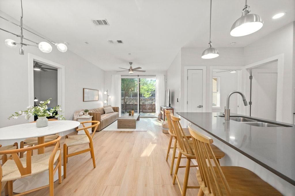 Tucked into the tree-lined community of The Denizen in 78704, Dulce Lane offers the opportunity to own a serene, design-forward residence in the heart of Austin's most coveted zip code. This 2-bedroom, 2-bath home seamlessly blends modern interiors with smart upgrades and private outdoor living. Inside, fresh paint and new flooring set a warm, inviting tone, while an open-concept layout connects the living, dining, and kitchen areas effortlessly. The generously sized bedrooms include a tranquil primary suite, which provides for a peaceful retreat. Outside, a private yard and covered patio offer space to dine, relax, or entertain under the Texas sky. The attached one-car garage, enhanced storage, and in-unit laundry add to the ease of daily life. What truly sets this home apart is its setting within The Denizen, a thoughtfully designed urban oasis that spans 3.5 acres of open green space and community amenities. From a half-acre vegetable garden irrigated by rainwater collection, to two dog parks, a sparkling pool, an amphitheater, and a community house, this is a neighborhood built for connection and balance. With downtown just minutes away, and access to trails, Zilker Park, and South Lamar's beloved eateries and shops, this is Austin living at its most inspiring.