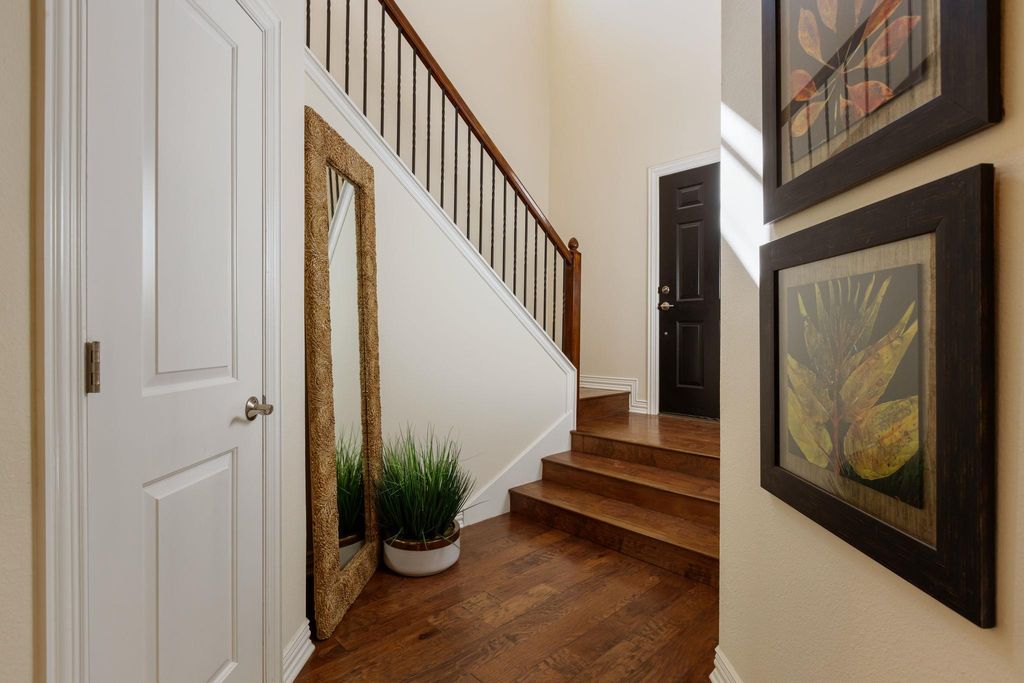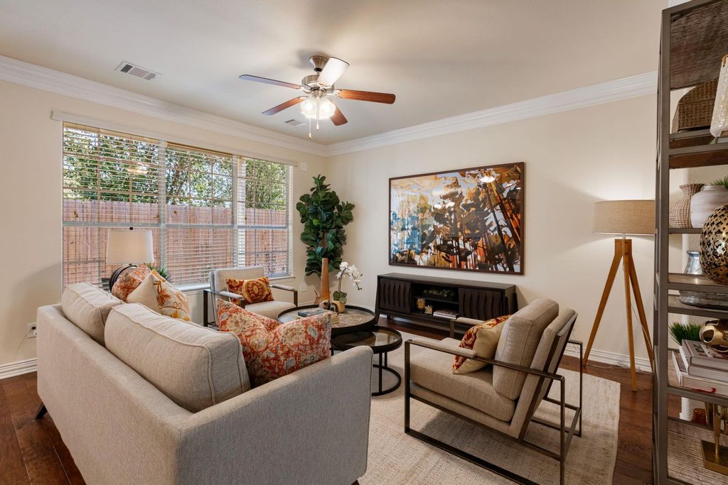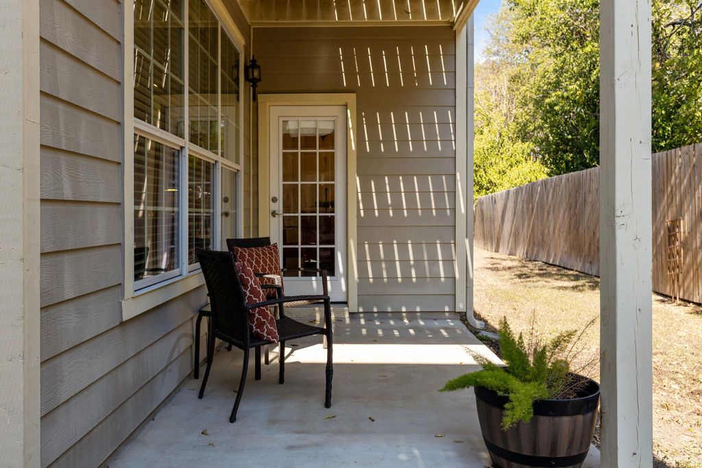Beautiful, standalone and spacious 3 bedroom/2.5 bath home in well located, private S. ATX gated Cannon Ridge neighborhood. The property has a smart floorplan with bedrooms up for privacy, living/dining/kitchen down, accented by handscraped hardwood flooring, fresh interior paint (10/2025), loads of lovely windows providing great natural light, and a complete set of all appliances that convey with the sale (including refrigerator and washer/dryer). The open concept design in the kitchen, dining and living provides great flow between these spaces -- large pantry, generous granite countertops and wonderful storage exists throughout this home. A cheery covered front and rear porch as well as a private balcony off the second-floor primary suite provide ample space to relax and enjoy the outdoors. The $300/month HOA fee covers irrigation water, gated access, common areas, and exterior maintenance, providing for a secure, true "lock and leave" lifestyle. Located just minutes from downtown Austin, ABIA, nearby shopping, dining, recreation and entertainment--it's all within easy reach. A perfect blend of charm and elegance, this welcoming home is designed for easy, modern living in the heart of Austin.