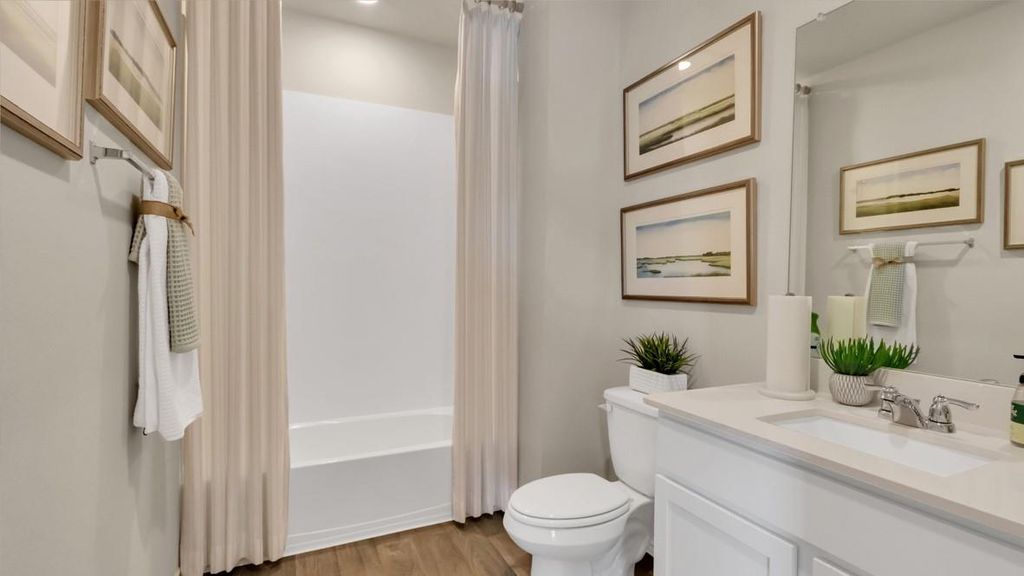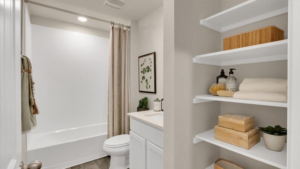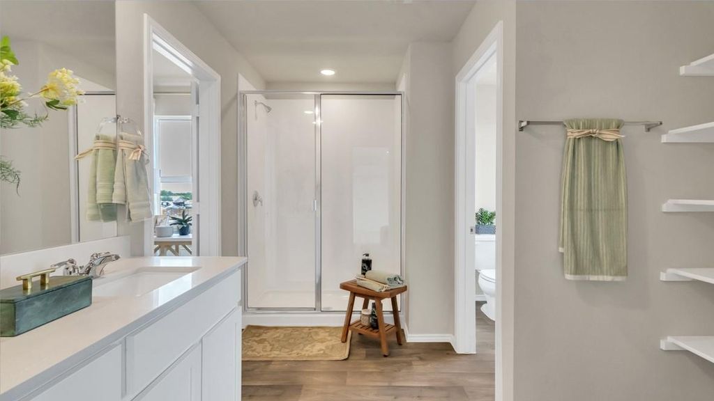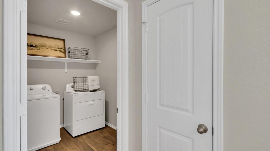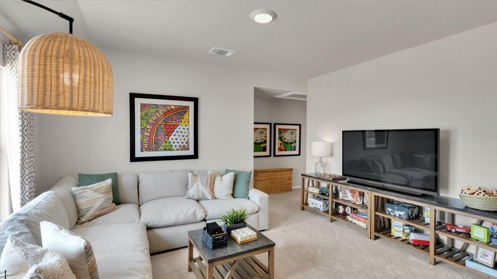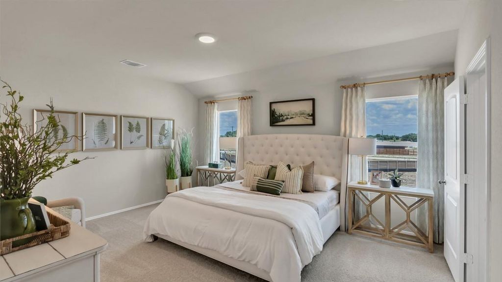 UNDER CONSTRUCTION - EST COMPLETION IN APRIL Photos are representative of plan and may vary as built. Find all the space you need in our Nicole floorplan at Durango in Mustang Ridge, TX. This two-story home offers 2,460 square feet of living space with 4 bedrooms, 3 bathrooms and an upstairs gameroom. As you enter the home, you'll find a bedroom and full bathroom with a tub. Making your way down the hall, you'll enter the open-concept living area that flows into your kitchen and dining area. The kitchen features a large island, spacious pantry, and stainless-steel appliances. Directly off the kitchen is the dining area with large windows that let in natural light and offers picturesque views of your backyard and covered back patio. Heading upstairs you'll find yourself in the spacious gameroom with an extra storage closet and large utility room attached. Two more bedrooms are also upstairs off the backside of the game room. Both rooms feature walk-in closets and share a spacious bathroom with storage space. The main bedroom is also on the second story, and features an ensuite with a luxurious walk-in shower, and a separate toilet room. You'll also be impressed by the expansive walk-in closet with a large window. This home comes included with a professionally designed landscape package and an irrigation system as well as our America's Smart Home® package that offers devices such as the Qolsys IQ Panel, Video Doorbell, Alarm.com app, Honeywell Thermostat, Deako Smart Light Switch, Kwikset Smart lock, and more.