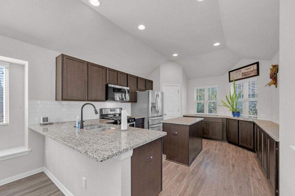 Stunning single-story home located in the highly coveted Sorento subdivision. Walk to Lake Pflugerville Lake and Park. Large open floor plan, modern kitchen with a huge granite island and stainless appliances. Wood look vinyl flooring throughout, with carpet only in the bedrooms. The primary bedroom features include 2 closets, large walk-in tile shower with benches and a double vanity. The courtyard of the home is perfect for entertaining guests. Enjoy high ceilings, recessed lighting, ceiling fans, a window seat and lots of windows. You'll love this beautiful community and convenient location. Located closed to major employers, great shopping and a new HEB. Enjoy Sorento community pool, walking and hike trails and so much more. Quick drive into Austin and Round Rock!