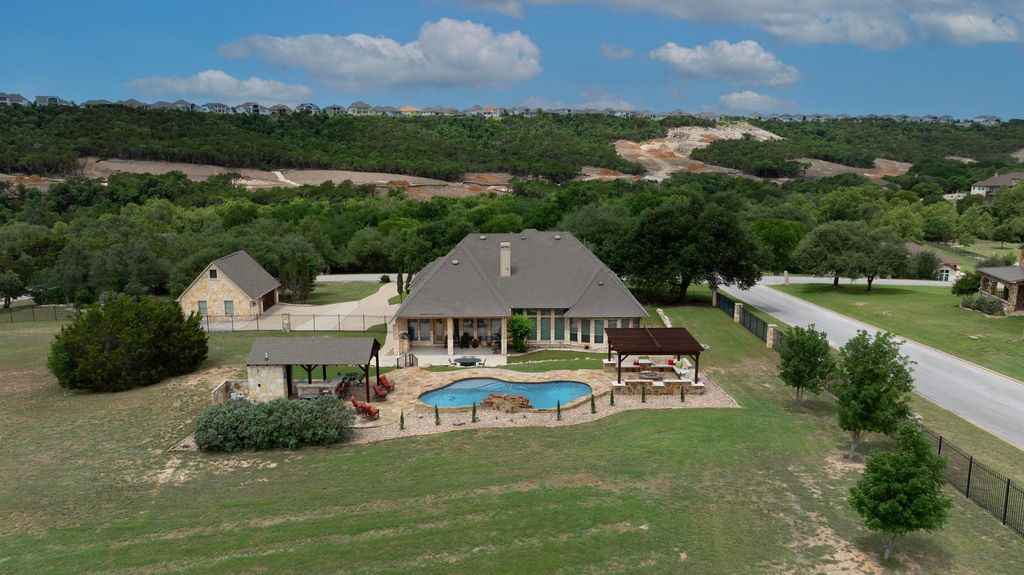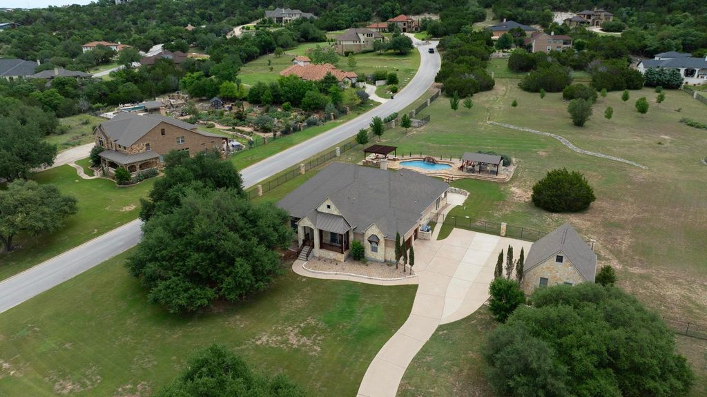 This breathtaking and spacious residence is ideally located on 4.42 beautiful acres within a beautiful Hill Country gated community. Step into the grand foyer, where towering ceilings create an inviting atmosphere that makes you feel right at home. You'll be welcomed by a spacious office adorned with French doors, while the foyer guides you toward the breathtaking formal dining room featuring elegant wood floors. The first living area awaits, offering versatility as a formal living area or game room. As you round the corner, you'll be welcomed by a spacious great room featuring 12-foot ceilings, a stunning gas fireplace, and an abundance of natural light streaming in from the floor-to-ceiling wall of windows. The spacious great room and kitchen blend seamlessly, creating an ideal environment for entertaining or maintaining connections while cooking. The primary suite boasts over 800 square feet of space, offering stunning views of the backyard. Additionally, there is a guest suite complete with its own private ensuite. Experience the outdoor paradise featuring a covered rear patio equipped with a built-in gas grill, a stunning pool adorned with a fountain, and a cabana that includes a wet bar, bath, and outdoor shower. Enjoy the spacious entertainment area under a large pergola, complete with stone benches and a gas firepit. The entire back of the property is secured by a 6' wrought iron fence, enhanced by custom white stone pillars that beautifully complement the home's design. The property boasts stunning landscaping, adorned with numerous oak trees and 18 maple trees that burst into vibrant colors each Fall. Furthermore, there is an additional two-car garage equipped with a storage loft, perfect for stowing away your off-season belongings. For equestrian enthusiasts, the Homeowners Association (HOA) permits property owners to keep a horse on the estate, thanks to the ample size of the property.