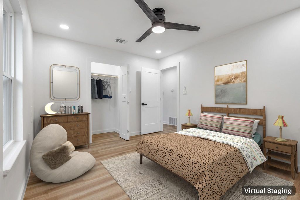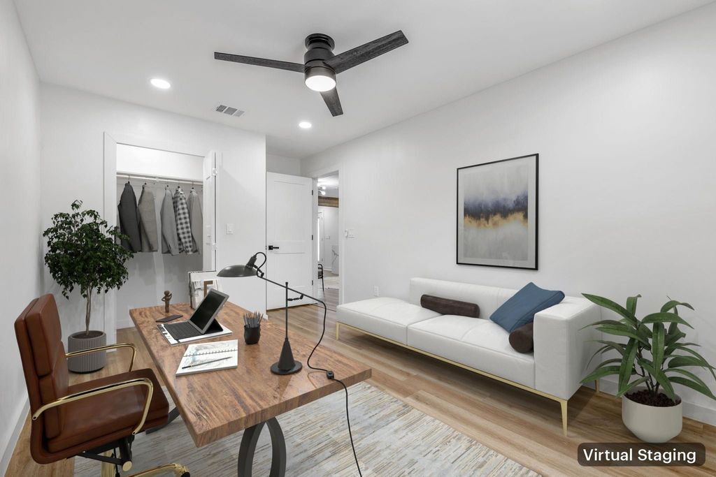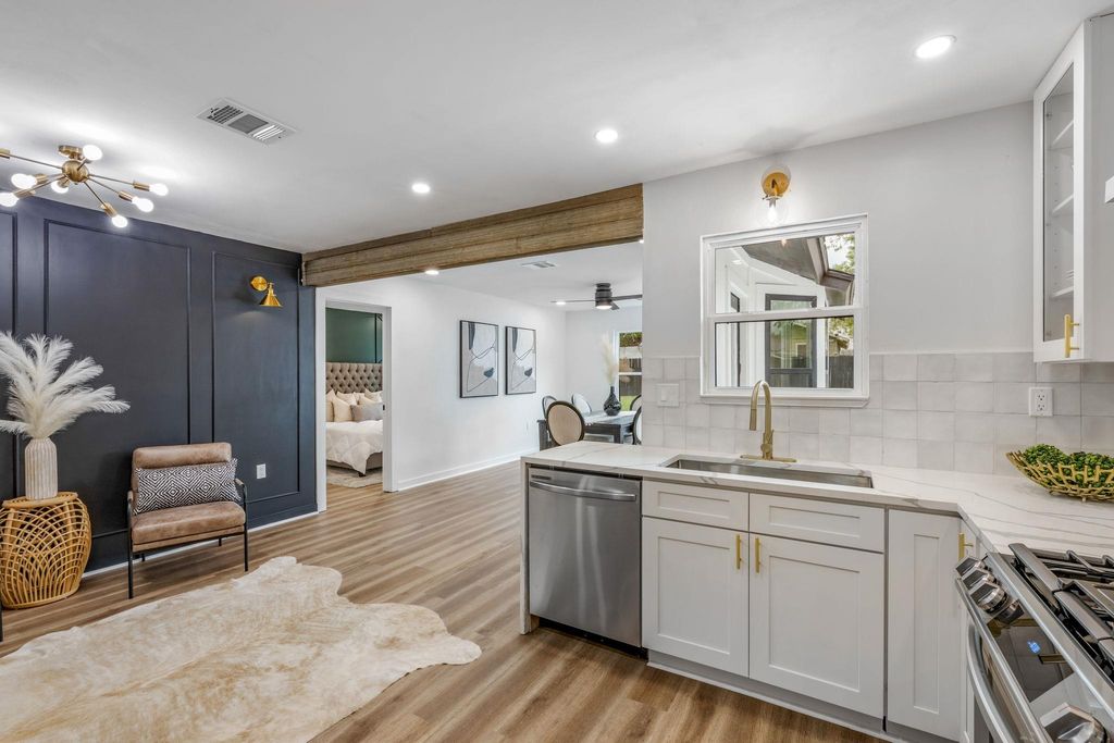 This fully transformed contemporary gem delivers the ultimate in modern living w/ every detail carefully curated for style, comfort & function. From the moment you arrive, the freshly painted exterior, updated landscaping, new driveway & inviting covered front porch set the stage for what's inside. Step through the new front door w/ smart lock into a light-filled open-concept design that feels brand new from top to bottom. Fresh interior paint, luxury vinyl plank floors, recessed LED lighting & designer ceiling fans flow seamlessly throughout. The expansive living room features a striking accent wall w/ modern sconces, creating a sophisticated backdrop for everyday living. The show-stopping kitchen is a chef's dream"”waterfall quartz counters, crisp white cabinetry w/ gold hardware, SS gas appliances, stylish tile backsplash & generous storage make both cooking & entertaining effortless. Just off the kitchen, the spacious dining area shines w/ bay windows that bathe the space in natural light. The primary suite is a true retreat, highlighted by an elegant accent wall, roomy walk-in closet & a spa-like en-suite bath showcasing bold designer tile, floating vanity & a walk-in shower w/ frameless glass. Three additional bedrooms are all generously sized & share a beautifully remodeled hall bath featuring chic finishes & modern touches. Step outside to your own Texas-size backyard"”fully fenced & ideal for gatherings of any size. A large concrete patio invites grilling & relaxing, while the matching backyard shed offers flexible use as storage, hobby room or even a private office. Peace of mind comes w/ a fully repaired foundation backed by transferable warranty, plus every upgrade is NEW except the roof. With its perfect blend of sleek design, thoughtful upgrades & a layout built for both everyday living & entertaining, this modern masterpiece is ready to impress at every turn.