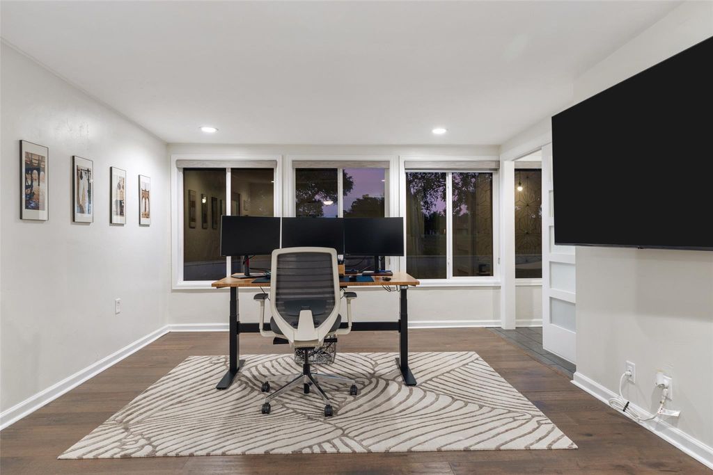 As the sun dips behind the Texas hills and golden light spills across the fairways, you'll feel the quiet magic of coming home to 915 Biscayne"”a beautifully updated single-level retreat in the heart of old Lakeway, where architectural elegance meets everyday ease. Thoughtfully reimagined, this home offers an inspired blend of natural textures, modern upgrades, and effortless indoor-outdoor living on a serene, golf course lot. Inside, soaring cathedral ceilings crown the expansive living, kitchen, and dining areas, creating a sense of volume and openness beneath a canopy of natural light. Epoxy-coated concrete floors lend an industrial-modern polish to the main living spaces, while wood floors in all bedrooms offer warmth without a stitch of carpet in sight. The kitchen is both sculptural and functional, with quartz countertops, rich cabinetry, and stainless appliances all designed to gather around. Floor-to-ceiling windows bring in treetop and fairway views, blurring the line between interior calm and exterior beauty. The primary suite is a private sanctuary with a spa-like ensuite bath, soaking tub with views, dual vanities, and a walk-in closet. Two additional bedrooms plus a versatile fourth"”ideal as a home office or gym"”offer flexible space for rest, work, or play. Both bathrooms have been tastefully renovated, with clean lines and timeless finishes. Step outside and imagine the possibilities: the backyard opens directly to the golf course and offers ample room for a future pool or outdoor living area, framed by mature oaks and gently sloping greens. A finished two-car garage, solar panels, and full MUD utilities (no septic) add both comfort and long-term efficiency. Located within acclaimed Lake Travis ISD, and close to Lakeway's parks, trails, and community amenities, this home is perfectly positioned for both tranquility and connection. Come see what it feels like to live where soaring architecture meets grounded, graceful living. Photos digitally enhanced.