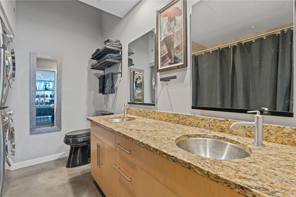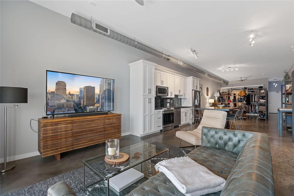 Experience the best of East Austin living at TwentyOne24 Condos, where industrial style meets smart design in this rare studio with two full bathrooms"”a unique find at this price point. The flexible open-concept layout features soaring 11-foot ceilings, exposed ductwork, and sleek concrete floors, while a built-in shelving unit filled with wardrobe storage cleverly divides the space, offering privacy for a sleeping area without sacrificing light or flow. Floor-to-ceiling windows flood the space with natural light and open to a private patio with city skyline views"”perfect for morning coffee or winding down under the stars. The kitchen is outfitted with stainless steel appliances and granite countertops, and both bathrooms offer modern fixtures and finishes for added convenience and comfort. Modern tech upgrades include a Google Nest thermostat for smart climate control, an August Lock system for app-based keyless entry, and Google Fiber availability for high-speed connectivity"”ideal for work-from-home or streaming. Nestled at the quieter end of East 6th Street, this unit puts you steps away from beloved local spots like Fleet Coffee, Suerte, and Ramen Tatsuya, and just a short stroll from the Saltillo Plaza MetroRail station. The Lady Bird Lake hike and bike trail is also nearby, offering a scenic escape right in the heart of the city. Target, Whole Foods, and the downtown entertainment district are just minutes away. Additional highlights include gated parking with one assigned space, secure entry, elevator access, and a low HOA fee. Whether you're looking for your first home, a weekend retreat, or a stylish live/work space, this condo offers unmatched access to one of Austin's most vibrant neighborhoods.
