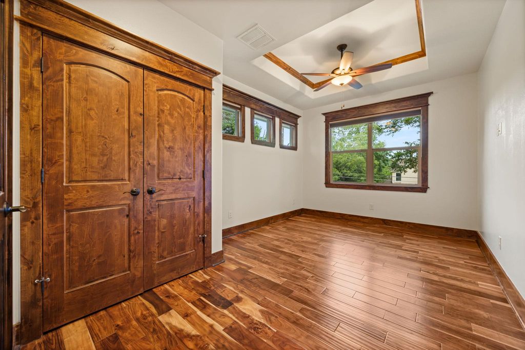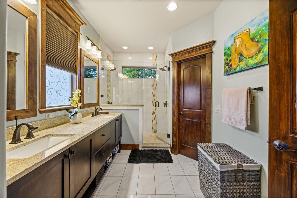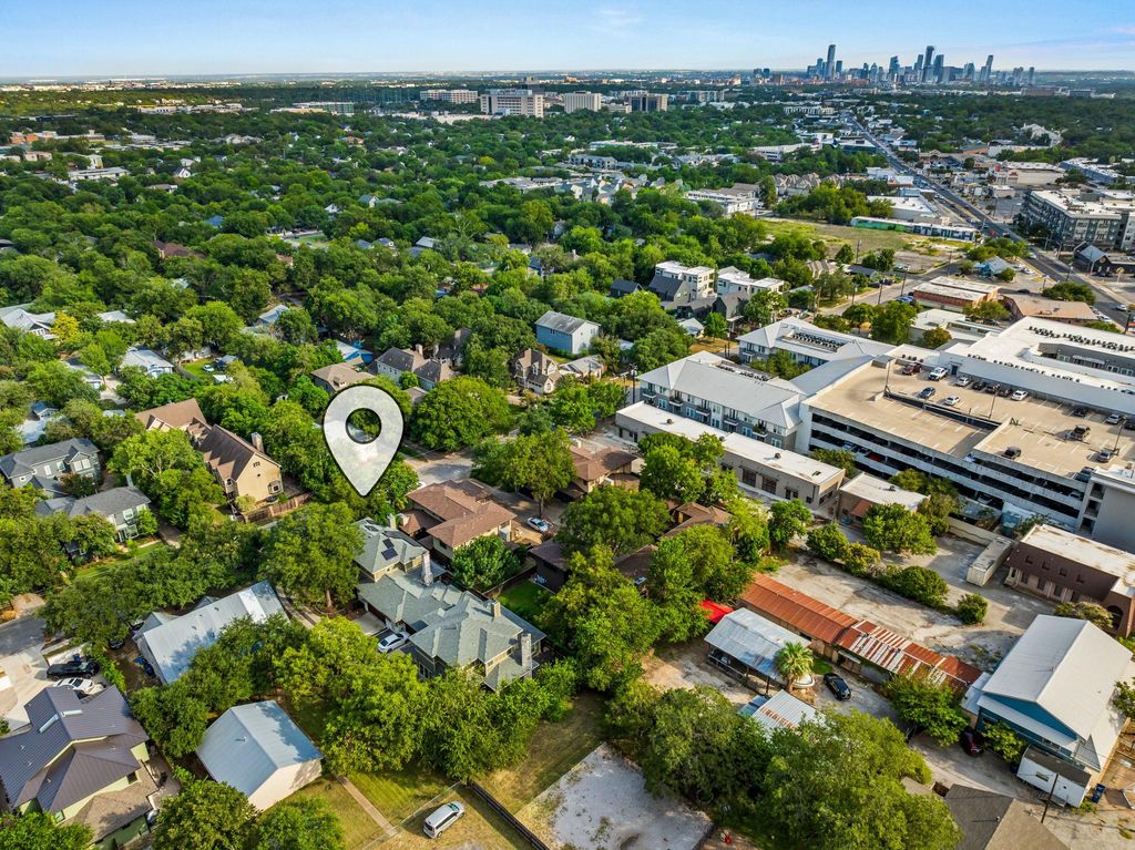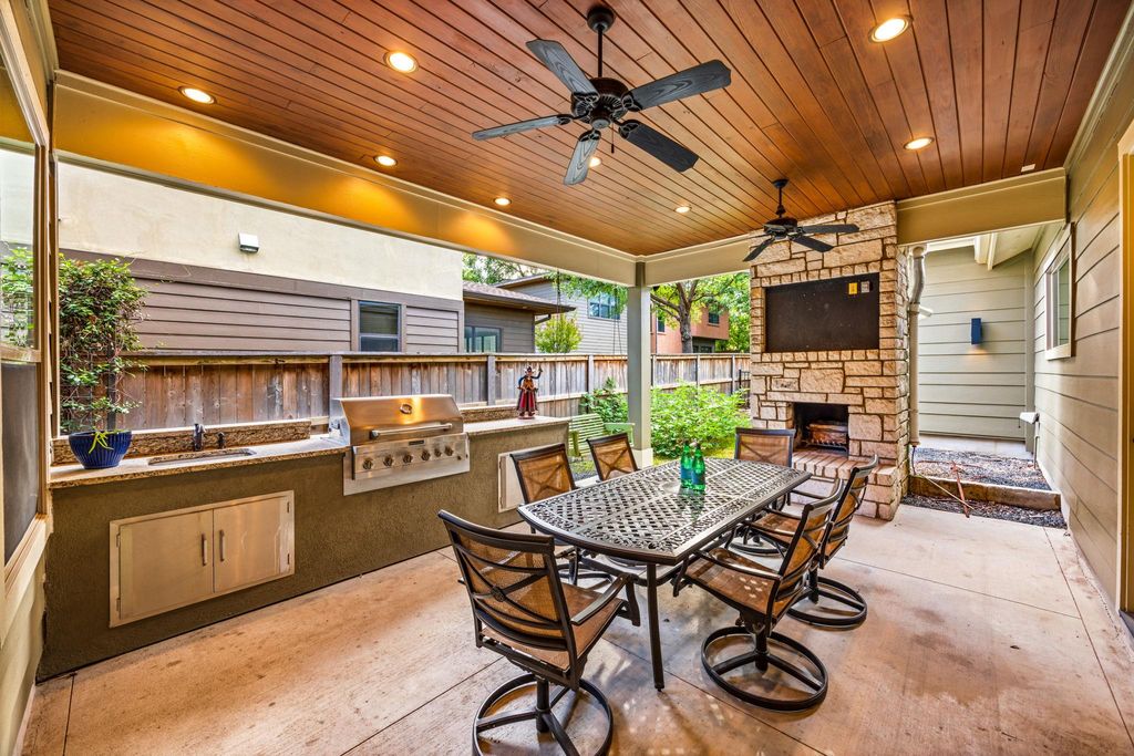 Stunning 4-bedroom, 3-bathroom home nestled in the heart of Brentwood, one of Austin's most sought-after neighborhoods. This thoughtfully designed two-story residence offers a versatile layout with a full guest suite and bath on the main level - ideal for guests or multigenerational living. The spacious open floor plan is filled with natural light, enhanced by walls of numerous windows, rich wood floors, natural stone accents, and warm natural wood trim throughout. A native stone fireplace anchors the inviting living room, which flows seamlessly onto a covered patio with a second wood-burning fireplace and outdoor kitchen setup - perfect for year-round entertaining. The chef's kitchen is the heart of the home, featuring a large center island with breakfast bar, granite countertops, full-height backsplash, gas cooking, and a walk-in pantry. The adjacent dining area is accented with matching stonework for a cohesive, organic aesthetic. A custom open staircase with modern railing leads upstairs, where you'll find the luxurious primary suite complete with coffered ceiling, dual vanities, and a walk-in shower with dual rainfall shower heads. Energy efficiency is a highlight, with tall ceilings, solar panels, and excellent insulation throughout. The oversized 2-car garage offers ample storage and is the only shared wall with the neighboring home - no HOA dues! Enjoy the serene outdoor space with mature pecan trees, a fully fenced yard with wrought iron and wood, covered outdoor kitchen area, 250-gallon water tank, and an automatic sprinkler system. Recent updates include a new roof (Jan 2024) and fresh paint (June 2024). Centrally located near top-rated restaurants, shopping, parks, and entertainment, this home combines natural beauty, smart design, and urban convenience in one unforgettable package.