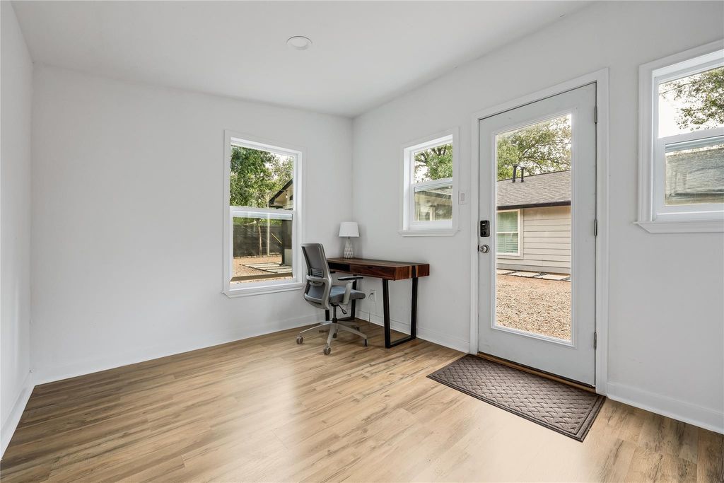 Welcome to this charming, single-story home in this hidden gem of a neighborhood. Built in 1961,this move-in ready home blends modern updates with classic appeal. From the gorgeous curb appeal in front, to the functional and relaxing back, prepare to be WOW'd at every step. Step inside and notice the natural light flooding the open kitchen/living/dining space. The kitchen went through a full remodel and features Whirlpool Gold appliances, solid wood cabinets, butcher block counters, and a renovated pantry. Each of the three spacious bedrooms feature a closet with ClosetMaid shelving, while the primary suite boasts outdoor access to the backyard. The bathroom went through a renovation in 2023 featuring a new walk-in shower and dual vanities. Outback, you'll enjoy a screened in patio addition, complete with ceiling fan - perfect for those fall Austin evenings. The xeriscaped backyard also features multiple patios and seating areas, as well as a detached office (2023) and detached Tuff storage shed (2017). Additional upgrades include: new roof/gutters (2025), water heater (2024), shutters on all windows (2018). Lennox AC/heater with new ductwork and WiFi thermostat (2017). Windows upgraded to Simonton Prism Platinum (2016); James Hardie R-3 foam-backed siding and seamless 6" gutters (2016), Laundry/mud room expanded/enclosed with AC/heat and shelving (2016), Garage reno with industrial storage, epoxy floor, vented for AC/heat"”ideal for conversion (2015), Terminix termite system (2017), upgraded living room doors incl. sliding glass (2017), drainage line replaced (2012). This hidden gem offers easy Mopac/183 access. Enjoy close proximity to Austin FC Stadium (2 mi), Arboretum/Domain (3 mi), downtown/Town Lake (15-20 min), and Pillow Elementary's new park.. Near by hotspots include El Dorado Cafe, Bartlett's, Jack Allen's, Summer Moon Coffee.