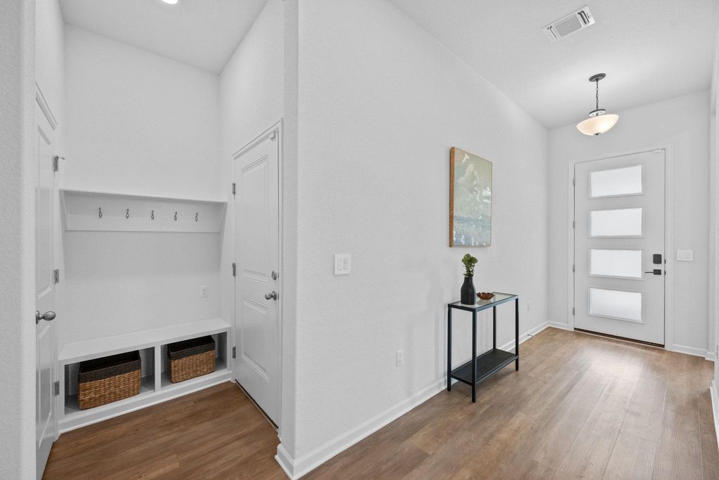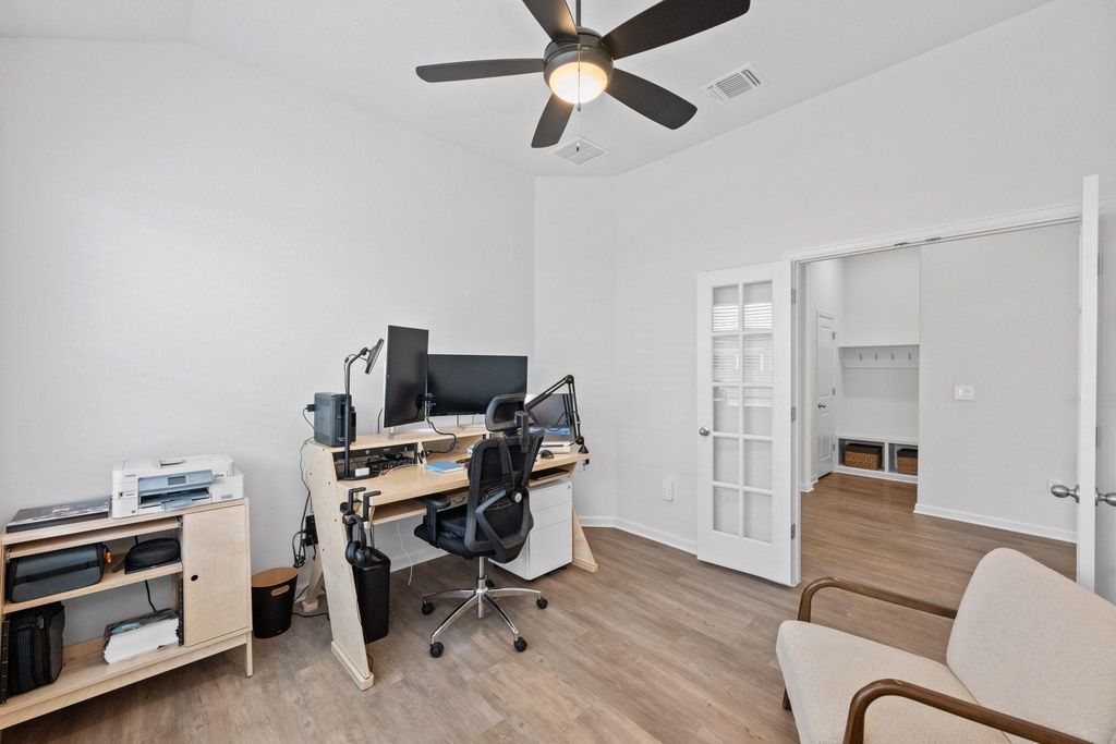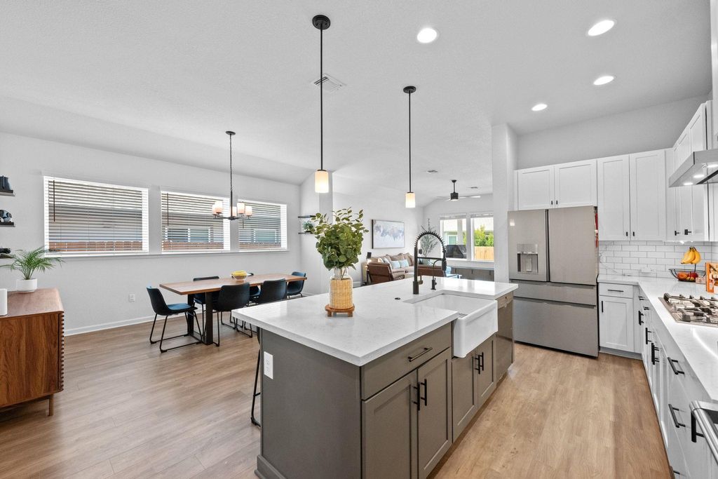 Limited time only... Initial interest rate as low as 3.625% with 3/2/1 Buydown. Ask about our Seller paid incentives. Move-in ready, this upgraded single-story home in Easton Park boasts a 50-foot lot and nearly $60K in design center upgrades. A chef's kitchen with GE Cafe appliances and a quartz-clad island anchors the open-concept layout. The private, extended owner's suite features a spa-like super shower, dual vanities, and a generous closet, while three additional bedrooms and a dedicated study/flex space provide flexibility for kids, guests, and your home office. Practical upgrades include a tankless gas water heater, gas stub on the patio, water softener loop, bidet toilets, and structured wiring. Durable luxury vinyl plank flooring spans the main living areas, and native landscaping frames the covered patio and fenced yard. Enjoy Easton Park's resort-style amenities"”clubhouse, pool, parks, trails, and community events"”just moments away.
