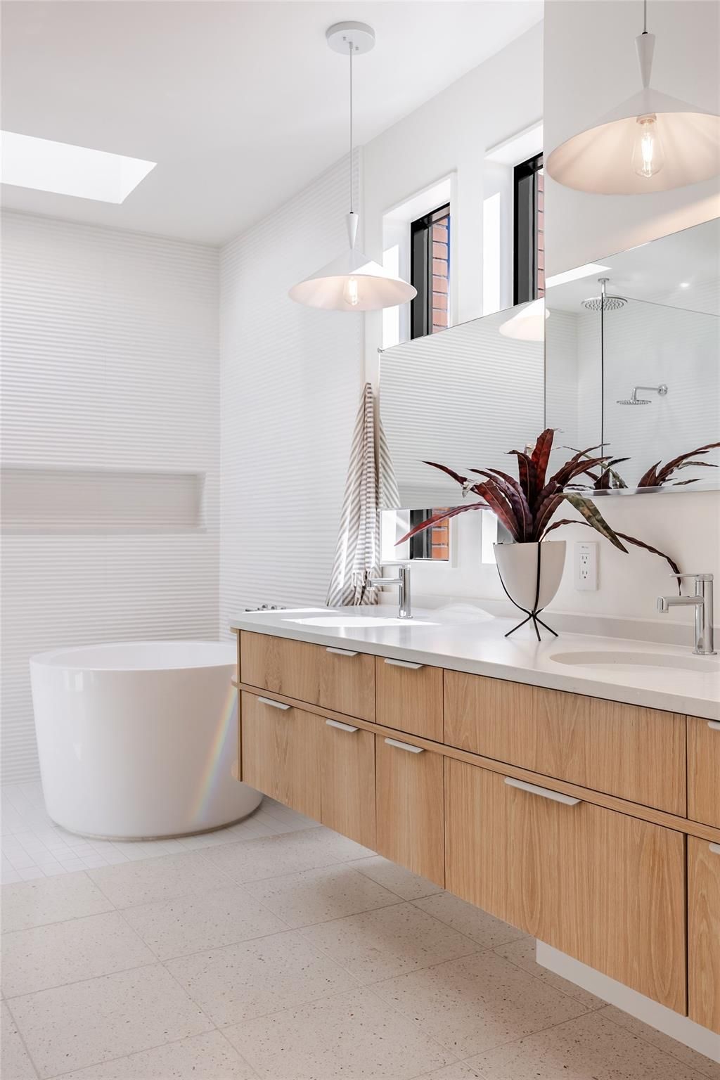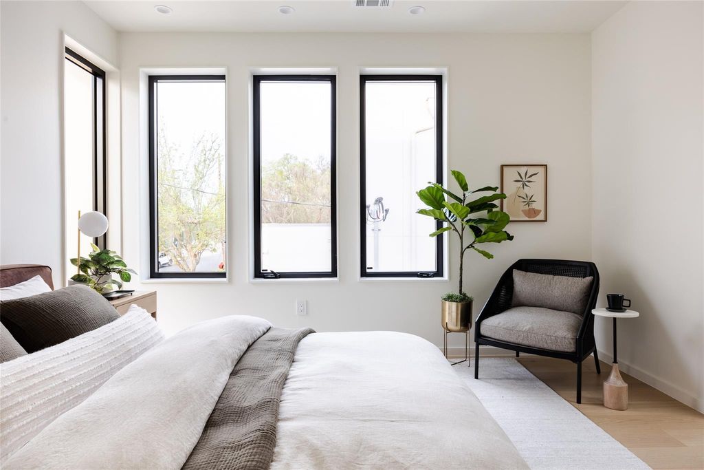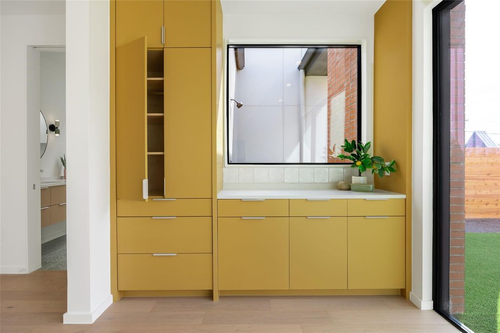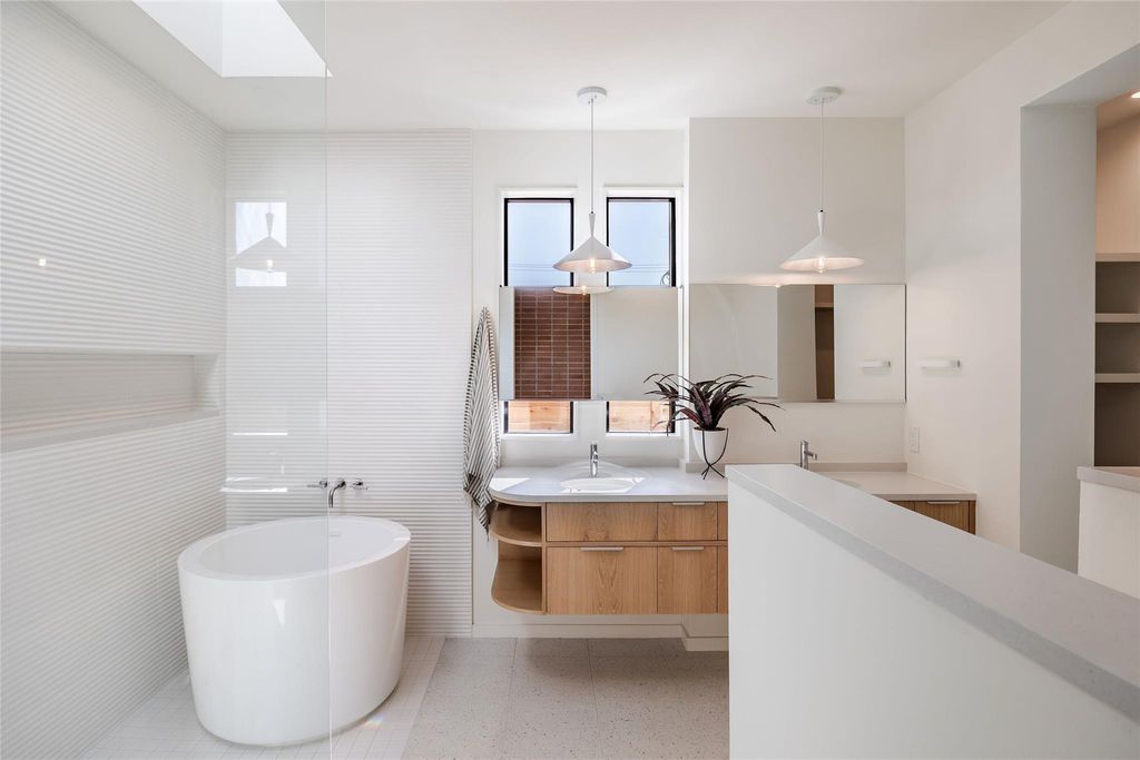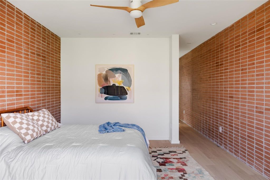 Dubbed "Ginger" by project architect North Arrow Studio with build and interior finishes by Cary Paul Studios, Ginger is a terra-cotta encased mid century modern inspired home which showcases a dynamic interplay of form and function, with exterior walls extending gracefully beyond the roofline. The terracotta brick and breeze block walls grace both the front and rear facades, seamlessly extending indoors to create feature walls in the main bedroom suite as well as the home foyer. Discover the perfect blend of convenience and charm in this prime Allandale property, just a short walk from local favorites like Voodoo Donuts, Little Longhorn Saloon, Eastside Pies, The Peached Tortilla, Little Woodrows, and Fonda San Miguel. Enjoy stroll-friendly streets, access to top-rated schools, and easy proximity to the vibrant Burnet Road. The main home features 4 bedrooms and 3.5 baths, while a detached 2-car garage includes a guest cabana with a flexible space suitable for a bedroom or office, complete with a full bathroom. The two structures are connected via a fully landscaped yard with xeriscape and drought proof turf with a spacious modern pool accented by a huge brick feature wall and a hidden outdoor shower. The spacious kitchen is a culinary enthusiast's dream, featuring a large oak island accented with clay imports tile on the backsplash. Top-of-the-line appliances include a panel-ready fridge and dishwasher, with a cooktop cleverly integrated into the island, complemented by a minimalist ceiling-mounted vent. A delightful powder bath showcases custom cement tile, adding a touch of fun and character. Boutique custom cabinetry and tile can be found throughout. The primary bedroom boasts an en suite bath with a luxurious Japanese soaking tub, a spacious walk-in shower, and a double floating vanity. Large steel accordian door units throughout the home bring in a flood of natural light and accentuate the indoor outdoor living.