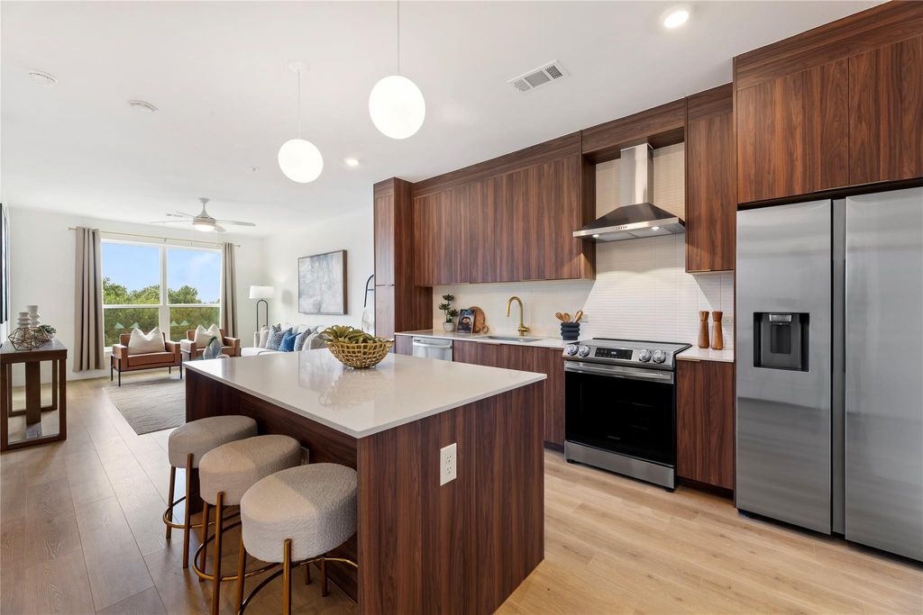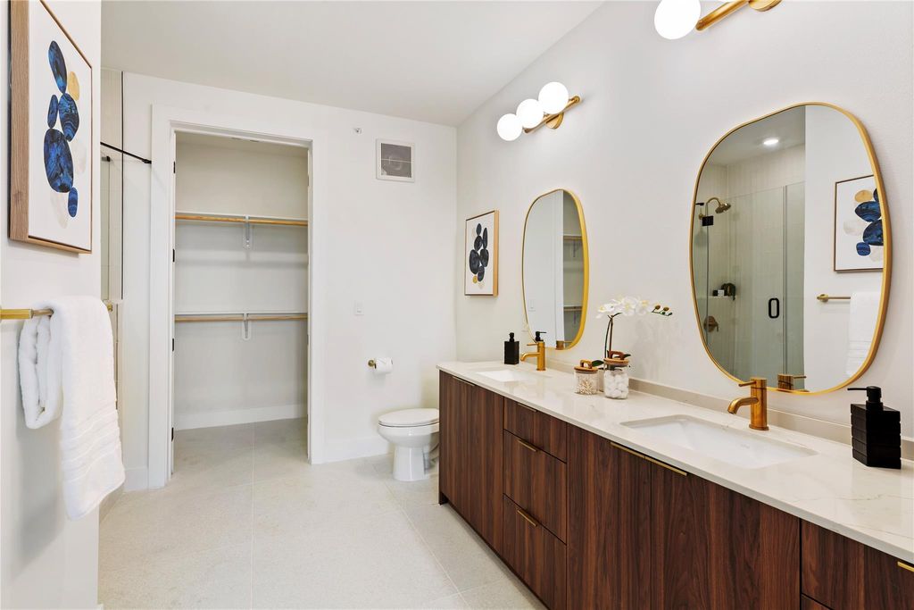 Looking for a beautiful park view while being in a walkable neighborhood? Look no further than Parkside at Mueller and enjoy waking up with your direct view of Mueller Lake Park and even part of the downtown skyline! This area was once Austin's first airport, and now this neighborhood is flying high as one of Austin's most desirable areas where you can live, work, and play. Located directly across from Mueller Lake Park, this is the ONLY 2 bedroom layout in the building with direct park views from every window! Warm walnut-toned cabinetry is accented with brass handles and hardware, while being topped off with Carrera marble-style Quartz countertops. A full Samsung appliance package compliments your culinary adventures, while the open layout is perfect for entertaining. Stretch out with the primary bathrooms dual vanities and walk in shower, while the spacious closet is ready to house all your apparel. Two standard sized assigned parking spaces are conveniently located right around the corner in the parking garage. There are so many amenities to enjoy within the building! Get a workout at the fitness center with Peloton Bikes, or lounge in the Clubhouse. Grab a cabana at the resort style pool while you grill at the outdoor kitchen. Then wrap up by the firepit on the rooftop terrace featuring breathtaking views of Mueller Lake and downtown Austin! Are you ready to call Parkside at Mueller home!