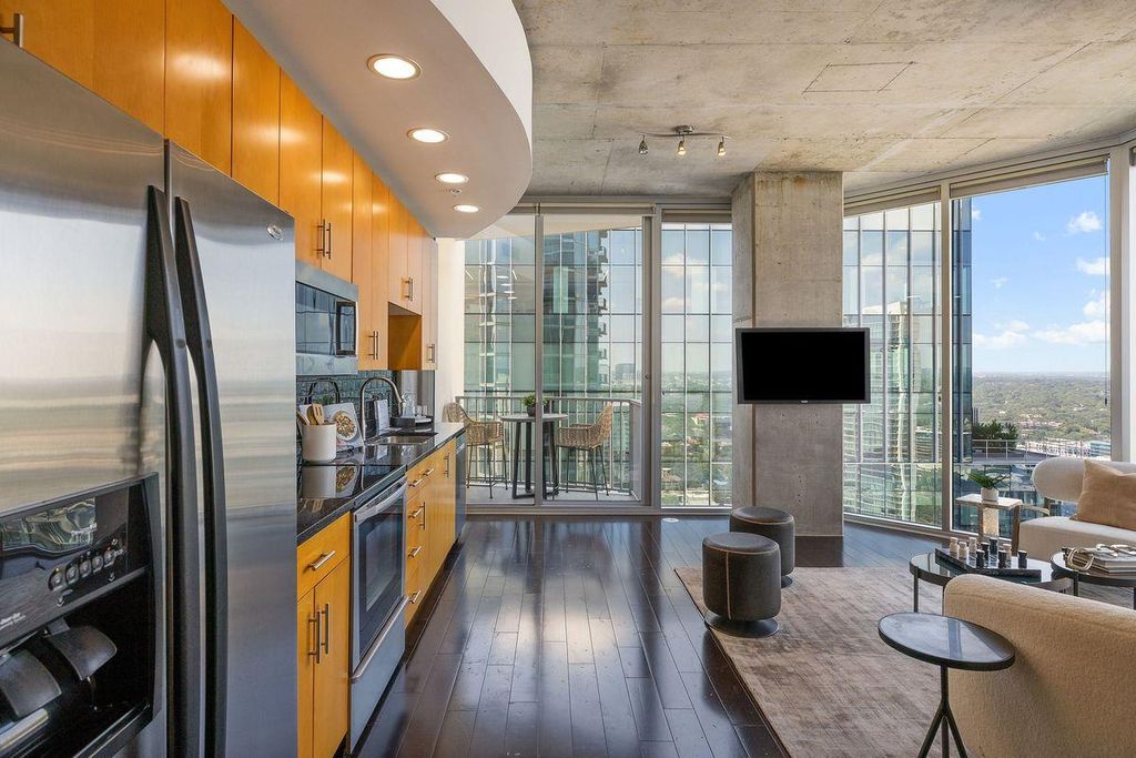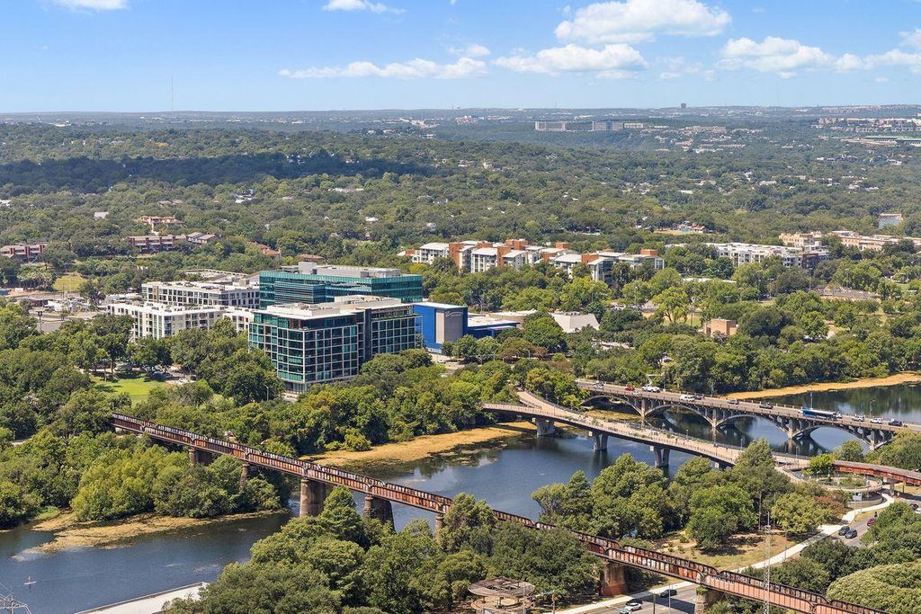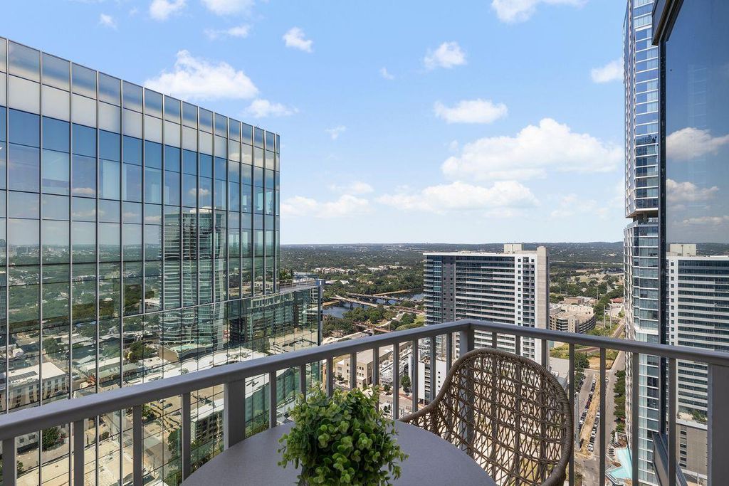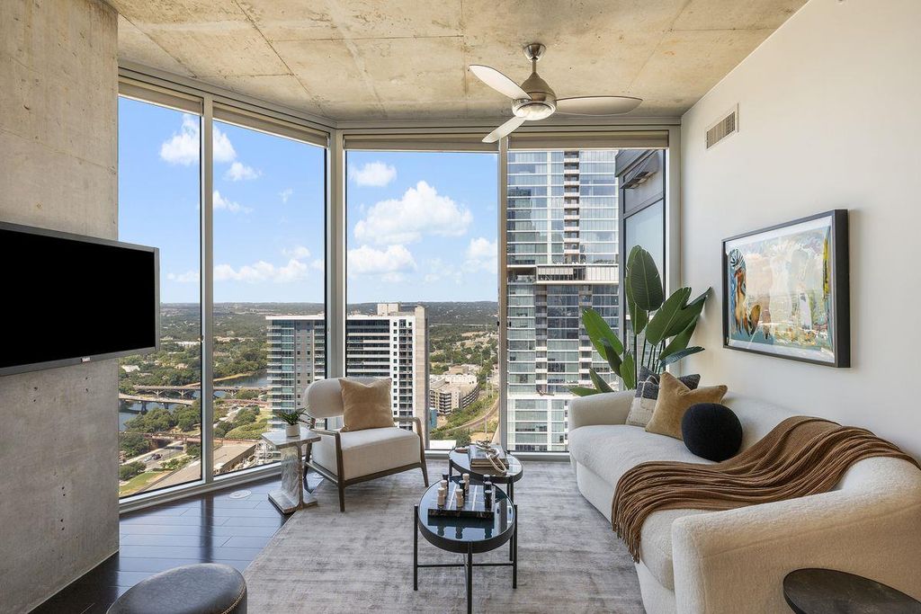 Experience elevated downtown living in this highly sought-after southwest-facing corner unit. Perched on the 32nd floor of the iconic 360 Condominiums, this residence features floor-to-ceiling windows in every room and two private balconies, offering spectacular views of Austin's city skyline, Lady Bird Lake, and beautiful sunsets over the Texas Hill Country. This coveted 2-bedroom, 2-bath corner end delivers some of the best vantage points in the entire building, with a perfect blend of urban energy and natural beauty. Freshly painted and impeccably maintained, this bright and open layout is ideal for both daily living and entertaining. The oversized primary suite includes a generous footprint with space for a sitting area or dedicated work nook, with space that adapts easily to work, rest, or retreat. The 360 is known for its unbeatable location and top-tier amenities, including a resort-style pool deck with full lap swimming lanes, grilling stations, a full-size fitness center overlooking the pool and patio, a club room, media lounge, dog park, and a 24-hour concierge. High-speed internet is included in HOA dues. This unit also comes with two premium garage parking spaces. Situated in the heart of downtown Austin, you're steps from Lady Bird Lake and the Hike and Bike Trail with a pedestrian path that takes you straight to the trail. Trader Joe's, Whole Foods, the 2nd Street District and an endless array of incredible restaurants and shops are all within blocks at this highly walkable location. Live above it all and feel connected to everything.