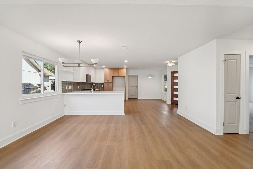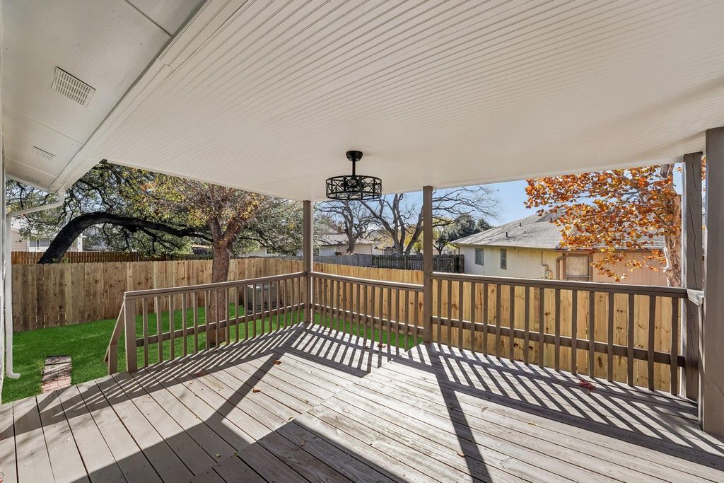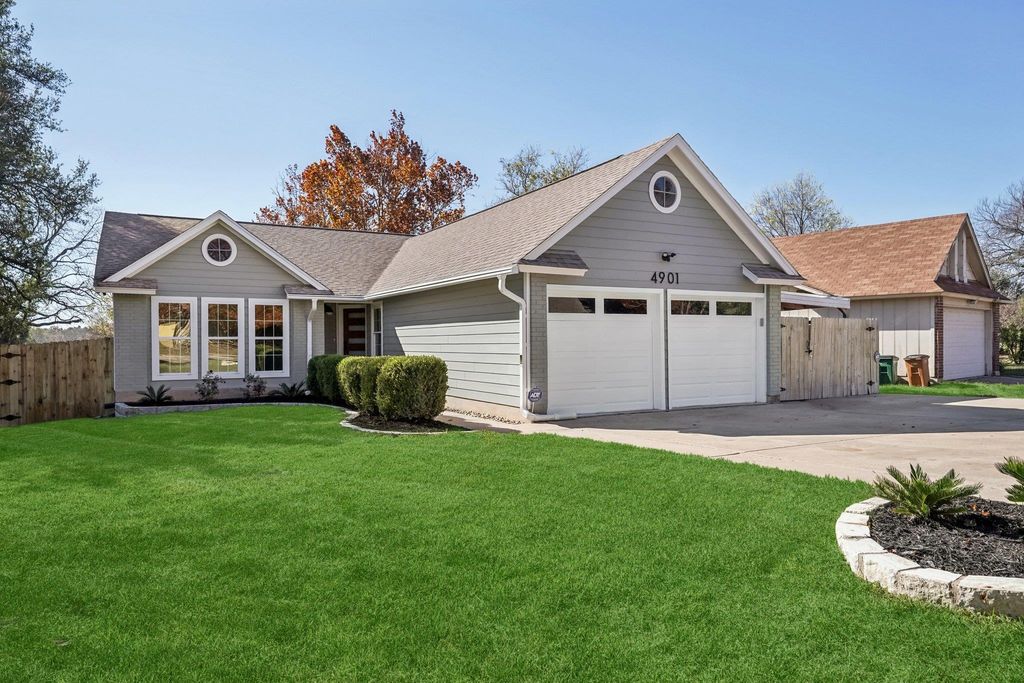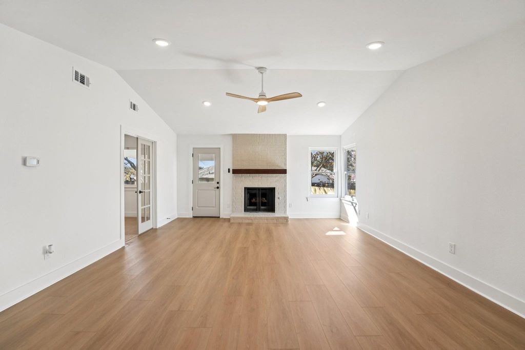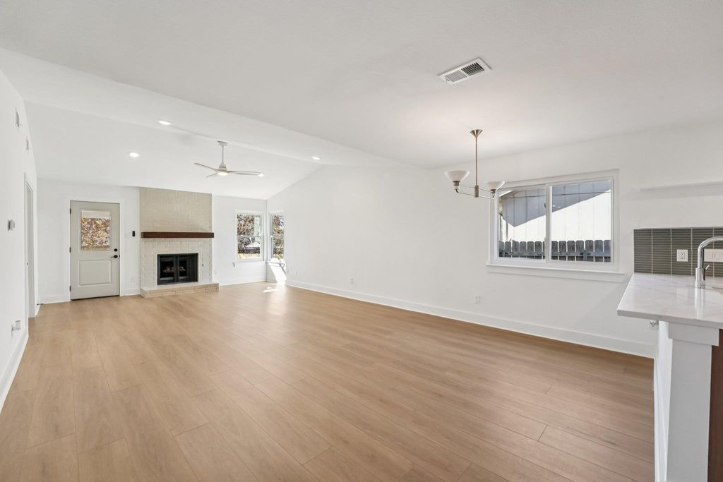 Beautifully renovated, move-in-ready home in North Austin with a modern, open-concept design and thoughtful upgrades throughout. The spacious main living area features vaulted ceilings, recessed lighting, a ceiling fan, and a cozy fireplace that anchors the room while maintaining a clean, contemporary feel. The designer kitchen is a standout with two-tone cabinetry, quartz countertops, a sleek tile backsplash, stainless steel appliances, and a large peninsula ideal for everyday living or entertaining. The layout flows seamlessly into the living and dining areas, creating an inviting and functional space. Bedrooms are light and comfortable with new carpet, modern ceiling fans, and neutral finishes that suit a variety of styles. Bathrooms have been tastefully updated, including a primary suite with a double vanity, modern fixtures, and a glass-enclosed shower. Additional highlights include updated lighting, hardware, flooring, and finishes throughout, along with a well-maintained exterior and private yard. This home offers a rare combination of thoughtful design, quality renovation, and turnkey convenience in a desirable North Austin location.
