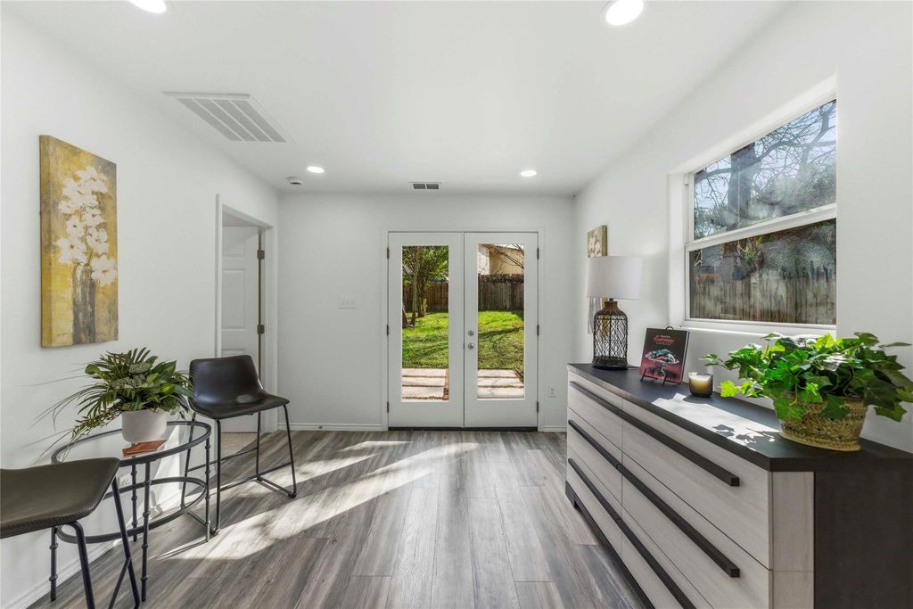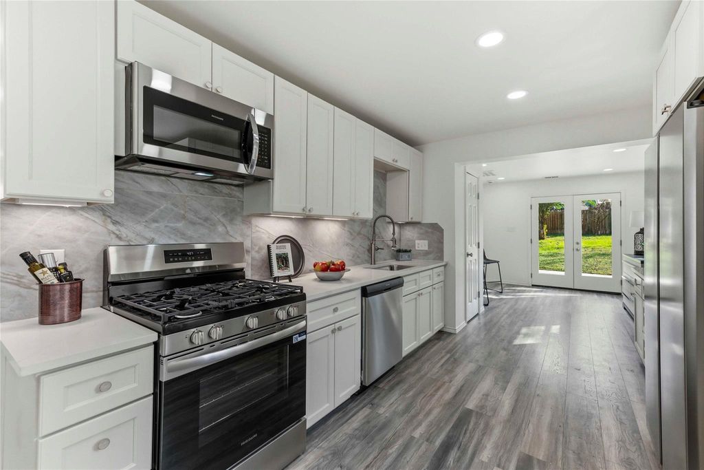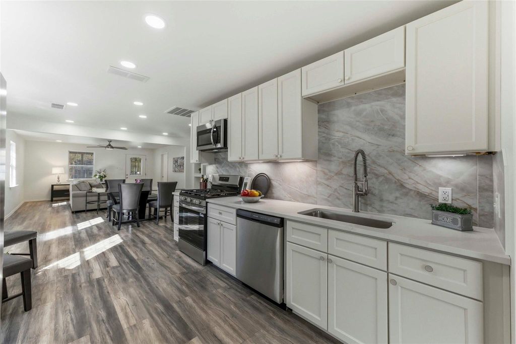 Open the door to this wonderfully renovated home and you will want to move right in! The inviting covered front porch sets the stage for this amazing interior. The bright, open & full of light floor plan gives you lots of flexibility! In the huge living room you can arrange your furniture many ways. The dinning area comes complete with built in shelving and a modern fireplace that has many settings for heat & lighting. This updated functional kitchen has all new stainless steel appliances, lots of durable quartz countertops, loads of cabinets with under cabinet lighting plus a double door fridge. Many uses for the room off of the kitchen with double french doors leading to the entertainment size backyard which also has a fenced in storage shed. Back inside you will find a private primary suite with a sitting area & private bathroom with a luxury shower! You will find more spacious bedrooms with modern ceiling fans & great closets that share a fully renovated bathroom. There is also a front bedroom that has it's own bathroom with fancy fixtures, designer lighting, & a walk-in closet. New fridge, new washer & dryer stay! Come see for yourself all the extra features. Close to Schools, Community Center, Library, & park. It's easy to get anywhere from here. Don't miss this opportunity!