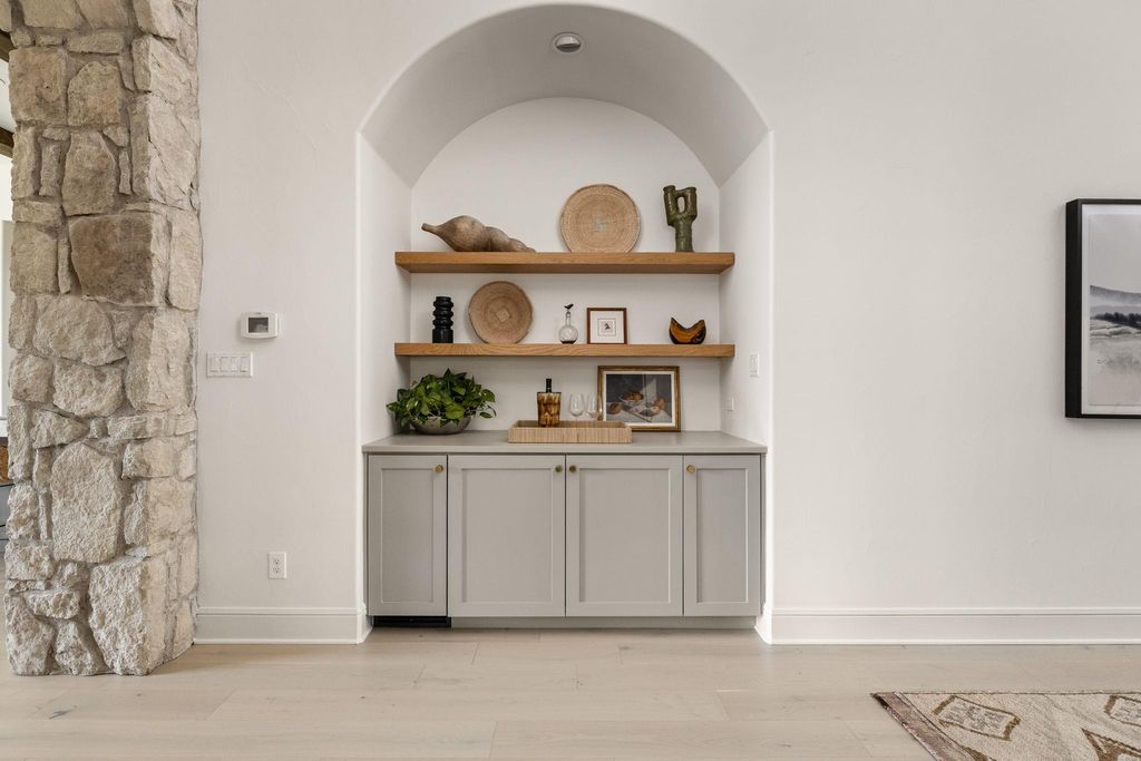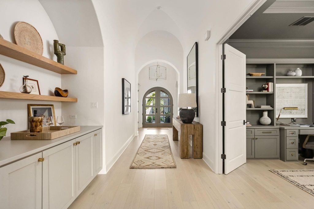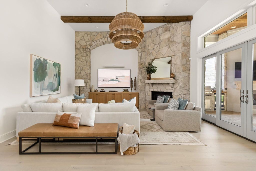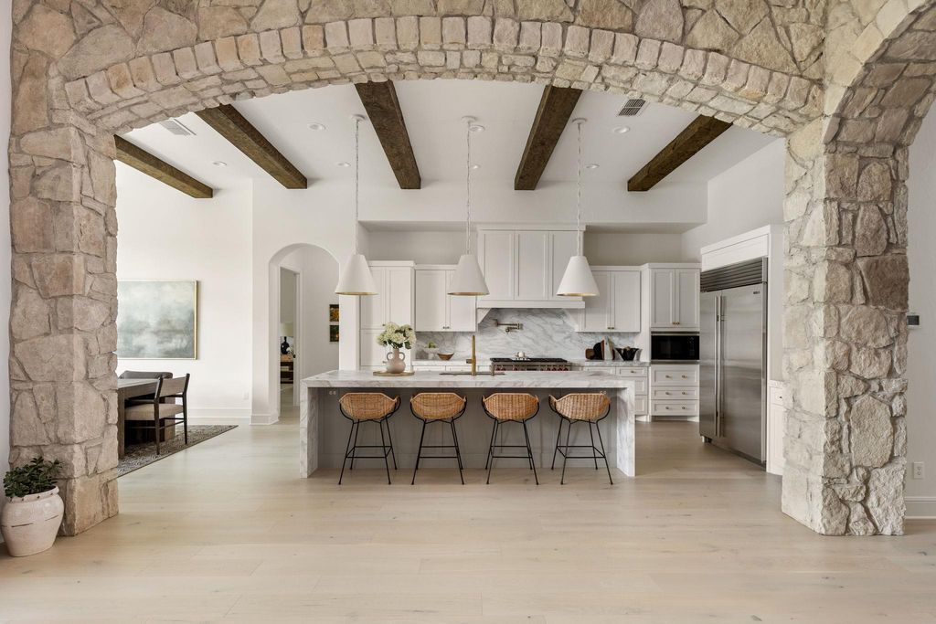 Tucked within the private gates of The Canyons section of Amarra in Barton Creek, this single-story residence offers privacy, elegance, and effortless Hill Country living. With sweeping views of the Fazio Canyons Golf Course, the home combines classic architecture with thoughtfully selected modern features. Designed for both comfort and entertaining, it offers three spacious bedrooms, each with an en suite bath, along with a dedicated office and powder room. At the heart of the home, a striking marble waterfall island anchors the kitchen. Professional-grade Wolf and Sub-Zero appliances, custom cabinetry, and a full-height marble backsplash create a space that is both functional and visually impressive. Brass fixtures and stylish pendant lighting add warmth and character, while wide-plank wood floors carry a sense of continuity into the surrounding living areas. The open living space is framed by soaring ceilings with exposed beams and a dramatic stone archway, leading to a wall of glass doors that fill the interior with natural light and open to the outdoor patio. Ideal for relaxing or entertaining, the covered patio includes a fireplace, built-in BBQ, and room for dining alfresco. The primary suite enjoys a private setting and features a spa-like bath with dual closets, a walk-in shower, and a soaking tub. The two-car garage and gated location provide security and ease, while the home's access to Barton Creek's club amenities and proximity to downtown Austin complete the offering. This is a rare opportunity to own a meticulously maintained home in one of Austin's most sought-after golf course communities.