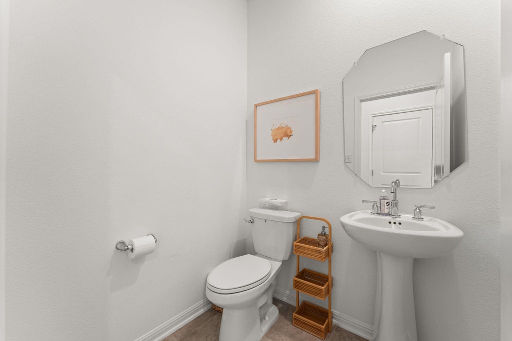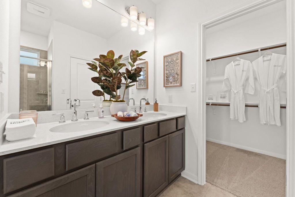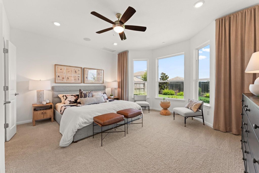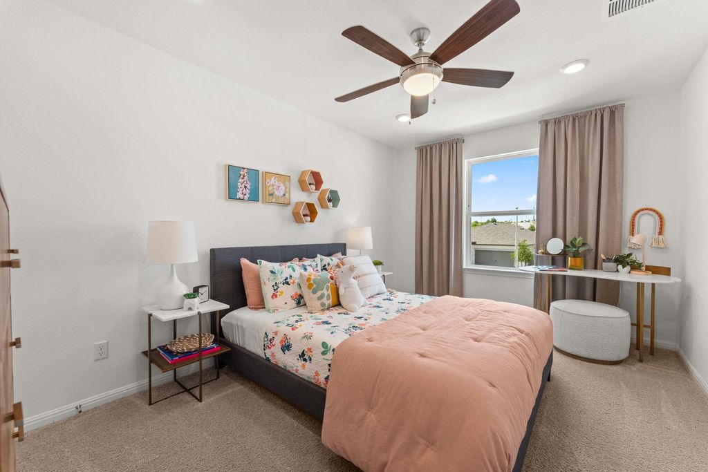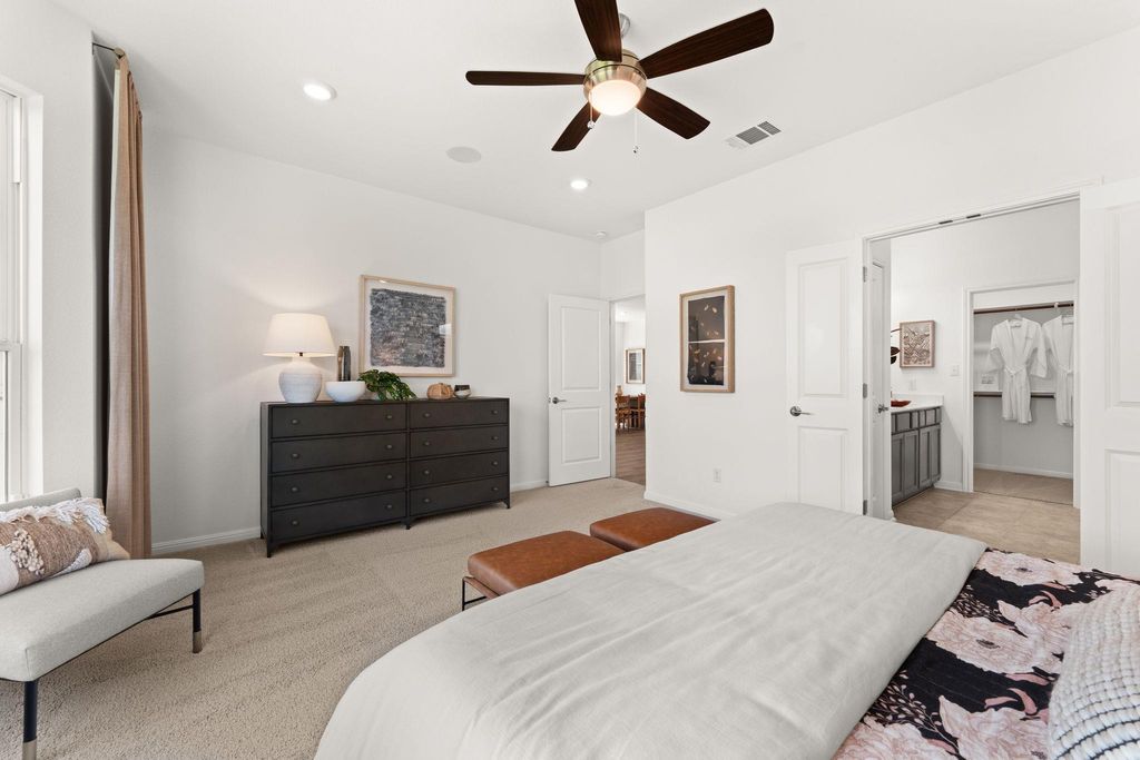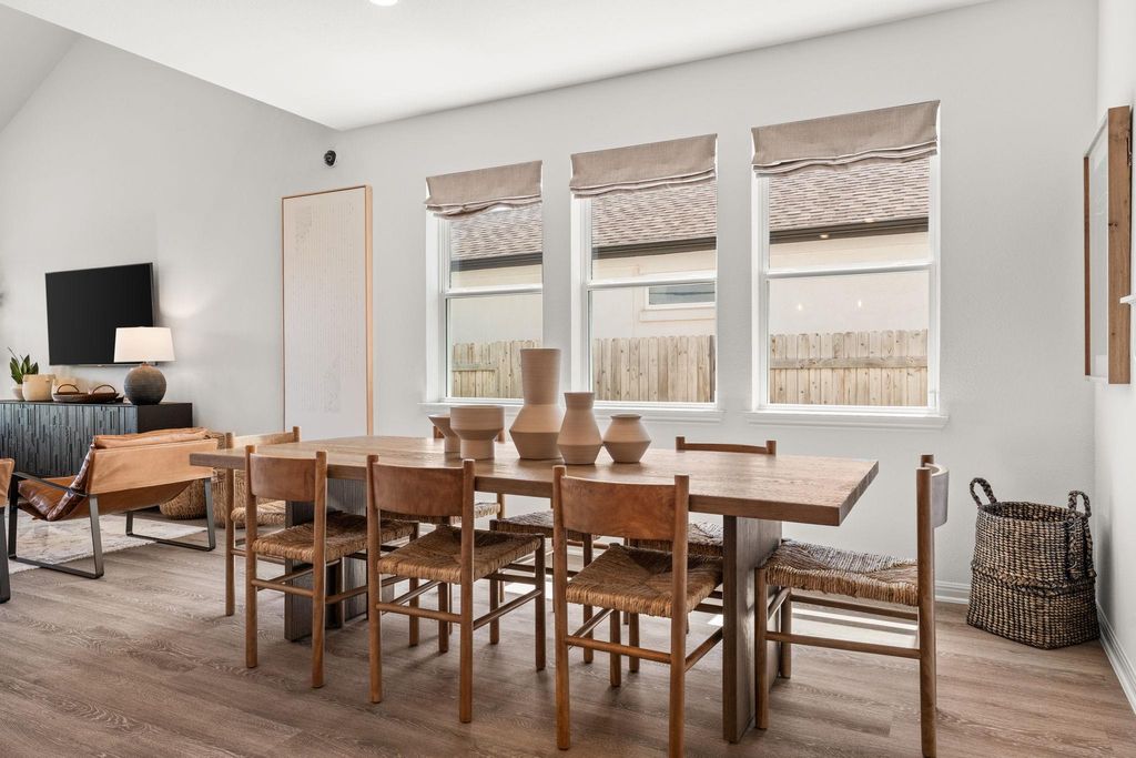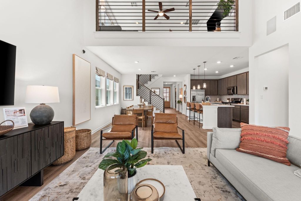 Showcasing a modern, classic design with timeless appeal, this Taylor Morrison model home in Turner's Crossing offers 2,267 square feet of well-planned living space with 3 bedrooms, 2.5 bathrooms, a home office, and an upstairs game room. Inside, the home reflects the quality and refinement, with elevated finishes and architectural enhancements throughout the home. Wide-plank wood flooring, upgraded lighting, and cohesive material selections create a clean, polished look. The open-concept living and dining areas flow naturally, offering a comfortable setting for everyday living and entertaining. The kitchen serves as a true centerpiece, designed with upgraded cabinetry, enhanced countertops, statement lighting, quality appliances, under-cabinet lighting, and a functional layout that balances visual appeal with everyday practicality. The primary suite is located on the main level, offering a private retreat separate from secondary living spaces. The bedroom is spacious and light-filled, while the ensuite bathroom features dual vanities, upgraded finishes, and a large walk-in shower for a refined, spa-inspired feel. A private office near the front of the home provides a quiet and functional work-from-home or study space. Upstairs, the game room offers flexible additional living space, ideal for a media room, play area, or casual lounge. The secondary bedrooms are well-proportioned and thoughtfully placed, maintaining separation from the primary suite below. Well-placed storage and linen closets are placed throughout, along with a dedicated laundry room and adjacent drop zone just off the garage. The main level also includes a conveniently located powder bath for guests and everyday use. The backyard features a spacious covered patio with a ceiling fan and recessed lighting for year-round comfort. Beyond the patio, the yard offers a well-maintained lawn framed by a wood privacy fence and fresh landscaping.