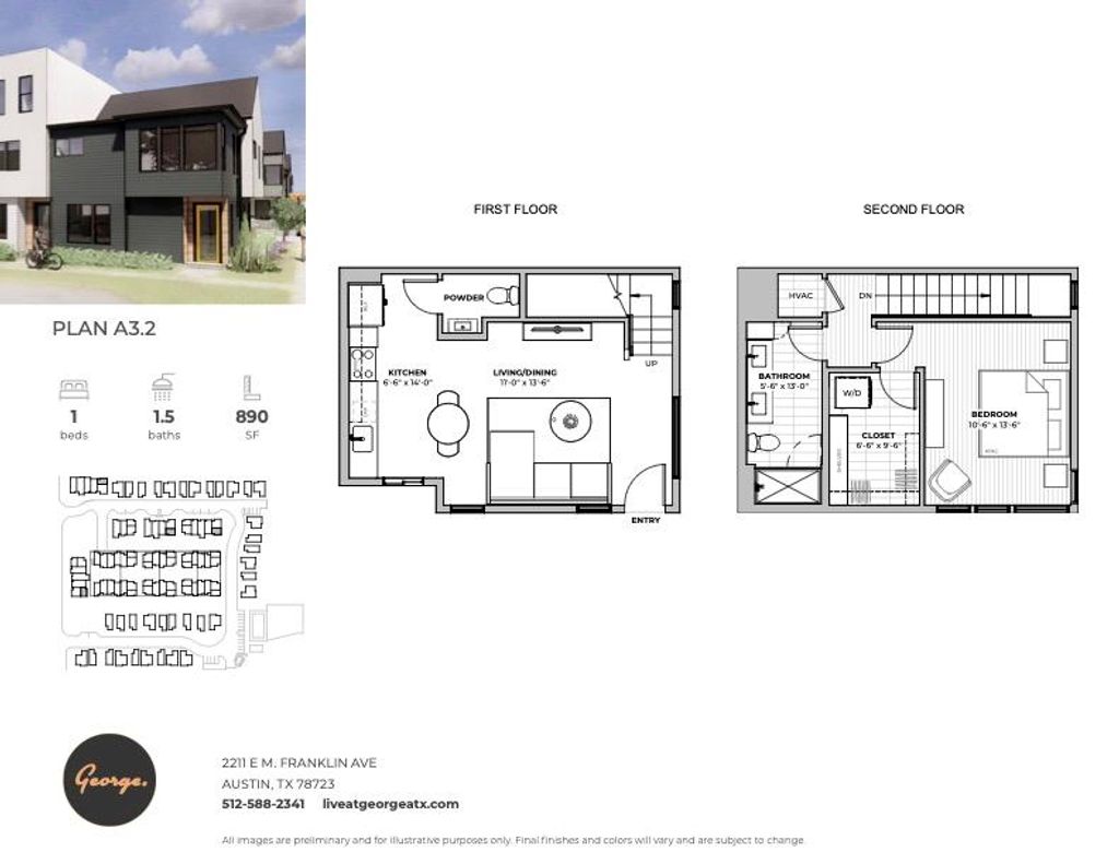 Brand new and beautifully designed, The George brings modern living to Central East Austin. Located on EM Franklin between MLK and Manor, this community is close to everything you love and everywhere you need to go. Now selling our townhomes, including the A3.2 floor plan, a thoughtfully designed 1-bedroom, 1.5-bath townhome offering 890 square feet of bright, well-planned living space. Every residence at The George comes with premium features such as solar panels, spray-foam insulation, a tankless water heater, a whole-home dehumidifier, and Bosch kitchen appliances. The community also offers a pool, walking paths, and select homes with private yards or patios. Townhomes are under construction with closings expected to begin in Q1 2026; tours are available by appointment with our sales team.