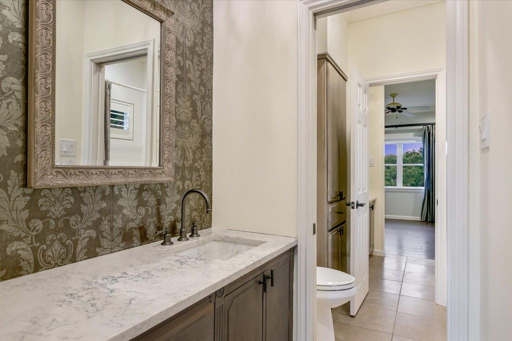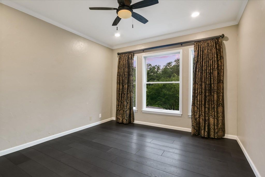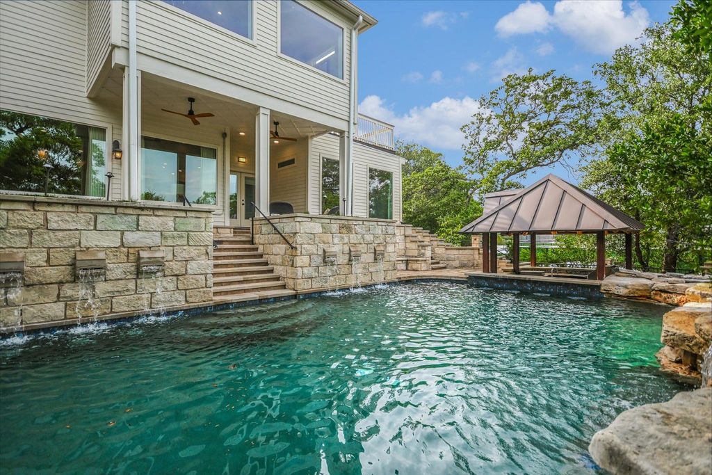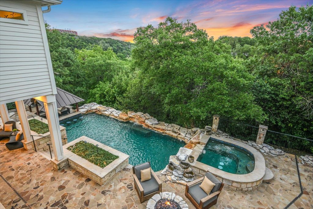Stunning, resort-style outdoor living in desirable Barton Hills. Perched high above Barton Creek, the back yard has been transformed into a terraced wonderland for swimming, lounging and entertaining. Floating in the stone-surrounded pool which overlooks the lush creek valley feels like bathing in nature. Outfitted with all the amenities, the pool has a volleyball setup, waterfall, hot tub and even a swim-up bar. Serve drinks in the outdoor kitchen pavilion where you can also grill up dinner for your guests. Surrounding the water, a stone patio features a seating area and fire pit. Located 1.6 paved miles from Zilker Park, your home can be the hub for ACL events or exploring the new restaurants popping up along Barton Springs Road. If you're feeling adventurous, you could even trek down the street to a Barton Creek Greenbelt trailhead. The Lady Bird Lake Trail and downtown are walking or biking distance as well. The interior offers plenty of space to start the party, with two large, window-lined living areas overlooking the terrace, pool and lush valley below; a double-sided fireplace warms both rooms. Guests can stop for a drink at the convenient step-in bar on their way outside. The large skylit kitchen is outfitted with Viking appliances and plenty of storage. Adjacent to the kitchen, a large hobby or playroom provides additional space for life's messier pursuits and can be shut off for privacy. The main floor also includes a formal dining room and an office/bedroom with a closet and full bath. A dramatic curved staircase rises to the upper level, where two bedrooms share a Jack-and-Jill bath. The striking primary suite has been doubled from its original proportions, adding a large, windowed sitting area overlooking the valley. An equally large deck is accessible off the primary bedroom and offers an incredible view of the UT tower and a glimpse of downtown. The updated bath features a custom-tile steam shower, soaking tub & walk-in closet.